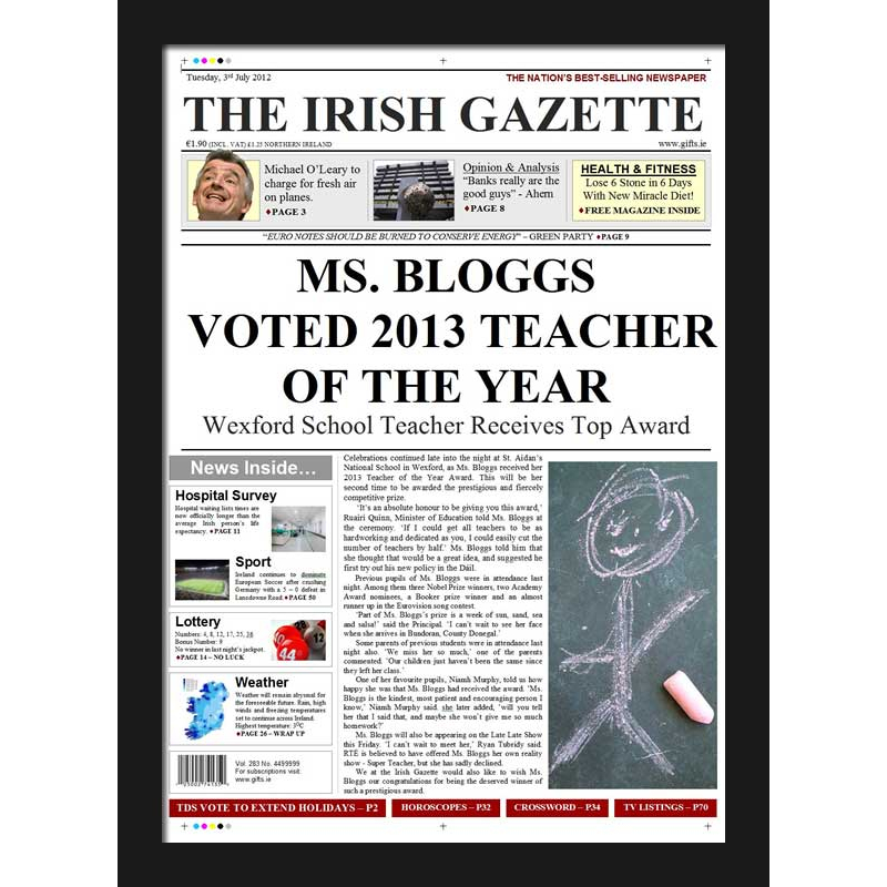 ‘It’s an absolute honour to be giving you this award', Norma Foley, Minister of Education told Ms. Bloggs at the ceremony. ‘If I could get all teachers to be as hardworking and dedicated as you, I could easily cut the number of teachers by half.’ Ms. Bloggs told the minister that she thought that would be a great idea, and suggested she first try out her new policy in the Dáil.
