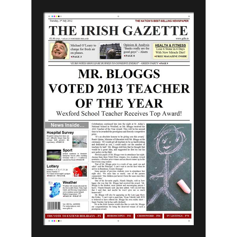 One of his favourite pupils, Niamh Murphy, told us how happy she was that Mr. Bloggs had received the award. ‘Mr. Bloggs is the kindest, most patient and encouraging person I know,’ Niamh Murphy said. she later added, ‘will you tell him that I said that, and maybe he won’t give me so much homework?’