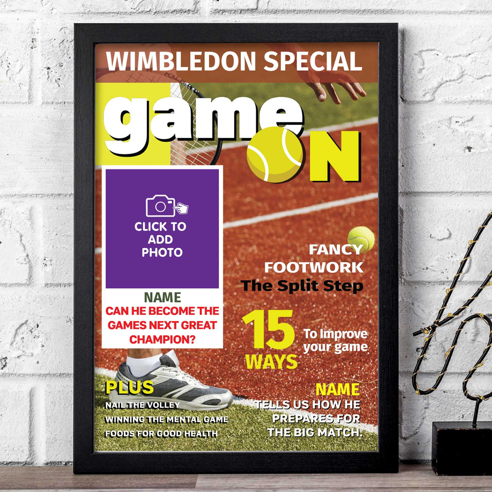 Celebrate your favourite tennis enthusiast with this custom magazine-style poster, featuring their name and photo on a vibrant Wimbledon-themed cover. A fun, sporty gift idea for players, coaches, or fans – perfect for birthdays, Father’s Day, or tournament celebrations. Add a personal touch and serve up the ultimate tennis keepsake!