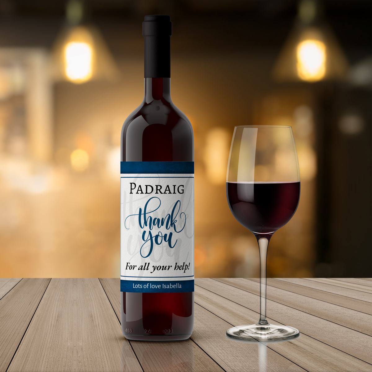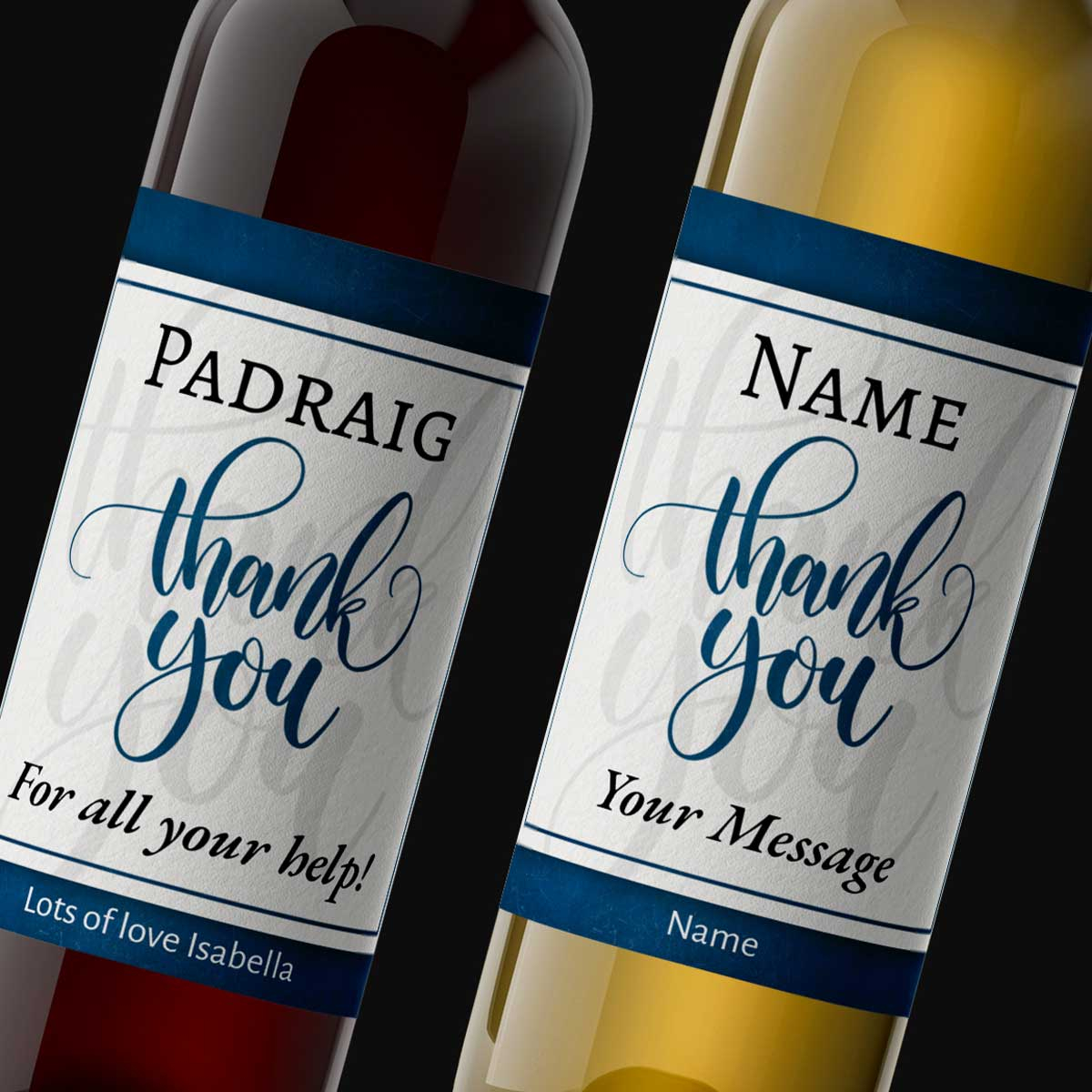 This novel bottle of personalised wine is truly a great gift to say Thank You! Simply complete the details and we'll have the wine label custom printed with your personalised details.