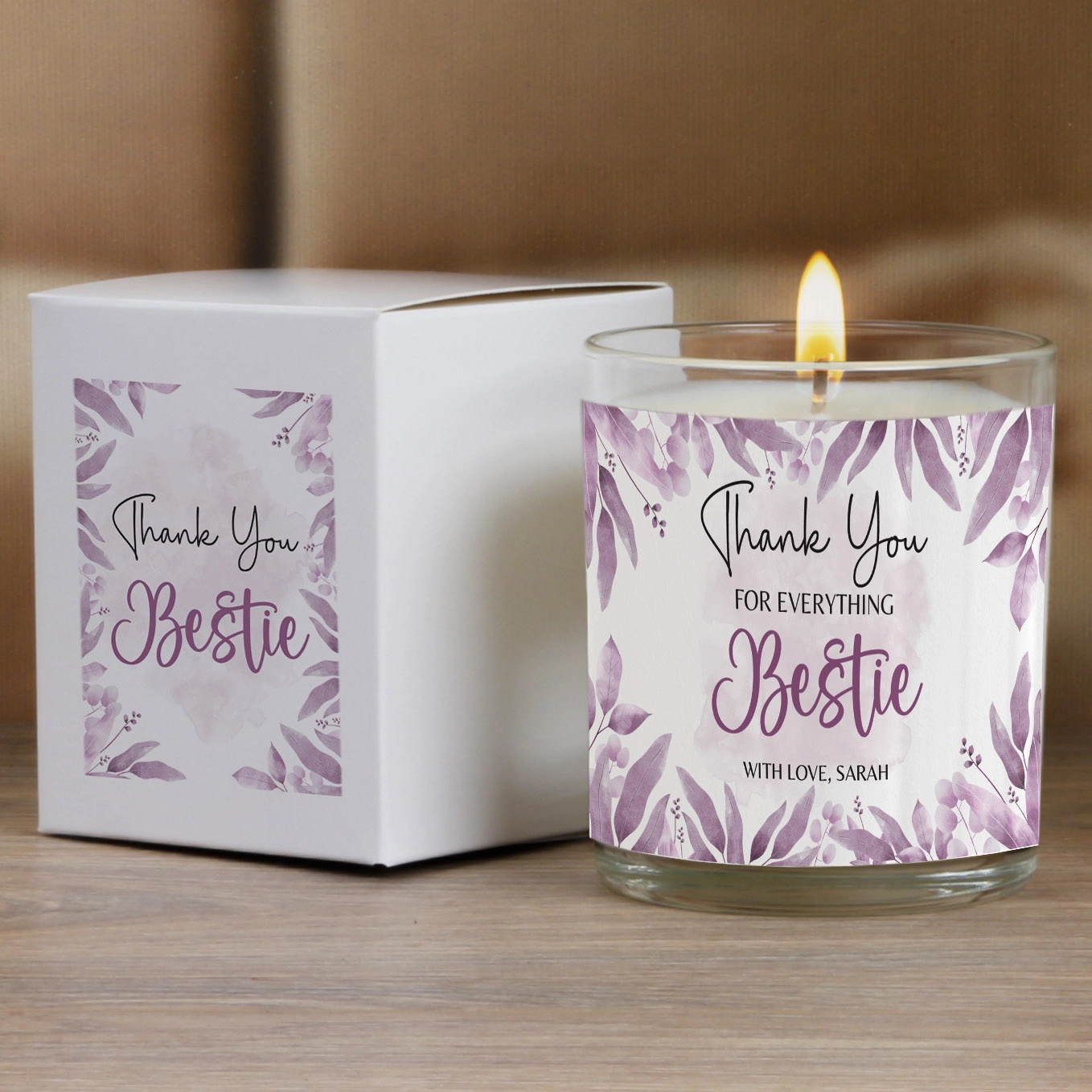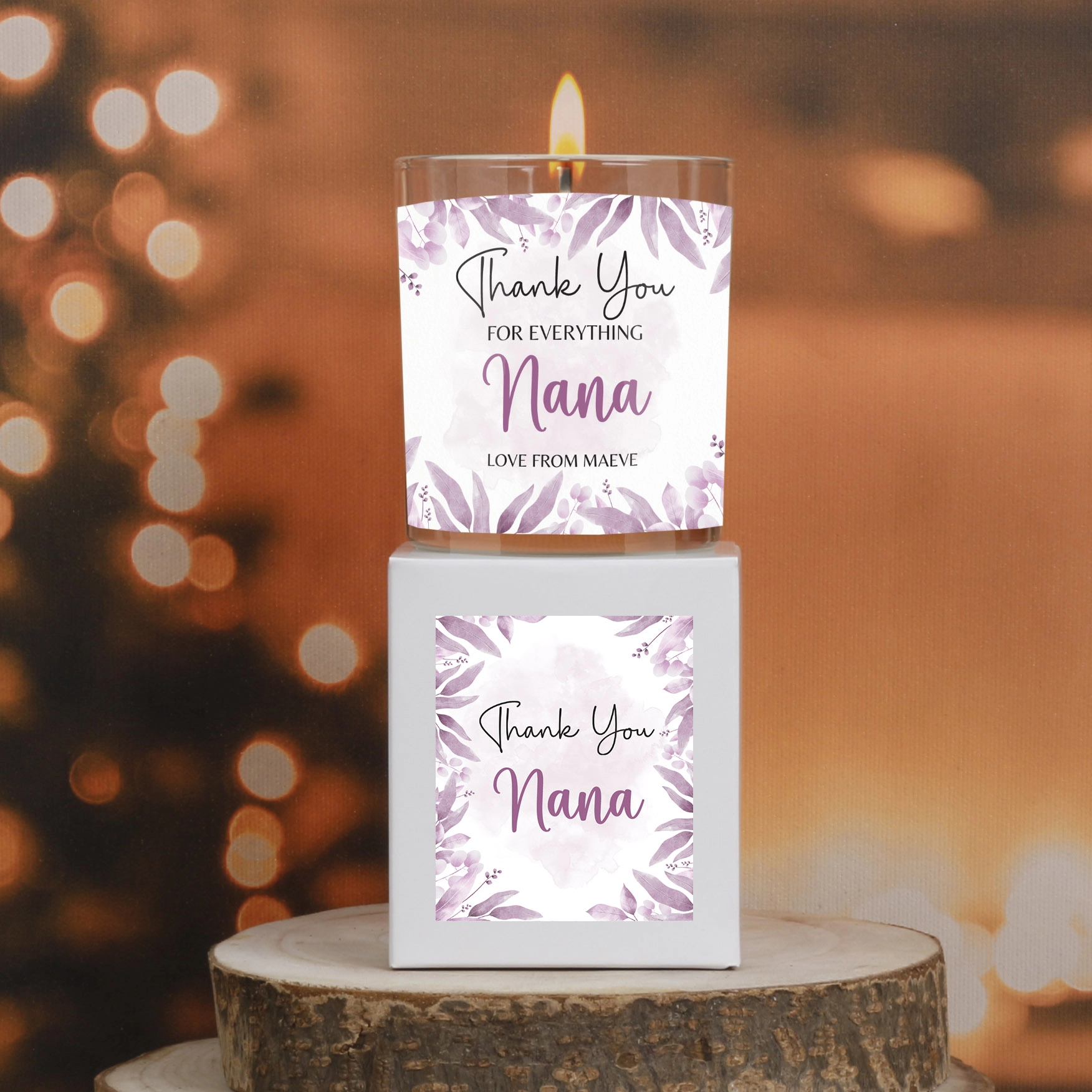 Customise the adhesive labels by choosing your picture, adding any text, designing in any colour for the candle label, and selecting any colour and text for the box label.