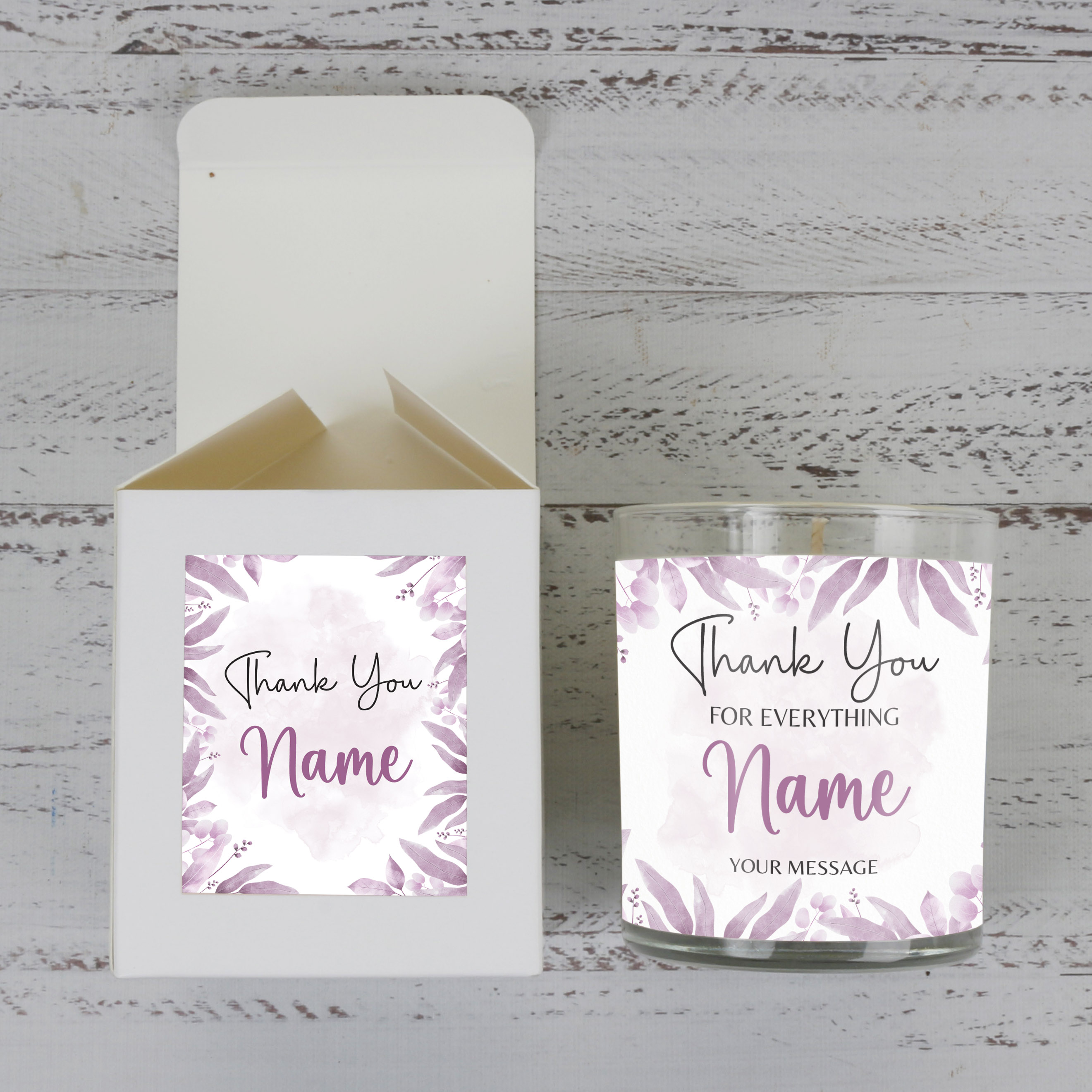 Customise the adhesive labels by choosing your picture, adding any text, designing in any colour for the candle label, and selecting any colour and text for the box label.