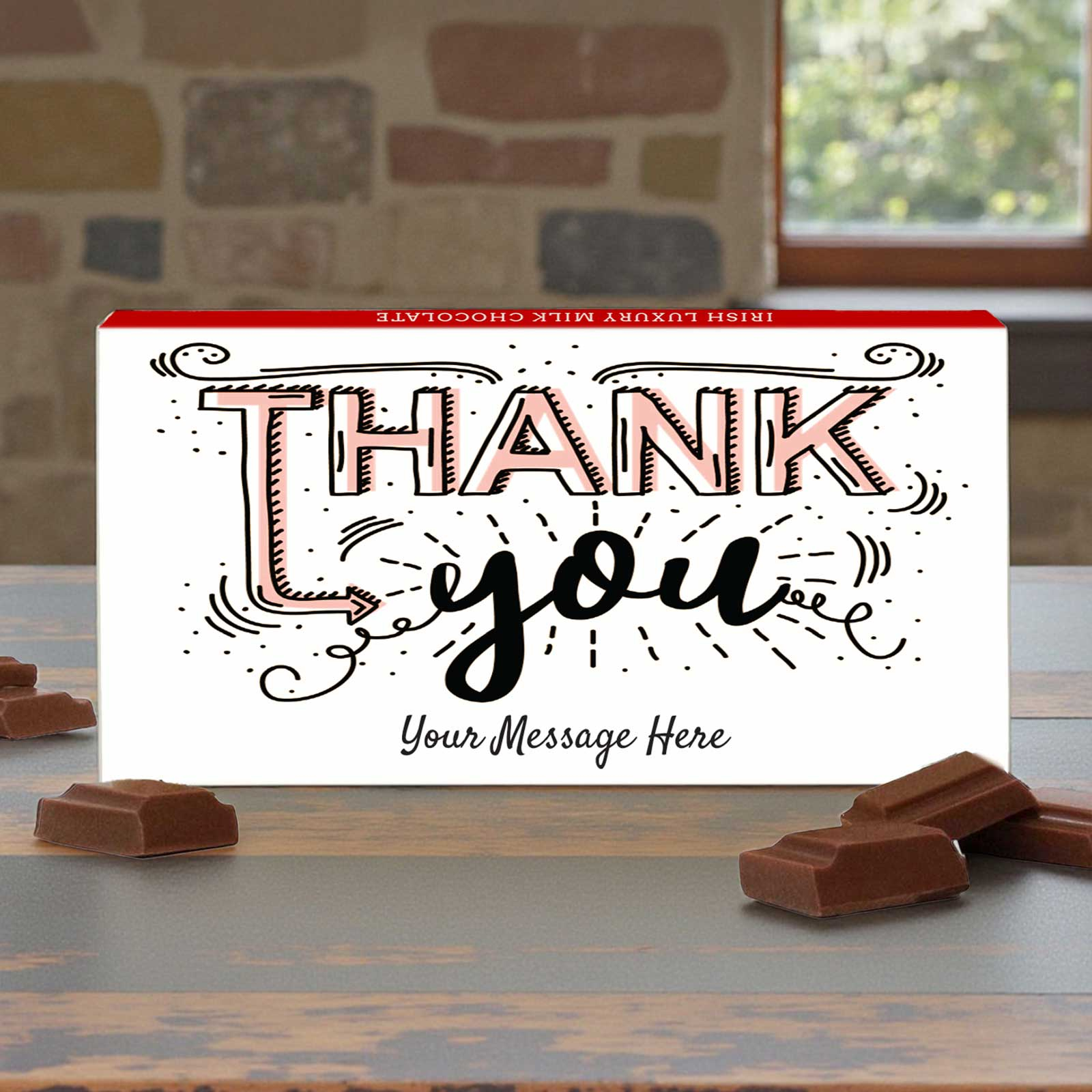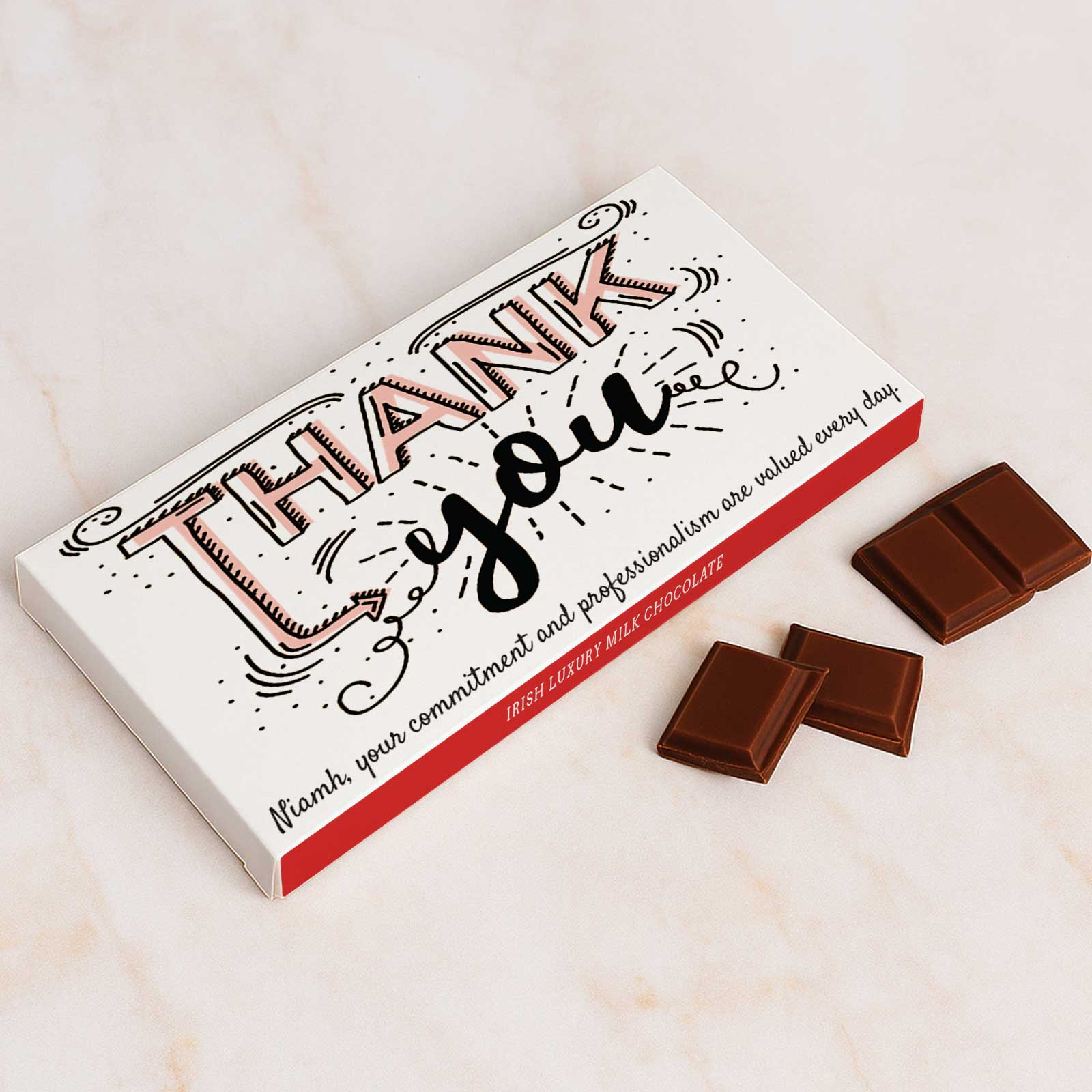 Show your appreciation in the sweetest way with our Thank You Personalised Chocolate Bar 90g. This delightful milk chocolate bar combines rich, creamy Irish luxury chocolate with a personalised message to make your gift truly unique and heartfelt.