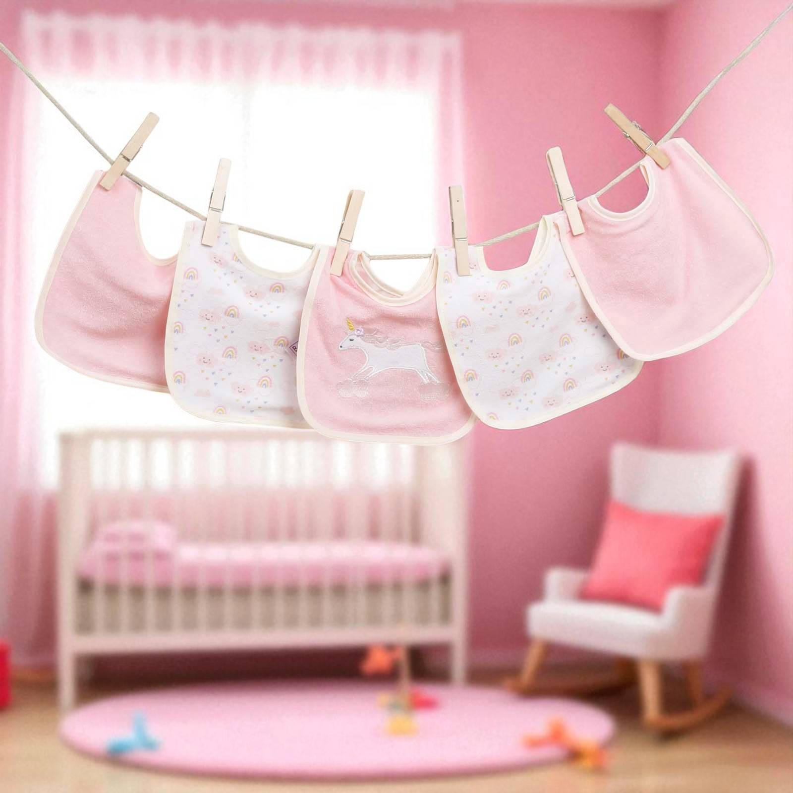 - A practical five-piece Unicorn Baby Bib set—perfect for keeping mealtimes mess-free in delightful style.