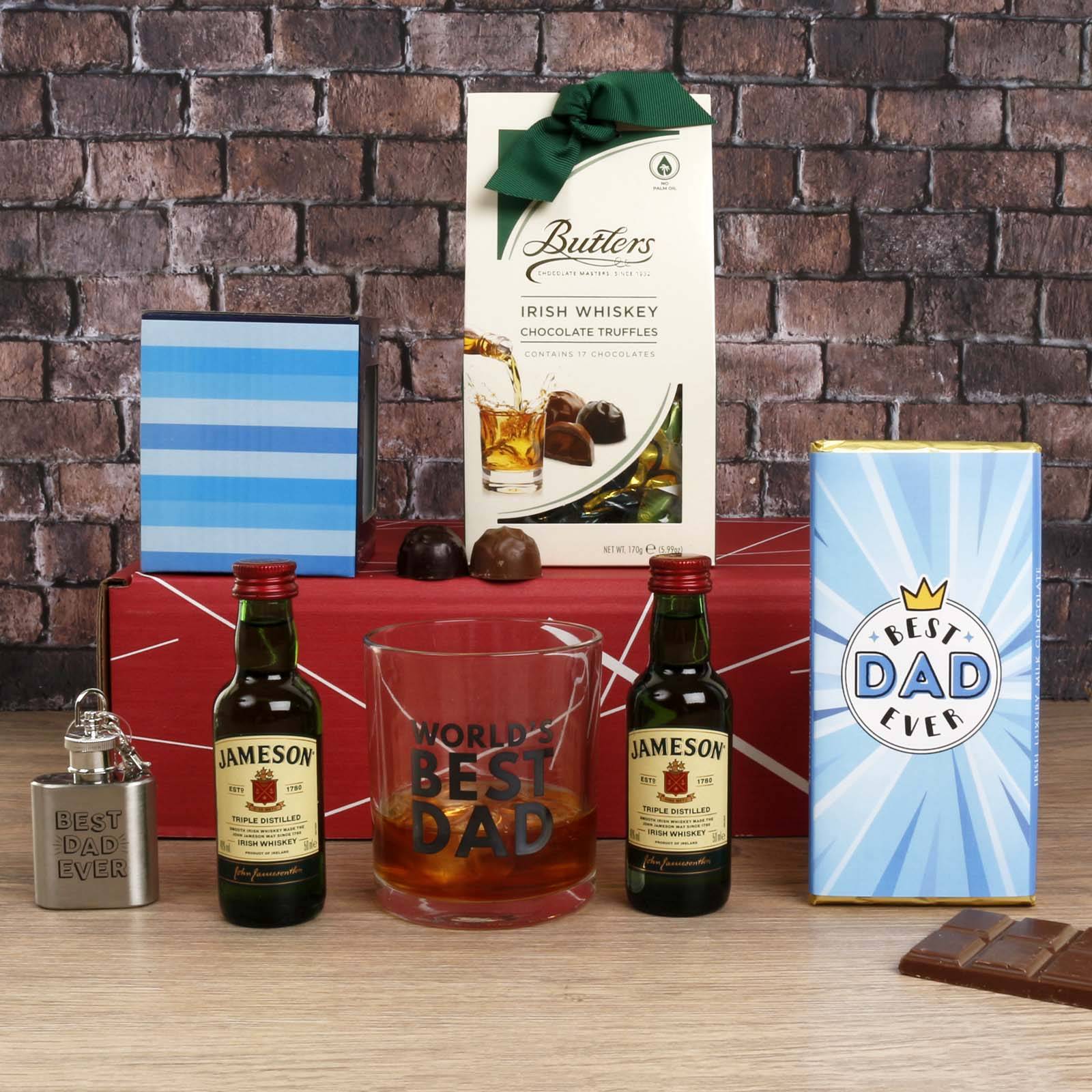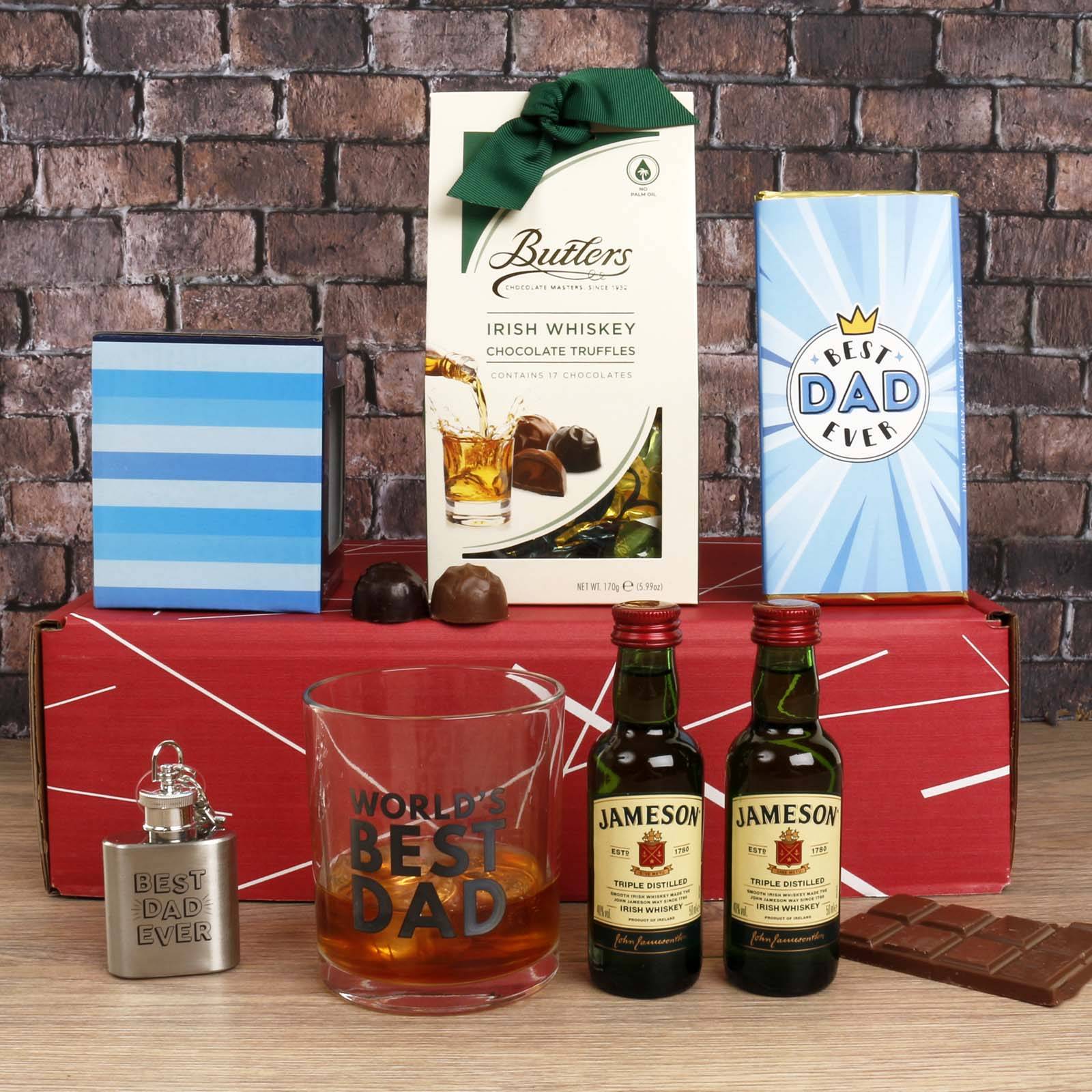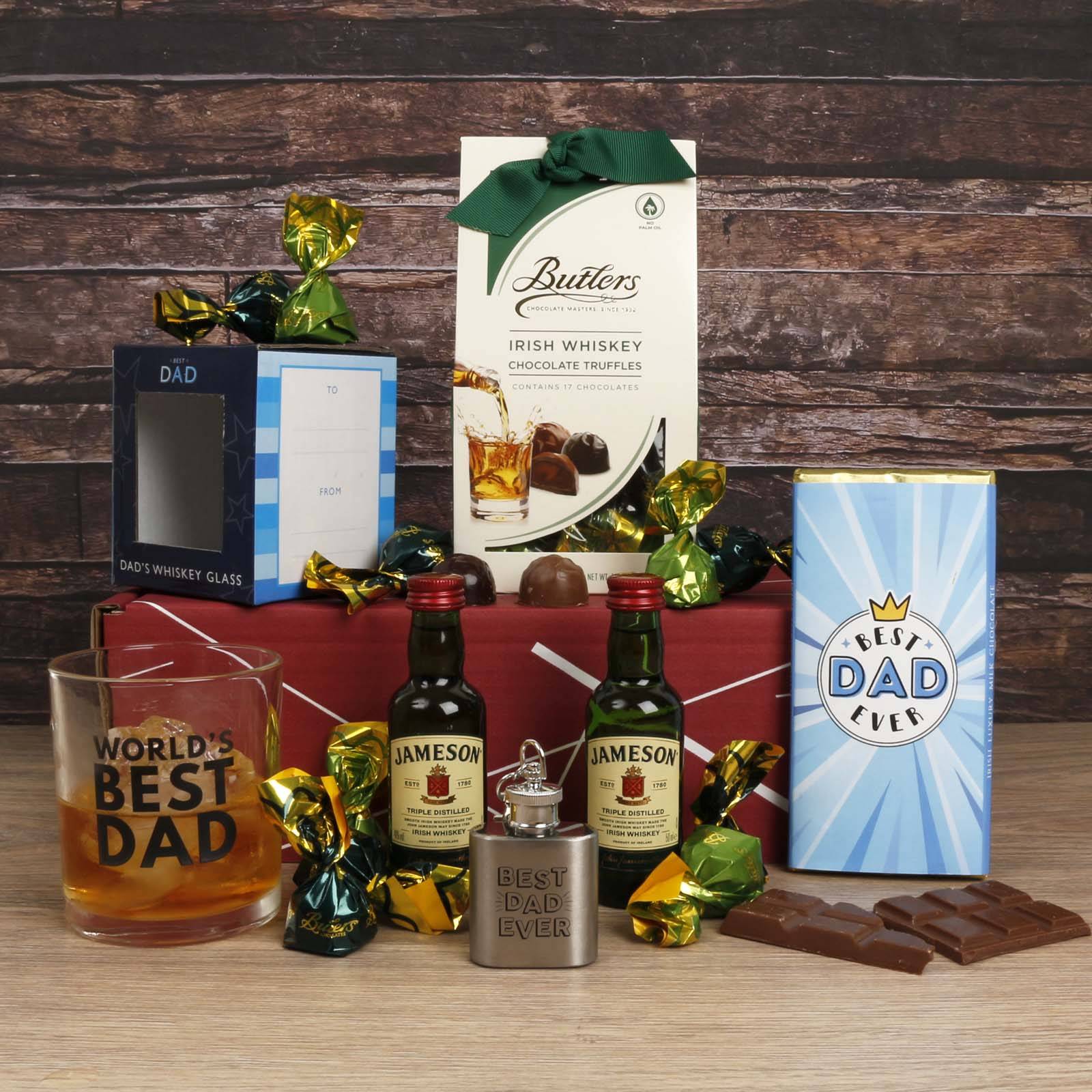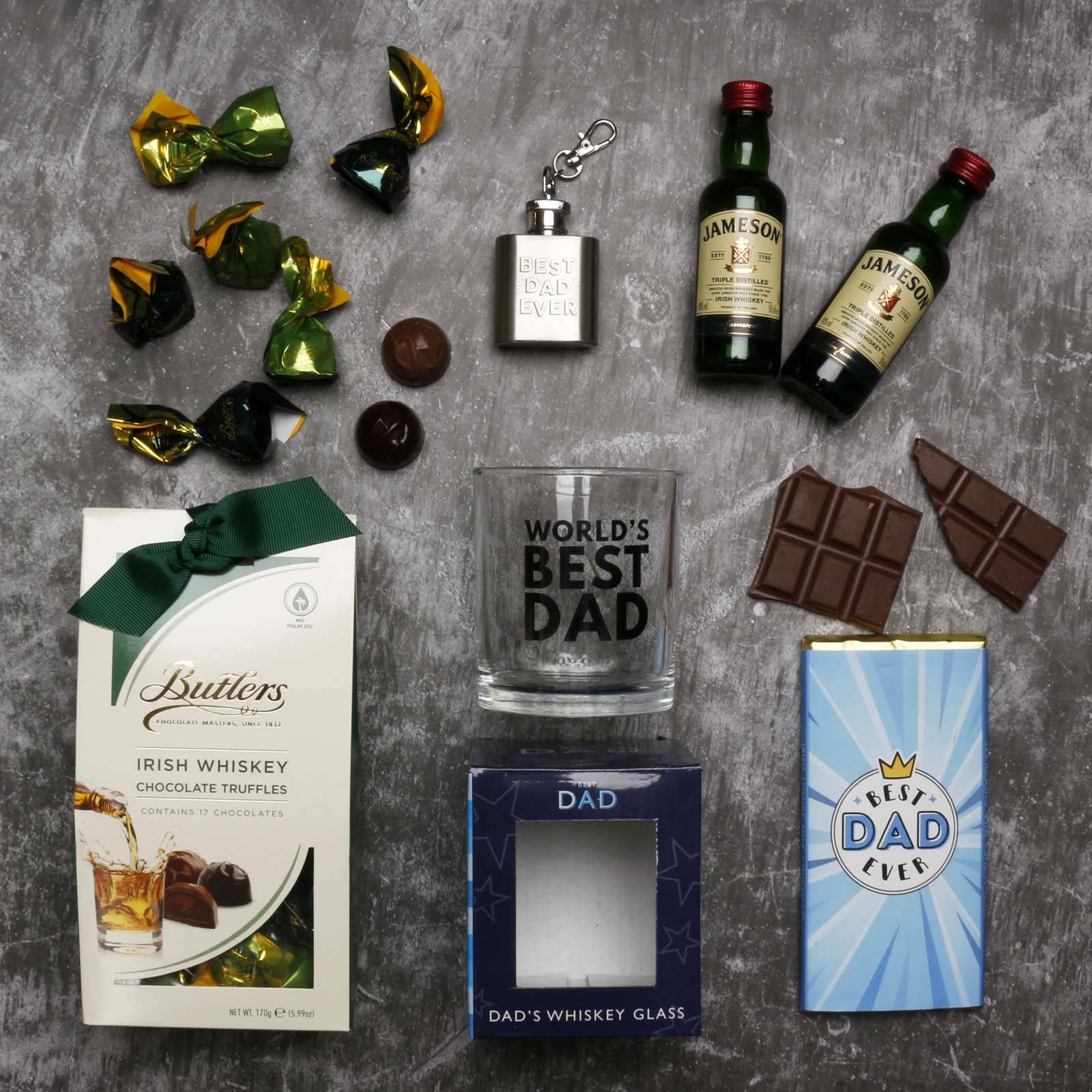 To complete the package, the hamper also includes a World's Best Dad or Dad's Measure whiskey glass, Best Dad or Dad's Fuel keyring hip flask and a delicious Best Dad Ever chocolate bar from the Chocolate Garden.