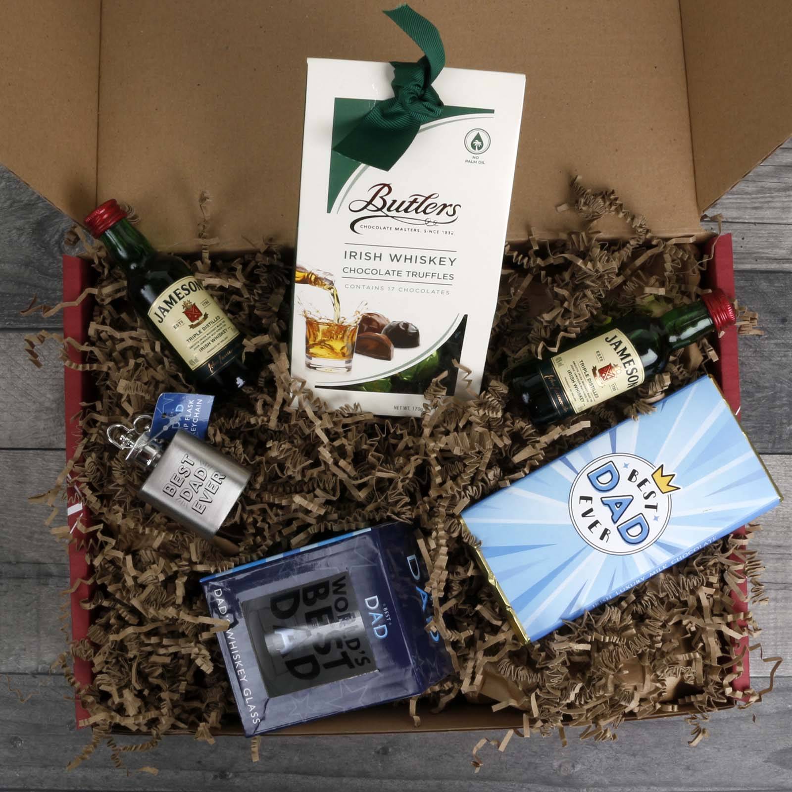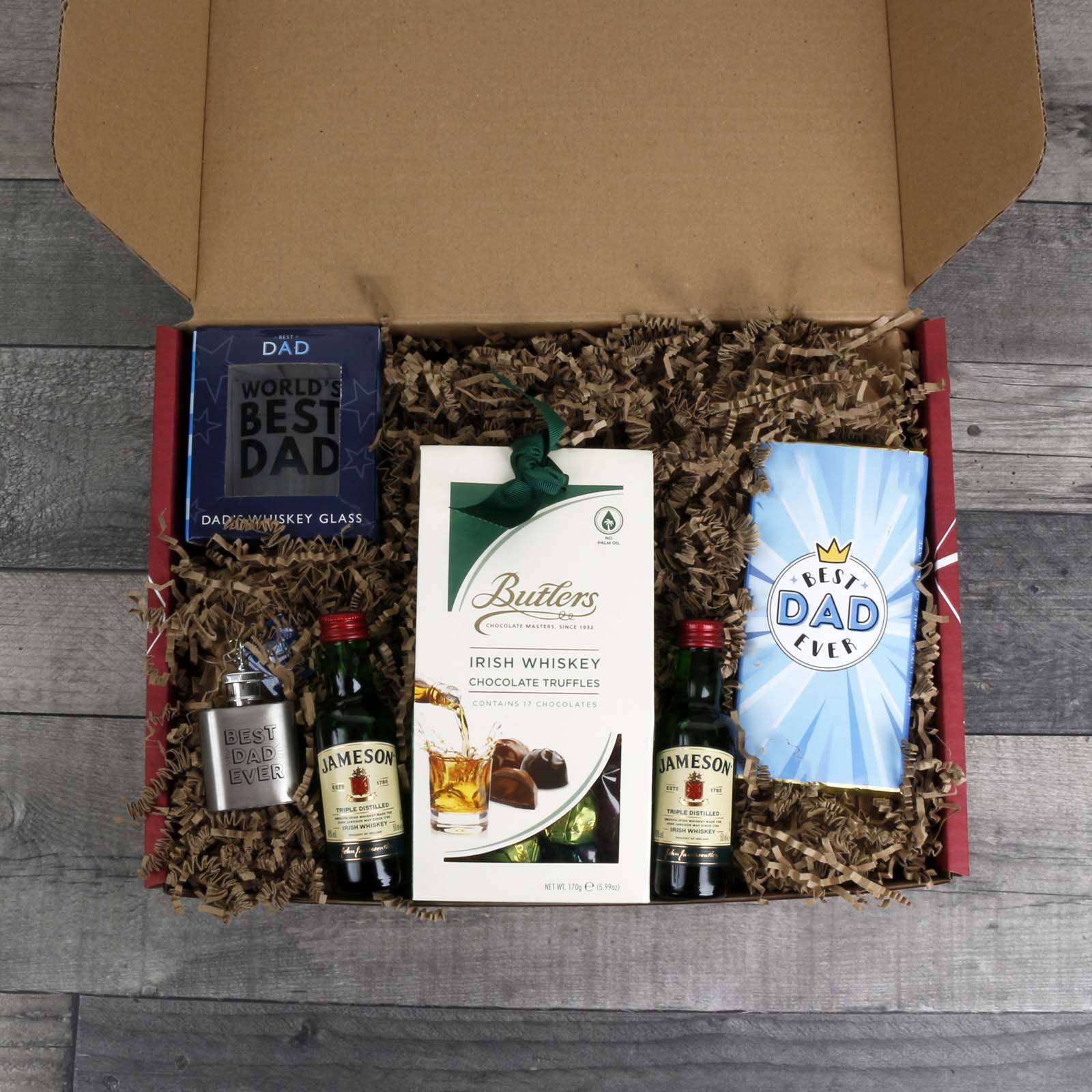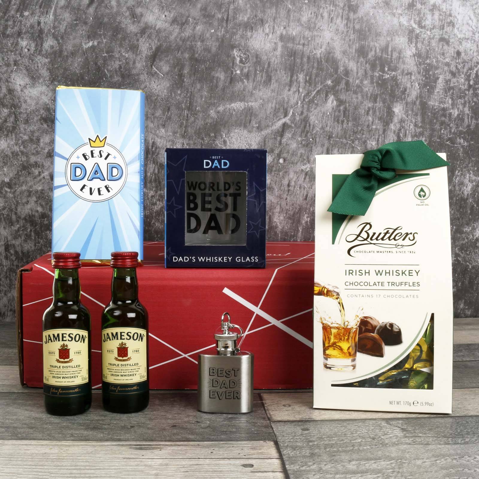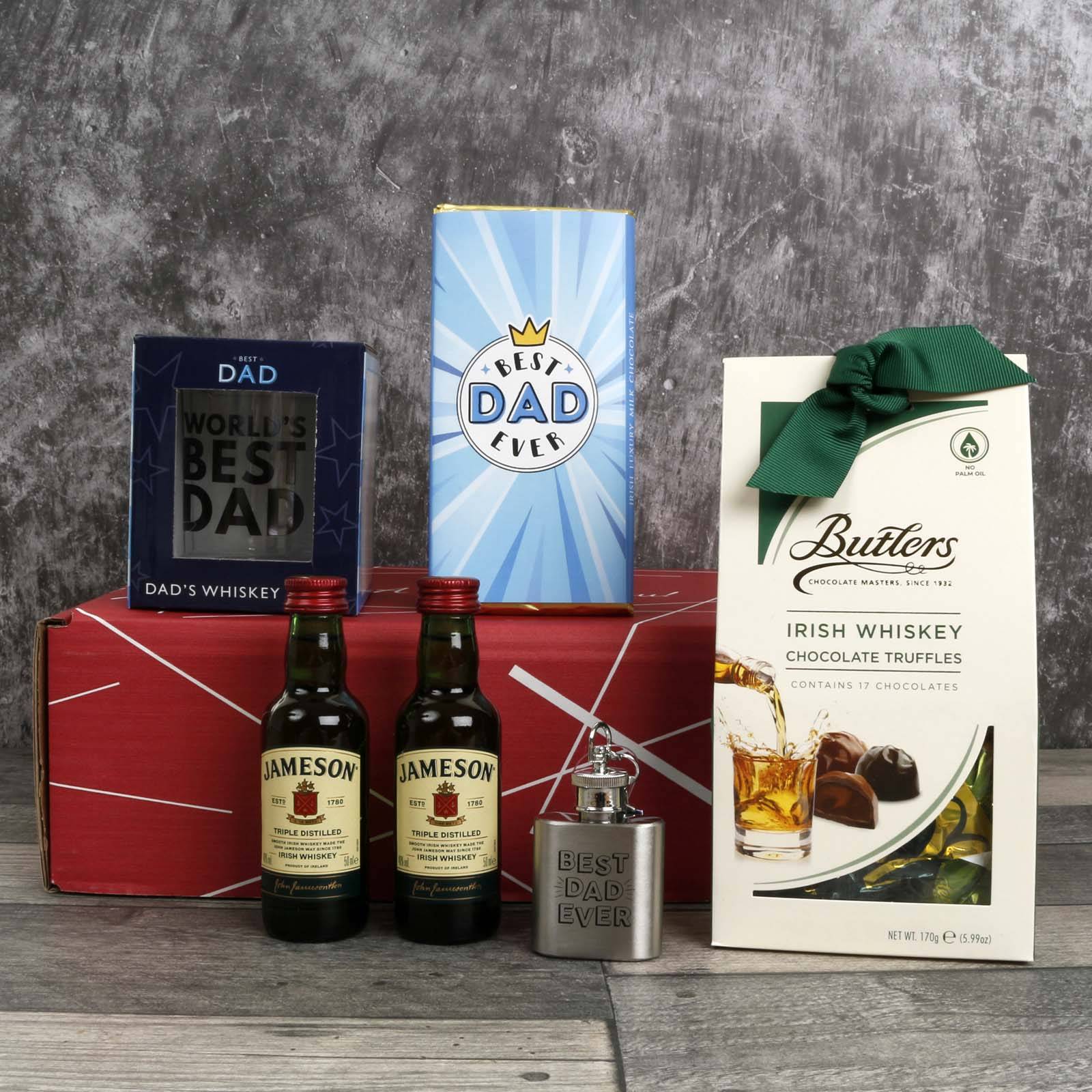 To complete the package, the hamper also includes a World's Best Dad or Dad's Measure whiskey glass, Best Dad or Dad's Fuel keyring hip flask and a delicious Best Dad Ever chocolate bar from the Chocolate Garden.