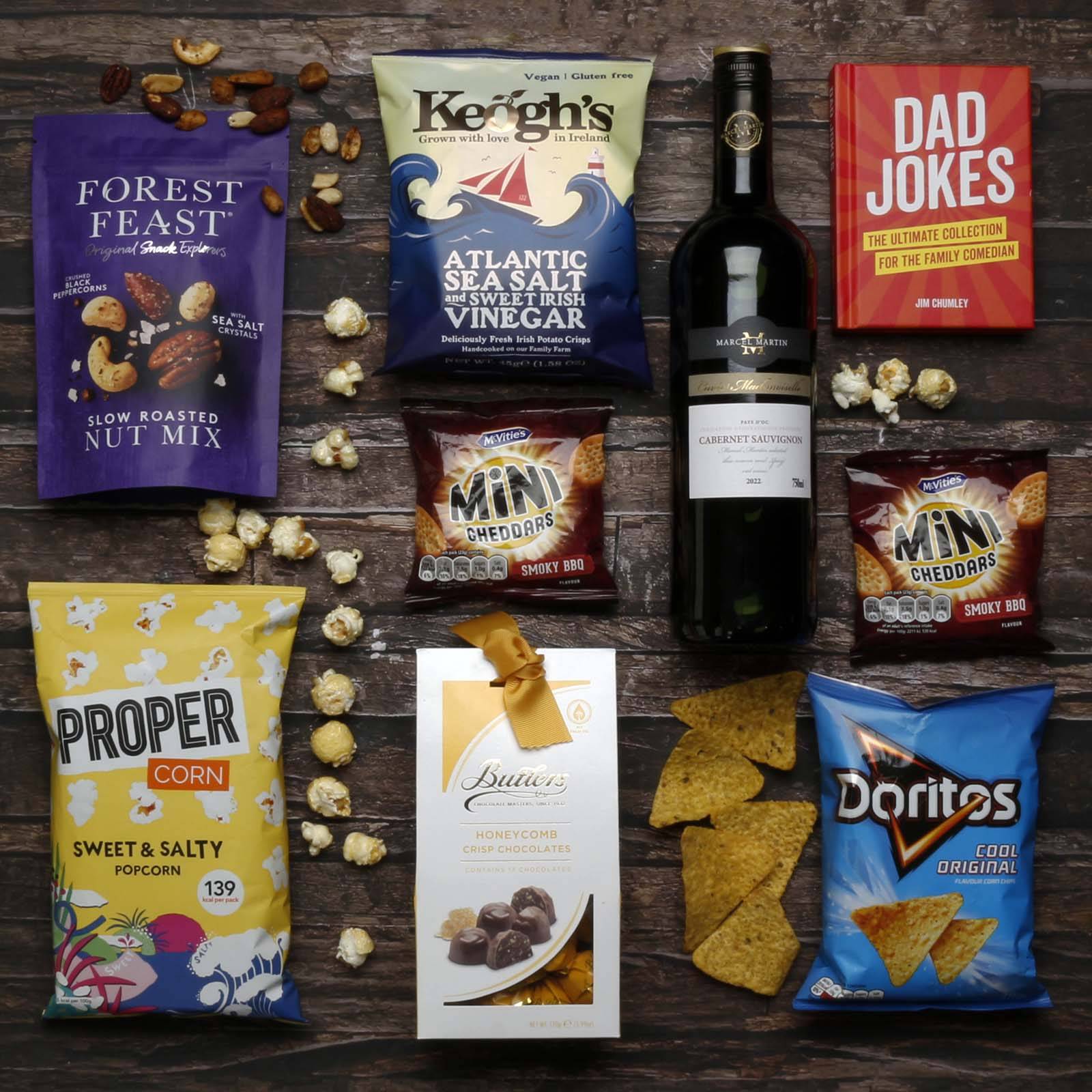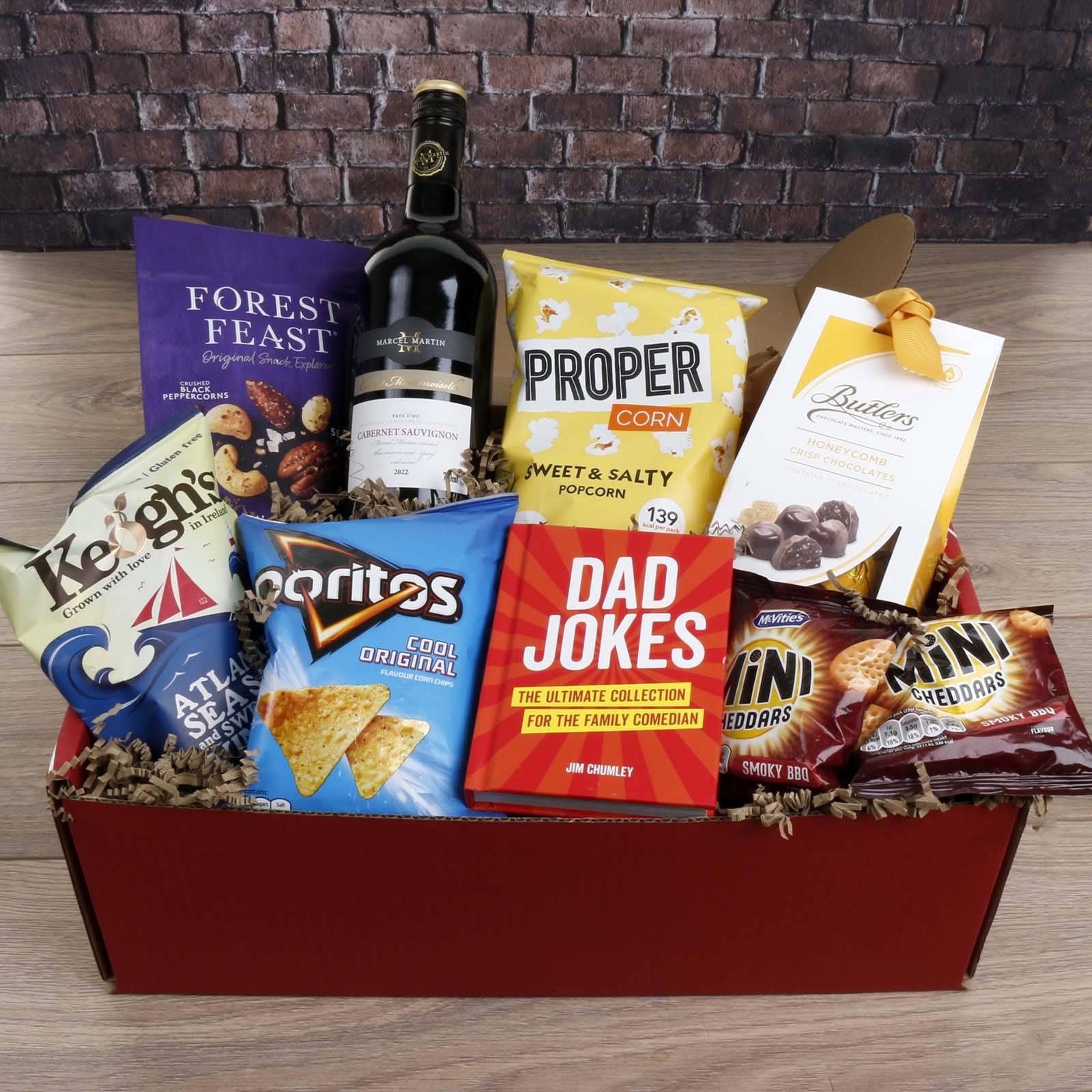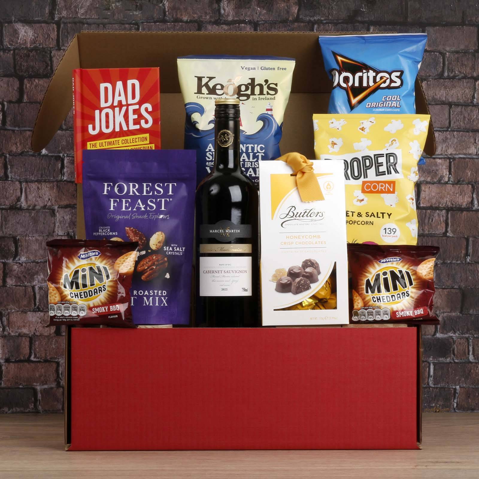 Here's a description of what the "Best Dad Wine & Nibbles Gift Box" has to offer: