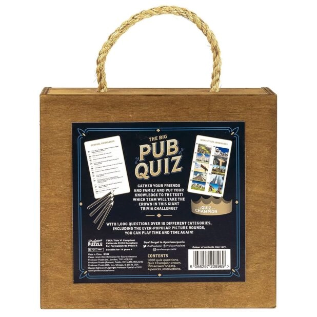 - Beautiful Presentation: All questions are neatly stored in a stunning wooden box that adds a classic pub-style feel to your quiz night, making it an attractive addition to any game collection.