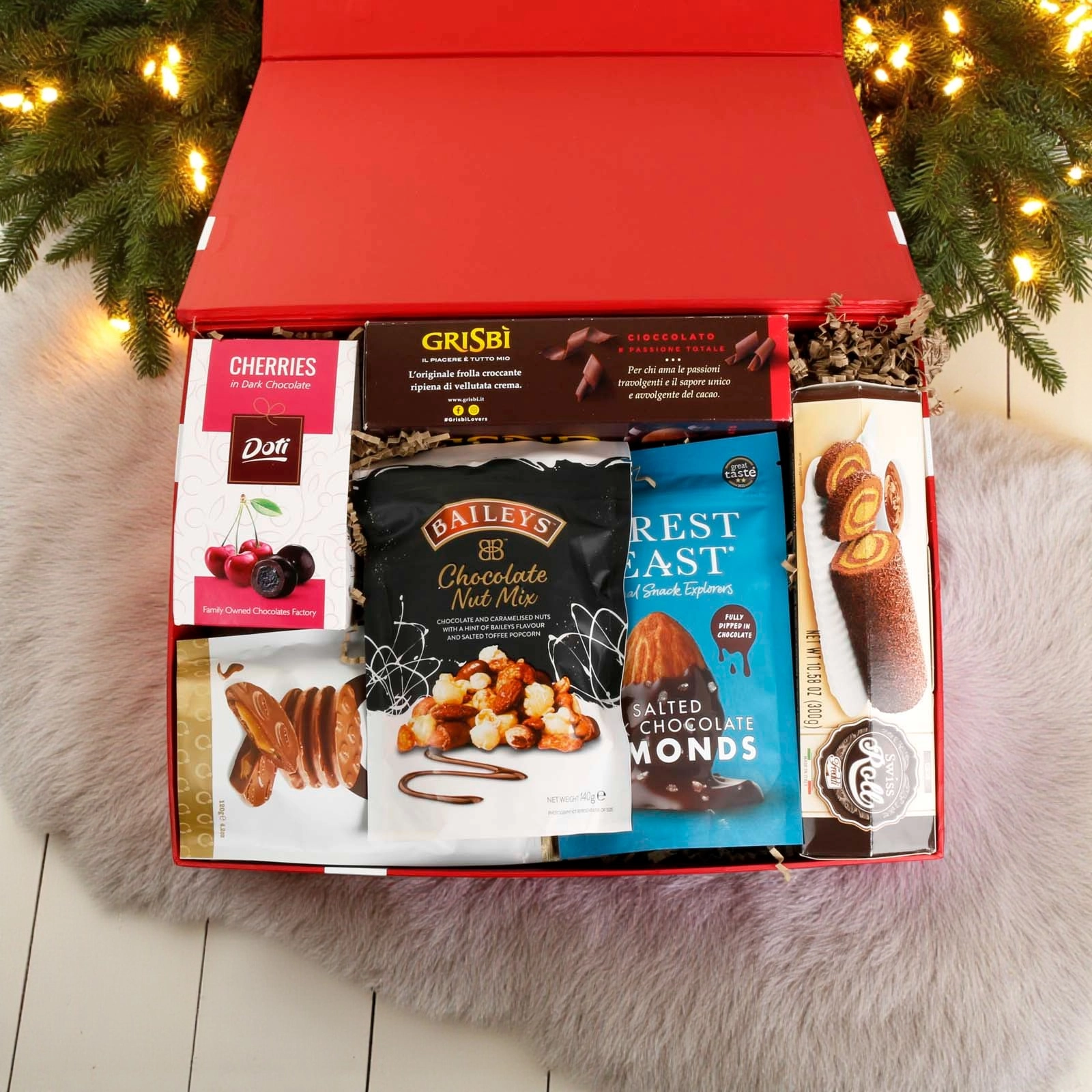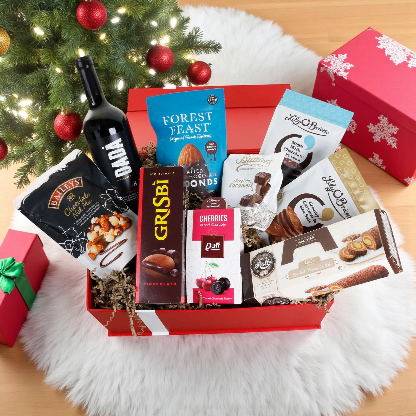 The hamper is presented in our new luxury red gift box with satin bow. Stylish and reusable, the gift box is packed inside a separate shipping box for secure transport.