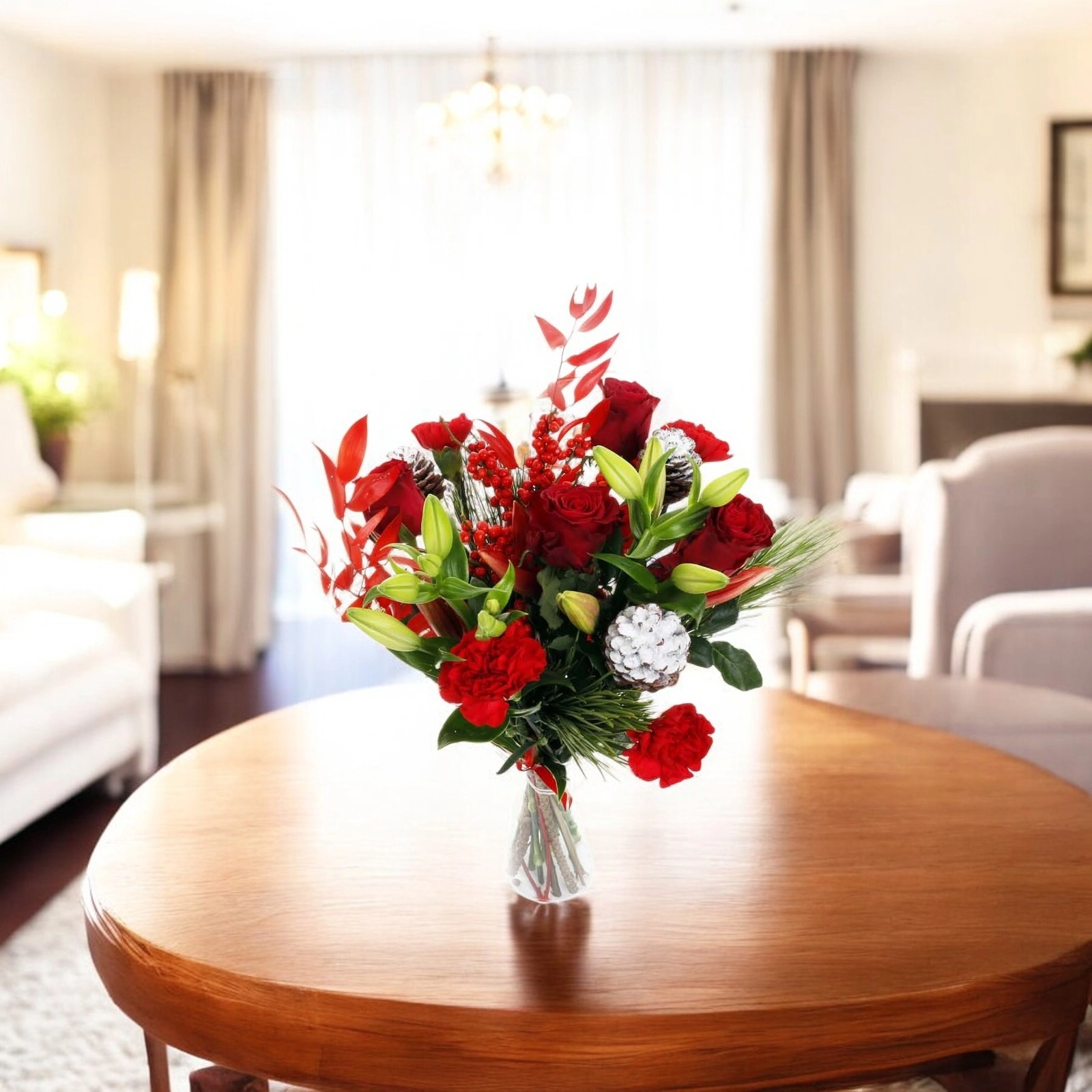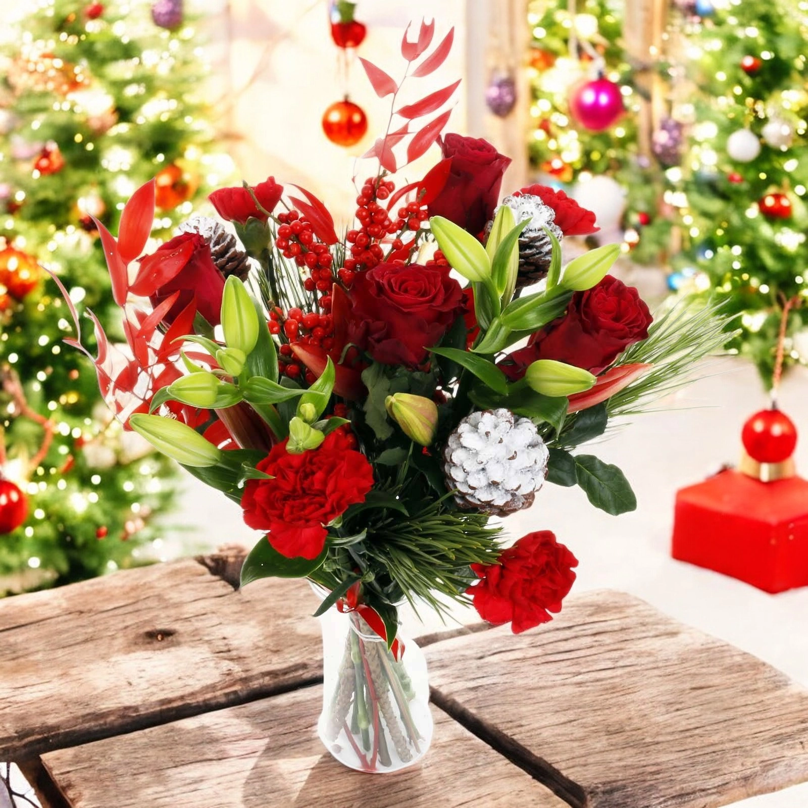 Introducing this radiant and stunning flower arrangement that brings the enchantment of the Christmas season to life.