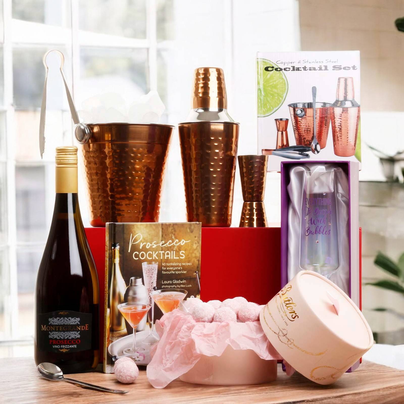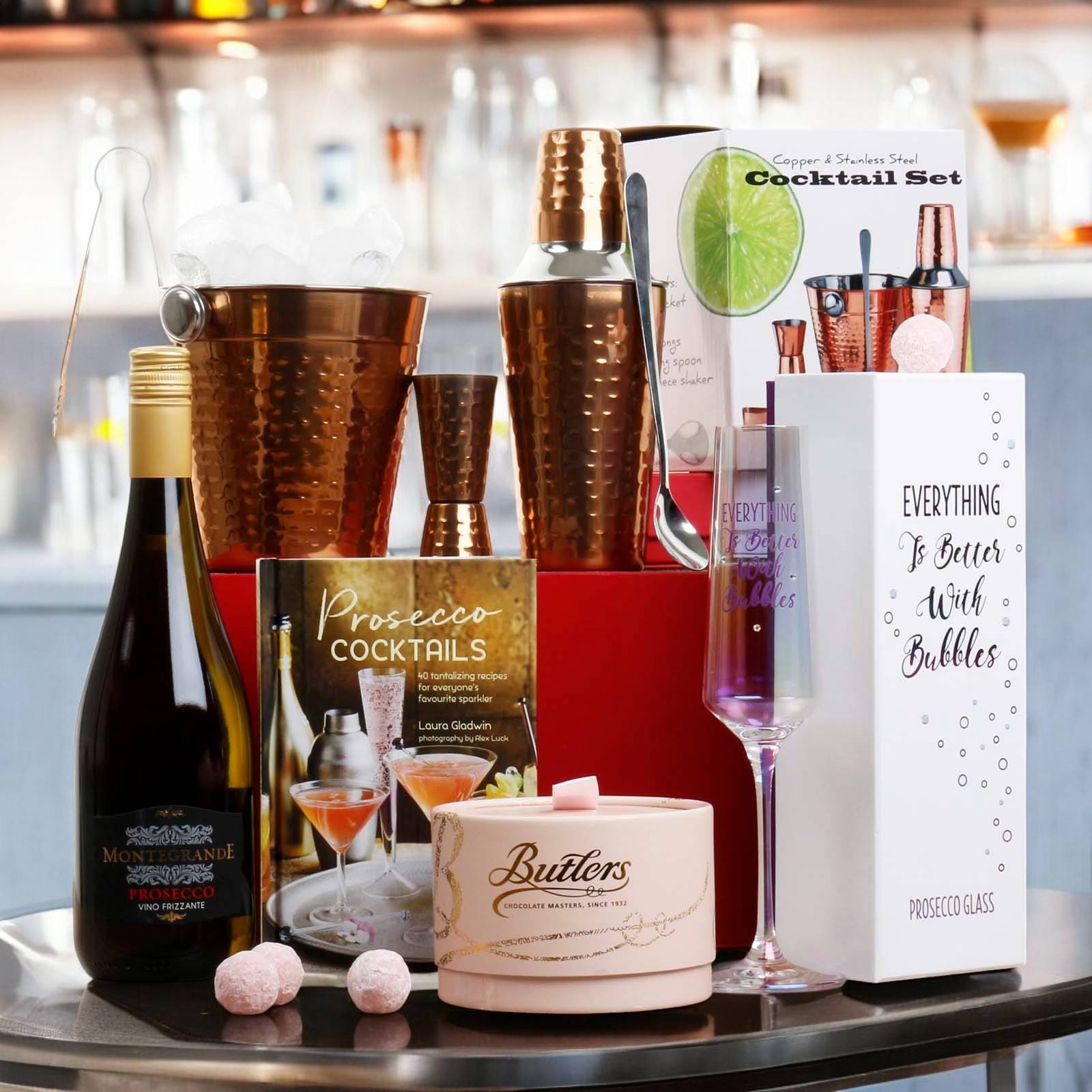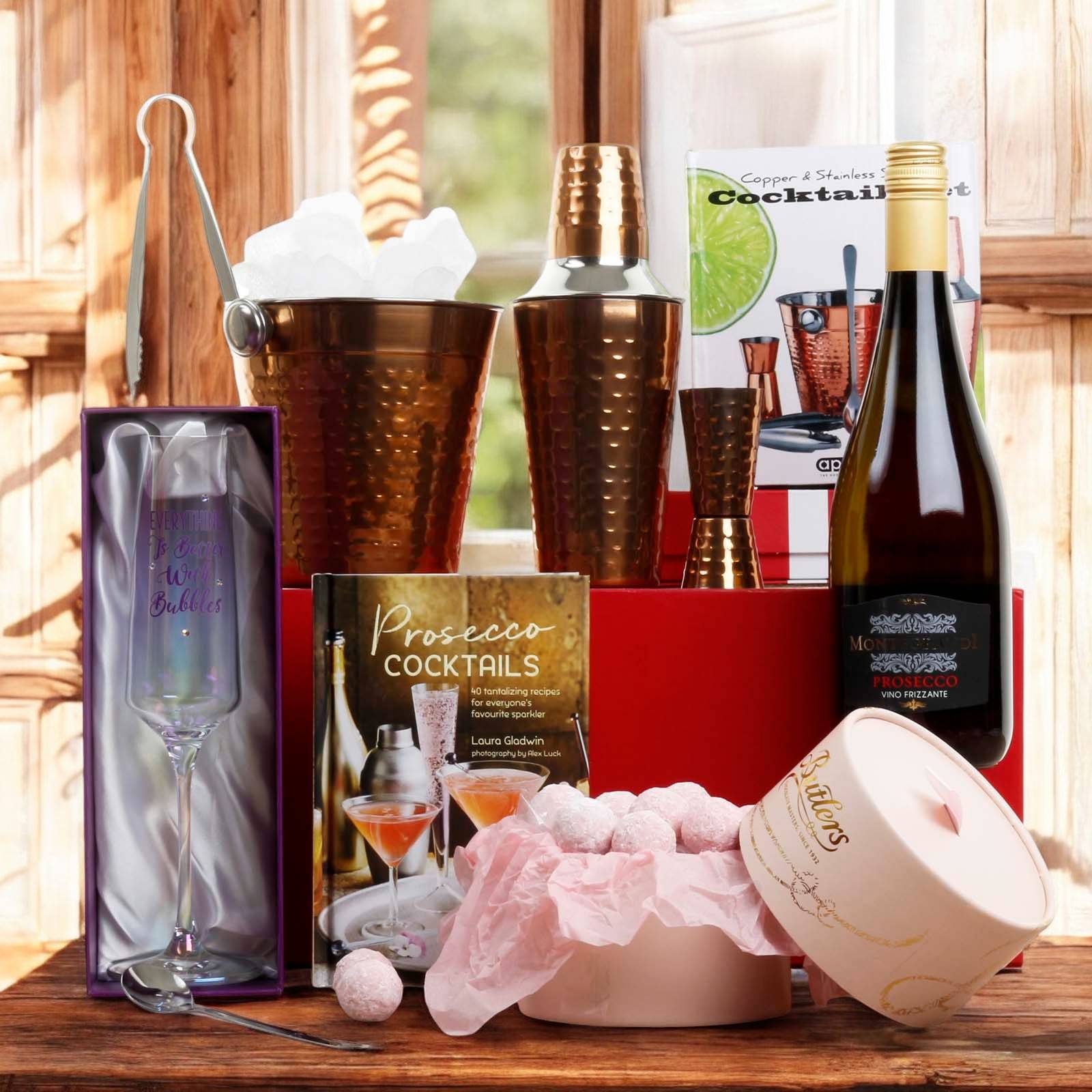 This luxurious hamper is a perfect gift for cocktail enthusiasts and those who appreciate a touch of elegance. It features a premium cocktail set for crafting your favorite drinks, paired with an insightful cocktail book to inspire new creations. A bottle of crisp Prosecco adds a sparkling touch to any occasion, complemented by a stylish Prosecco glass for the ultimate drinking experience.