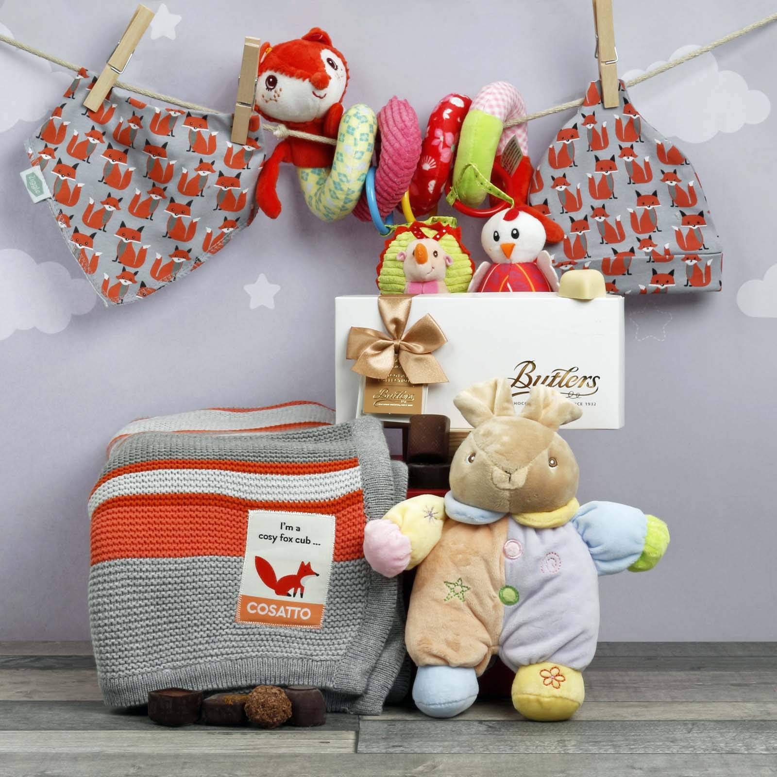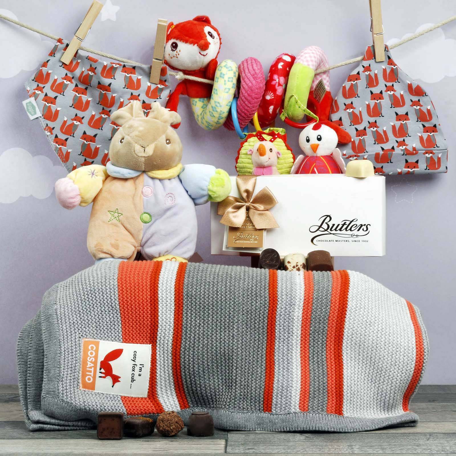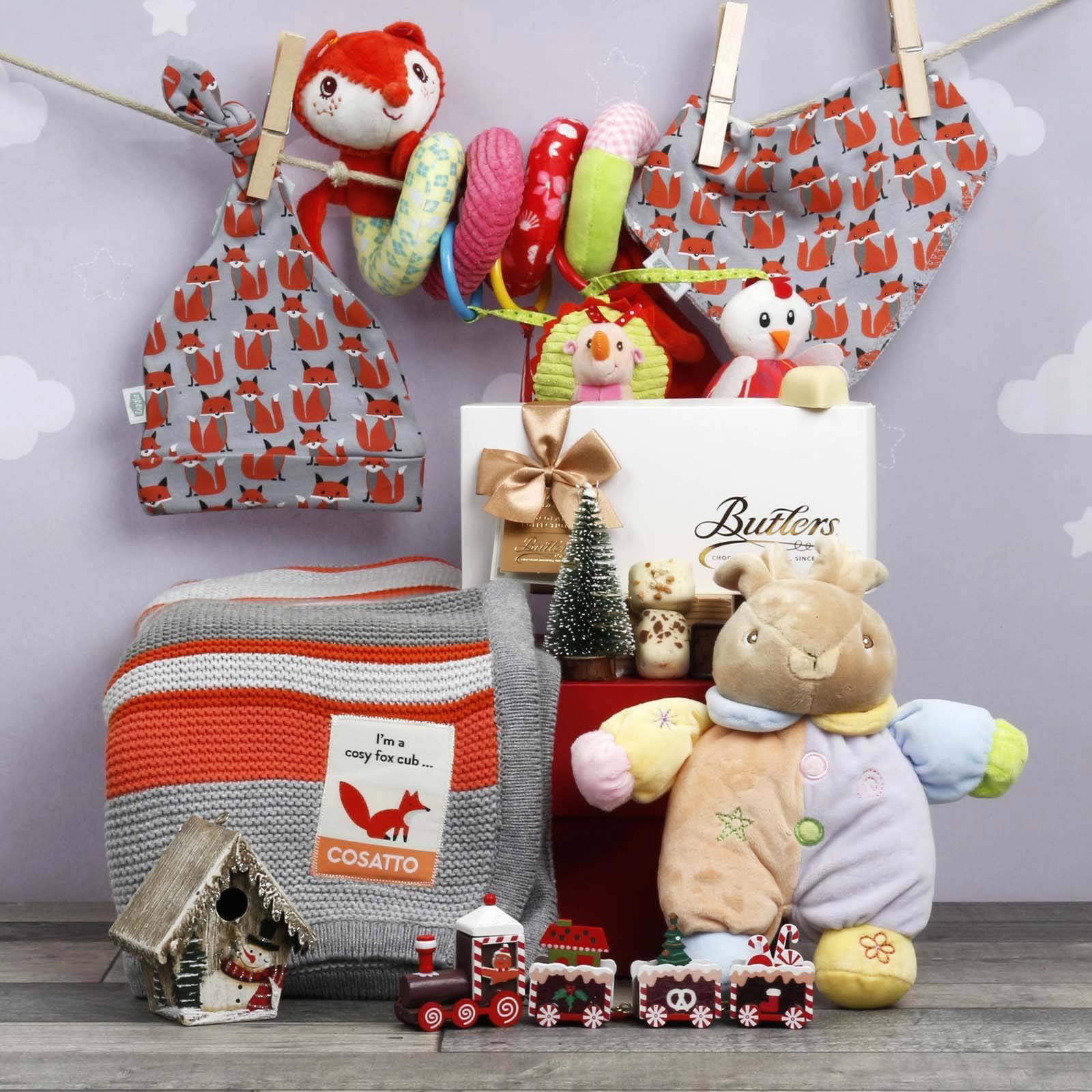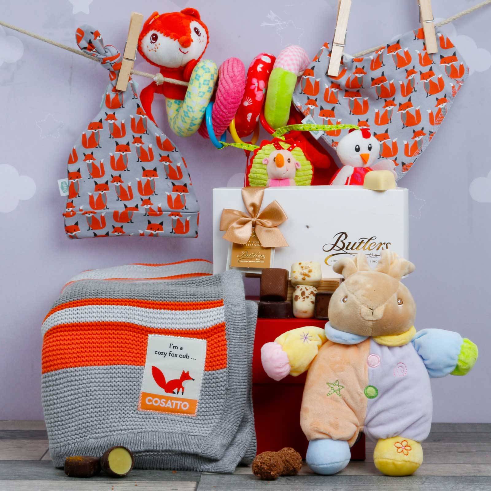 "This charming baby hamper is the perfect bundle of joy for a little one and their doting parents. It features a carefully curated selection of items designed to provide comfort, warmth, and entertainment for the baby, as well as a sweet treat for the grown-ups.