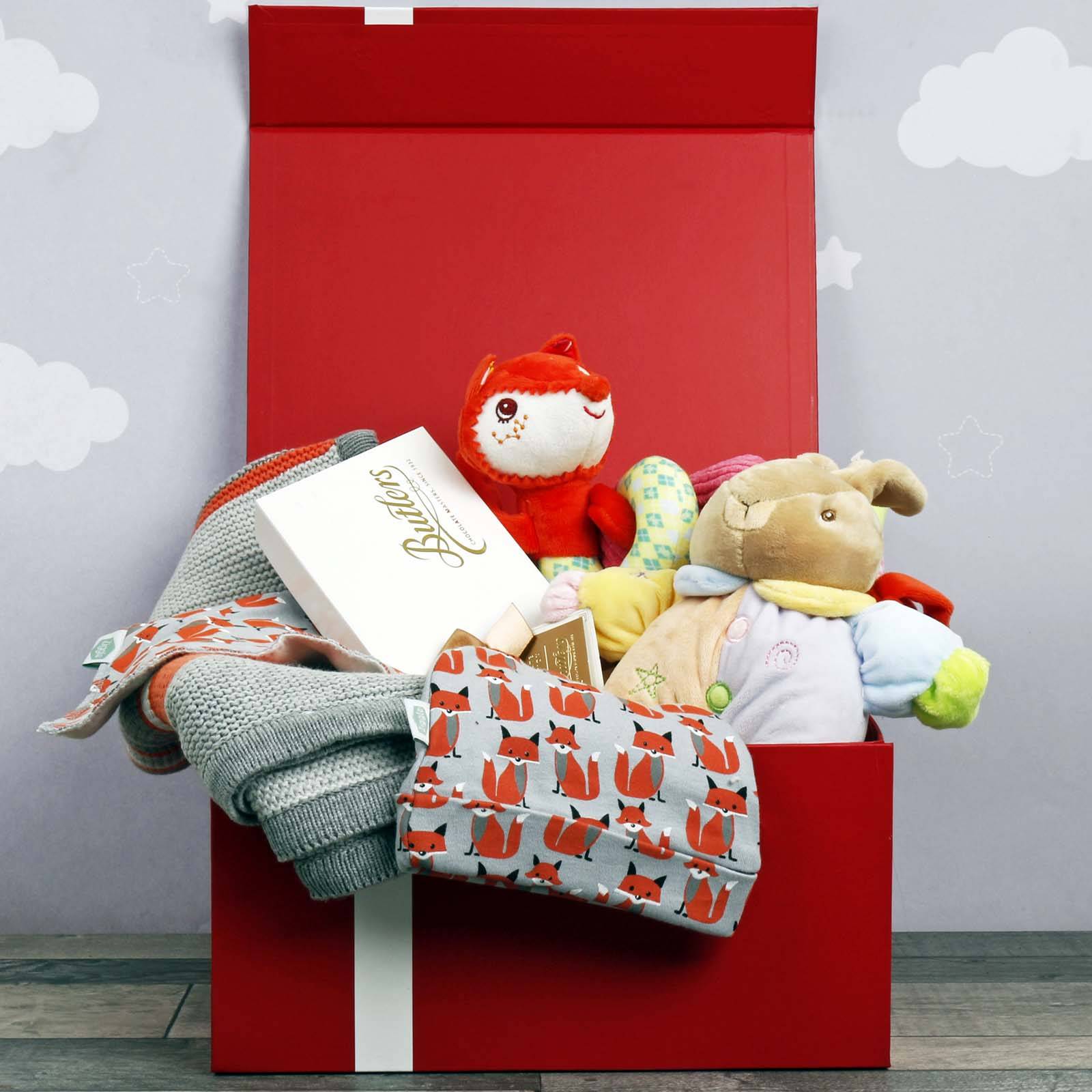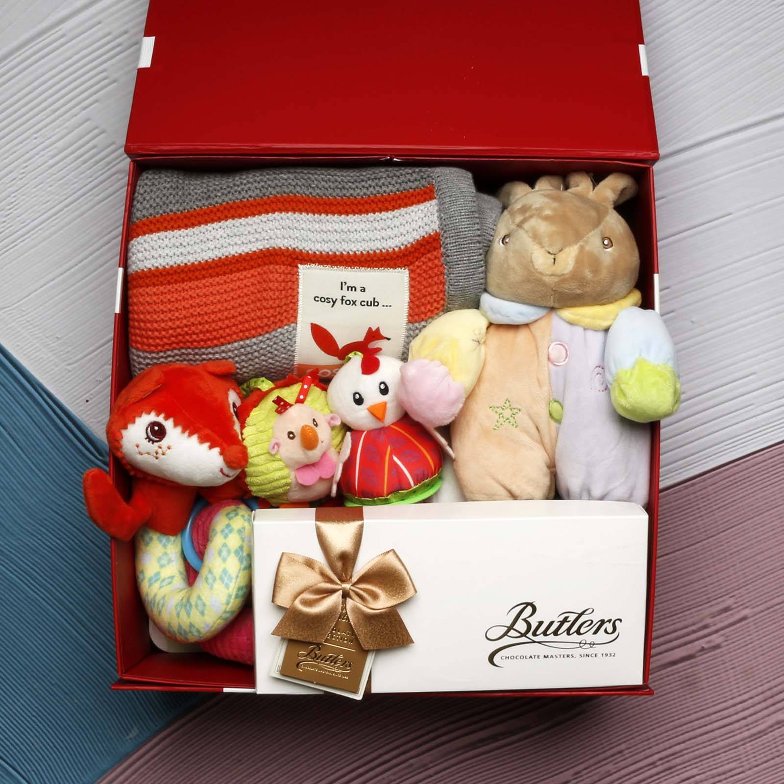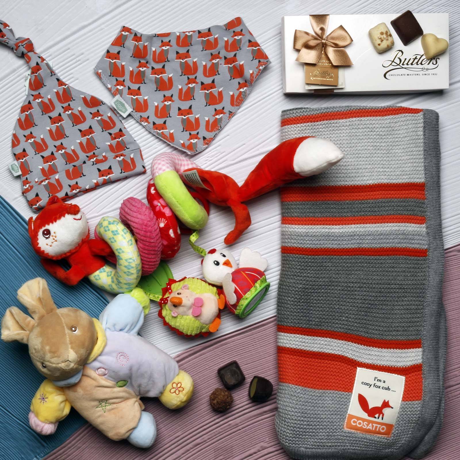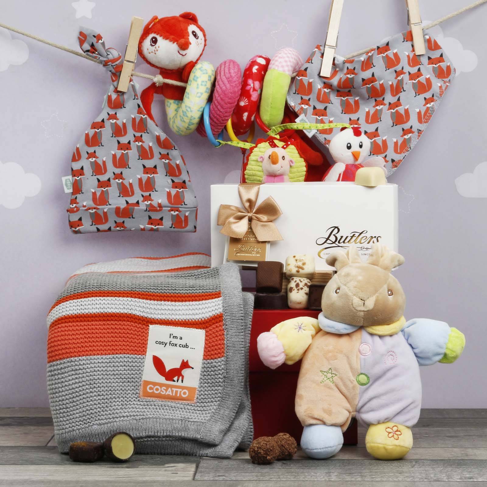 "This charming baby hamper is the perfect bundle of joy for a little one and their doting parents. It features a carefully curated selection of items designed to provide comfort, warmth, and entertainment for the baby, as well as a sweet treat for the grown-ups.