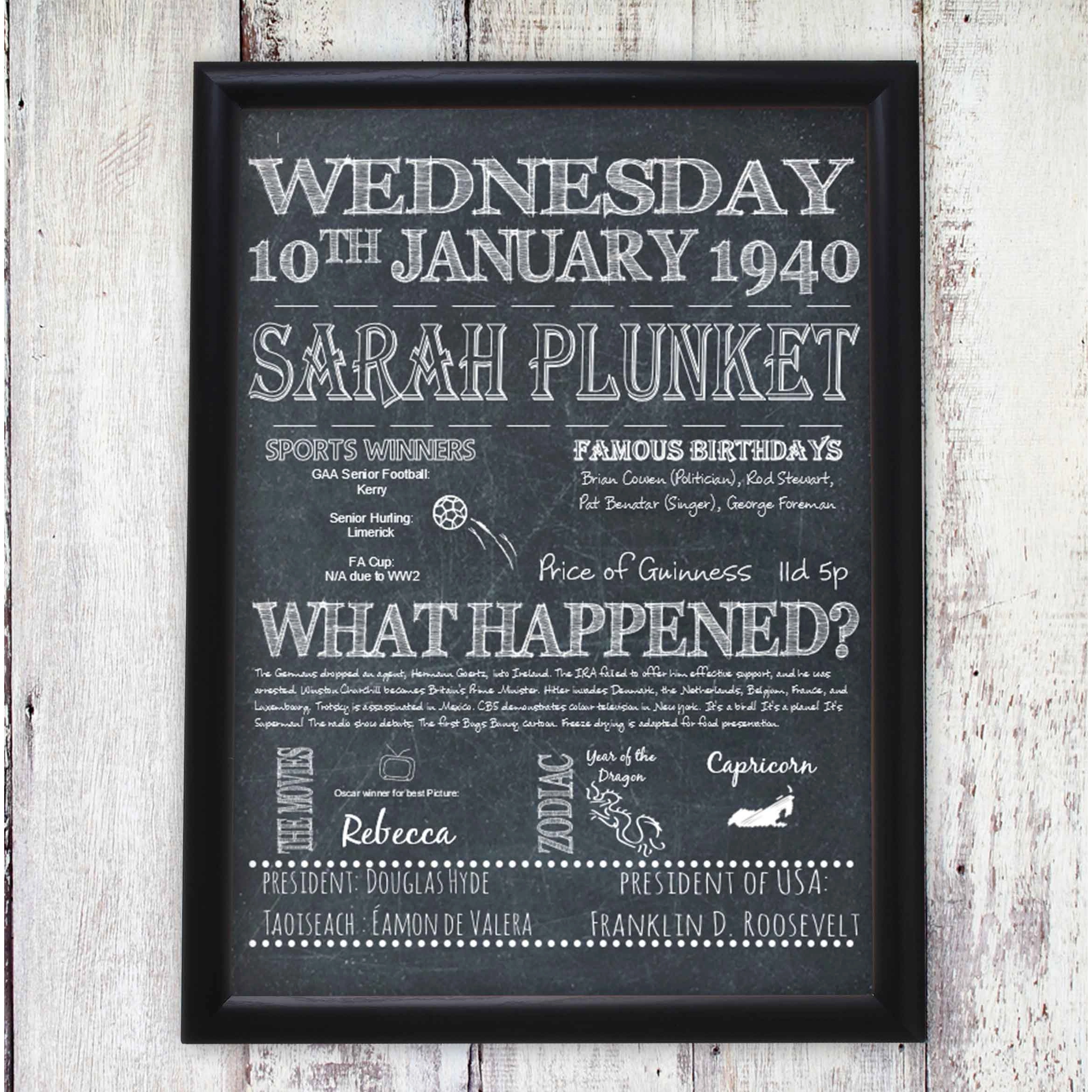 This unique personalised poster makes a beautiful gift, showcasing historic events, famous birthdays, sports winners, and more from the year you were born. Presented in a stylish black or white wooden frame with clear perspex cover, it’s perfect for birthdays, anniversaries, or special occasions. Please note dates are available up to last year only. Avoid middle names for best text size. Print size A3 (297x420mm), frame size 335x447x15mm.