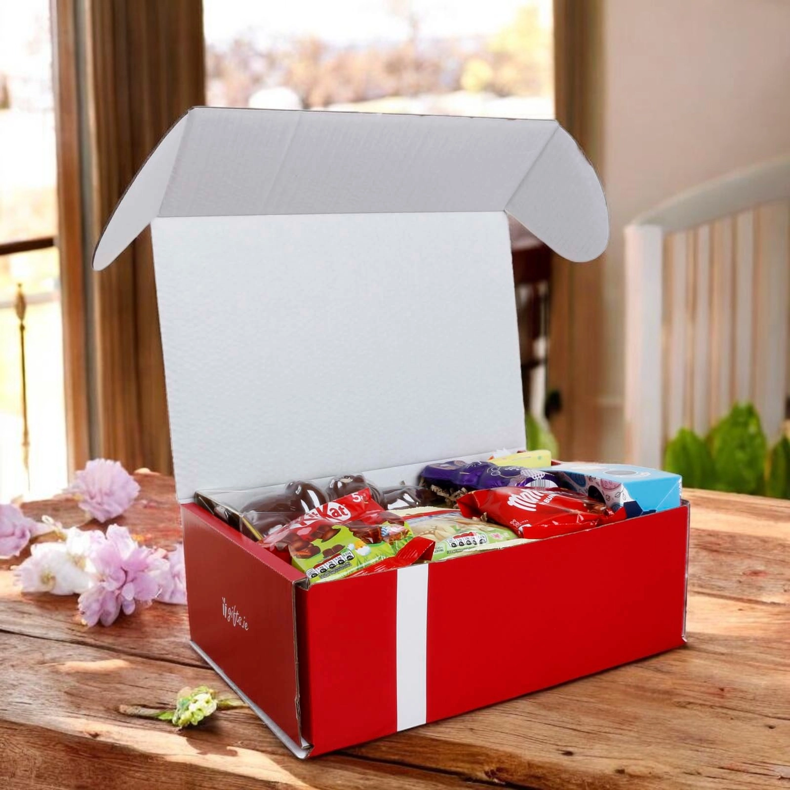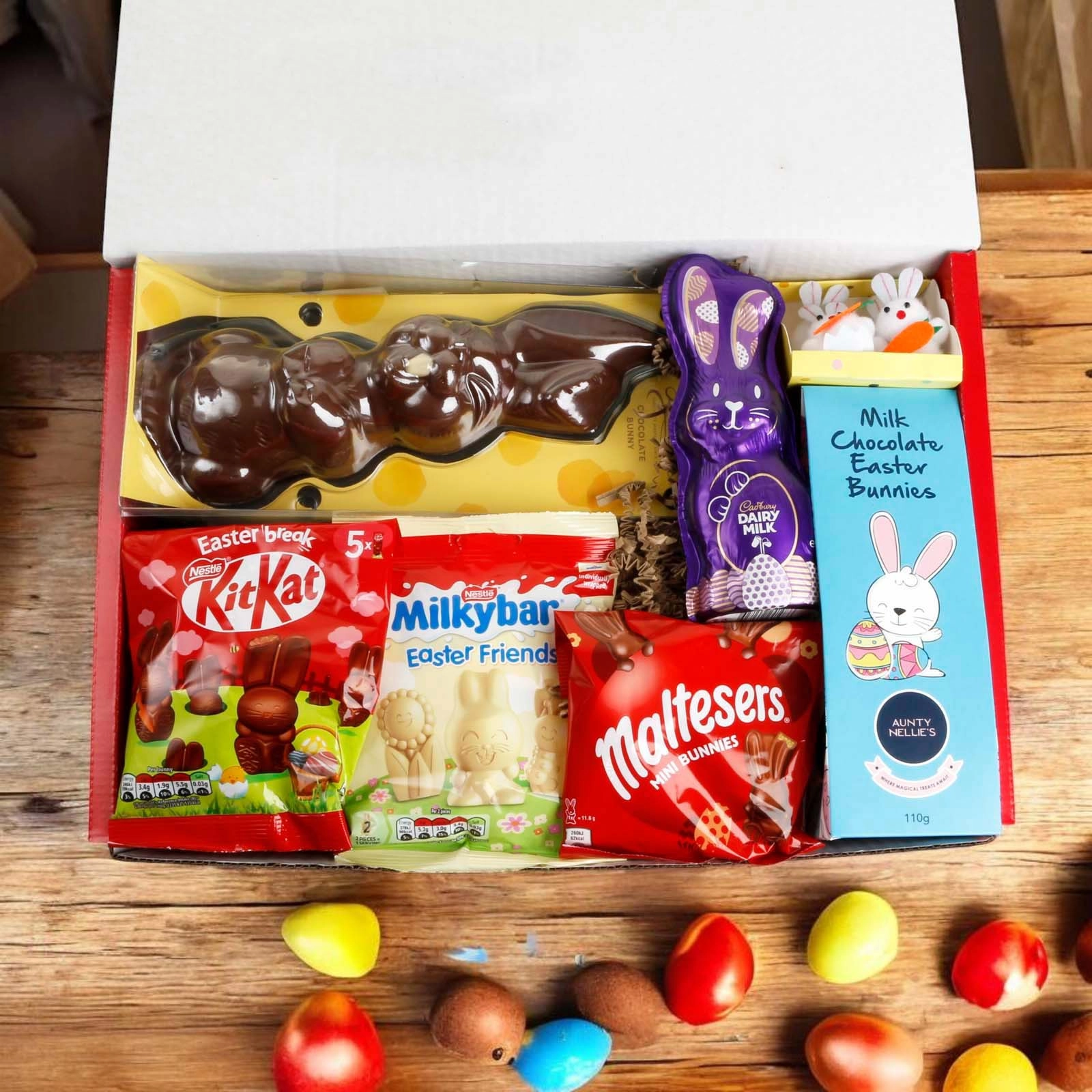 Inside the gift box you will find lots of classic chocolate bunnies with some chocolate eggs!!