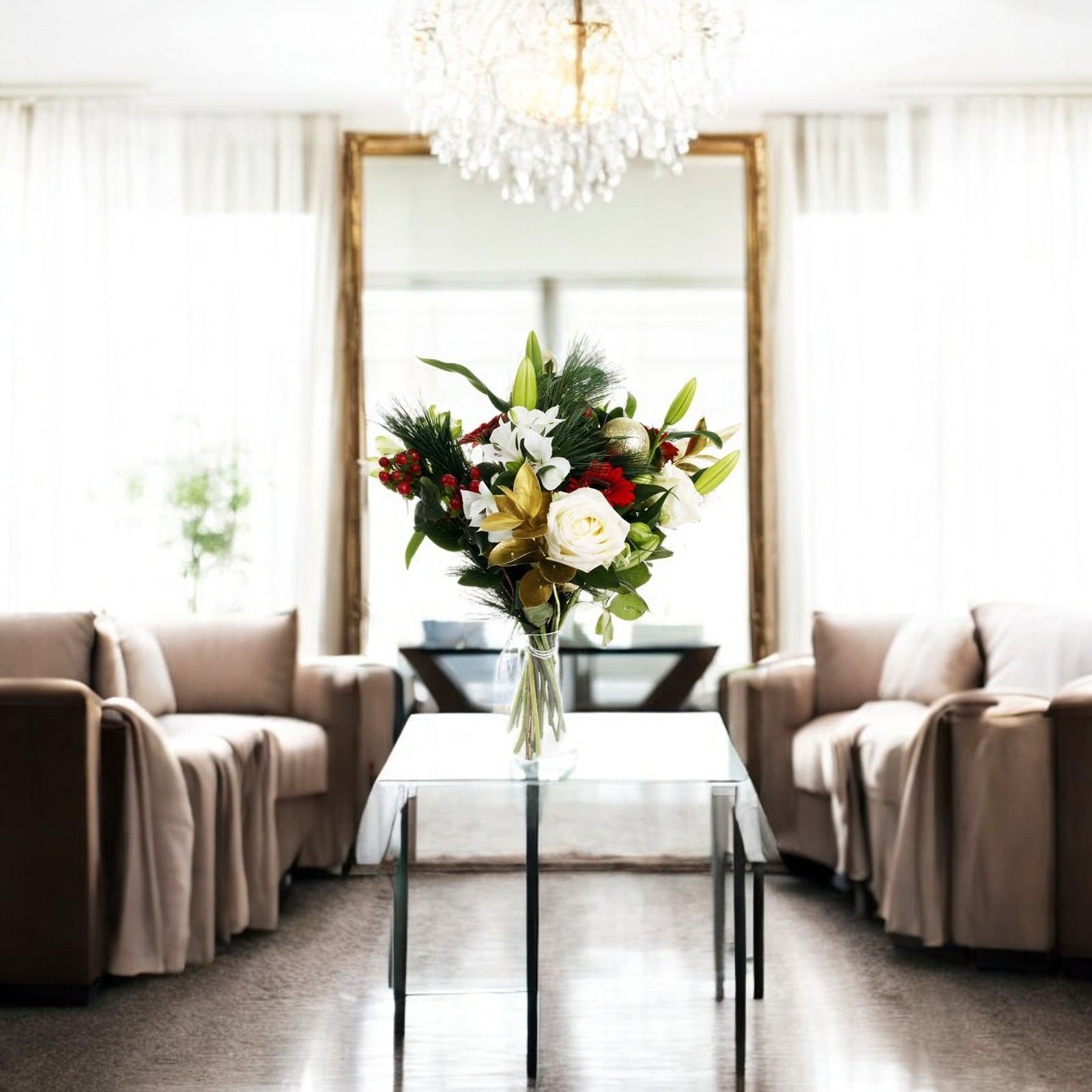 Introducing this radiant and stunning flower arrangement that brings the enchantment of the Christmas season to life.