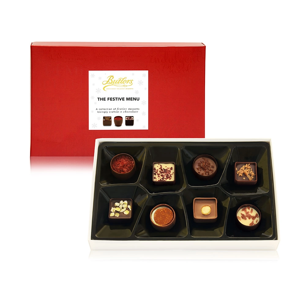 A stunning festive-themed collection of Butlers Dessert Chocolates, presented in elegant red presentation boxes. This selection of eight desserts includes special Christmas recipes of Pomegranate Panna Cotta and Midnight Ginger.