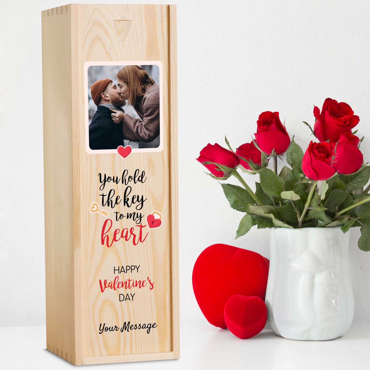 This personalised wine box with a bottle of wine makes the perfect gift Valentine's Day gift.