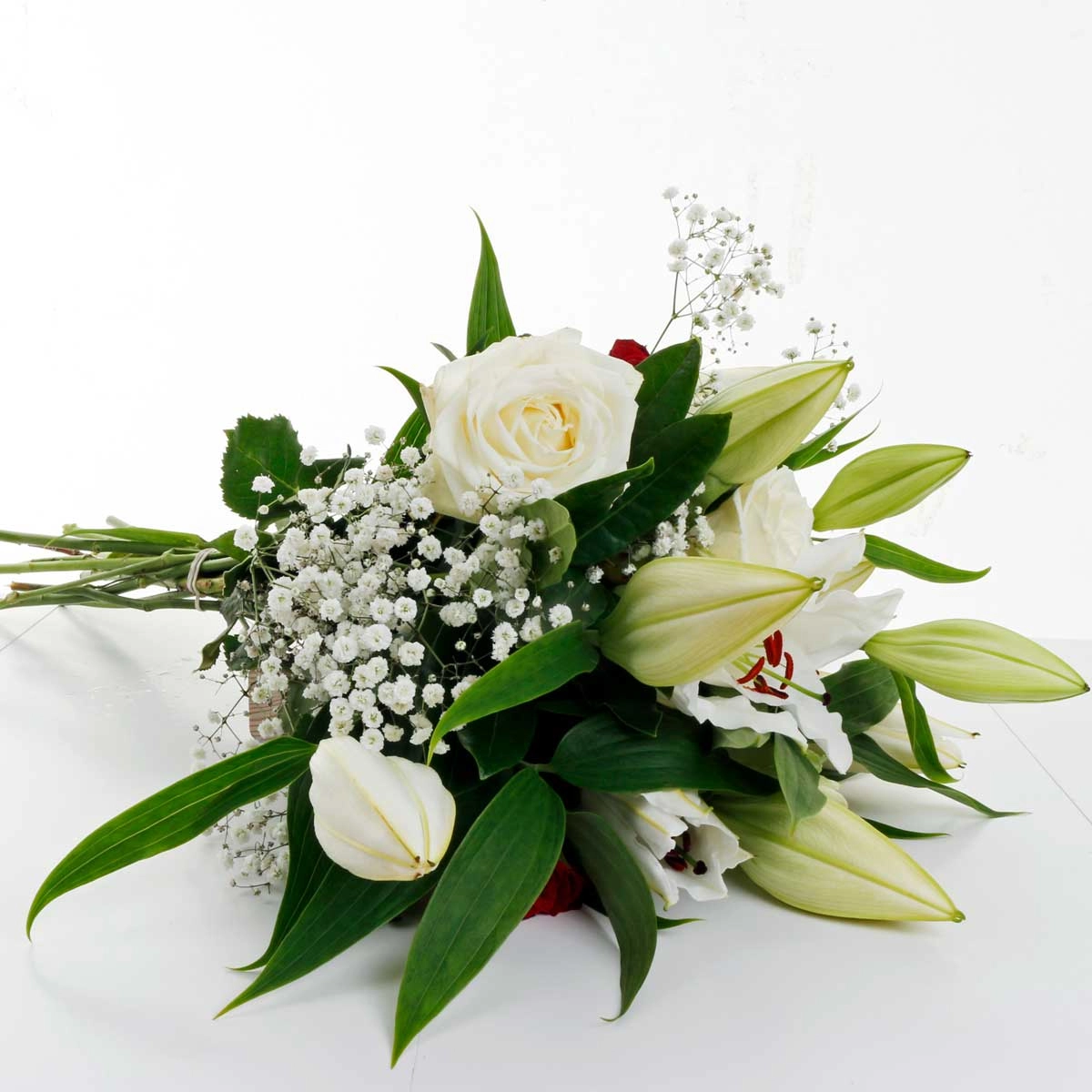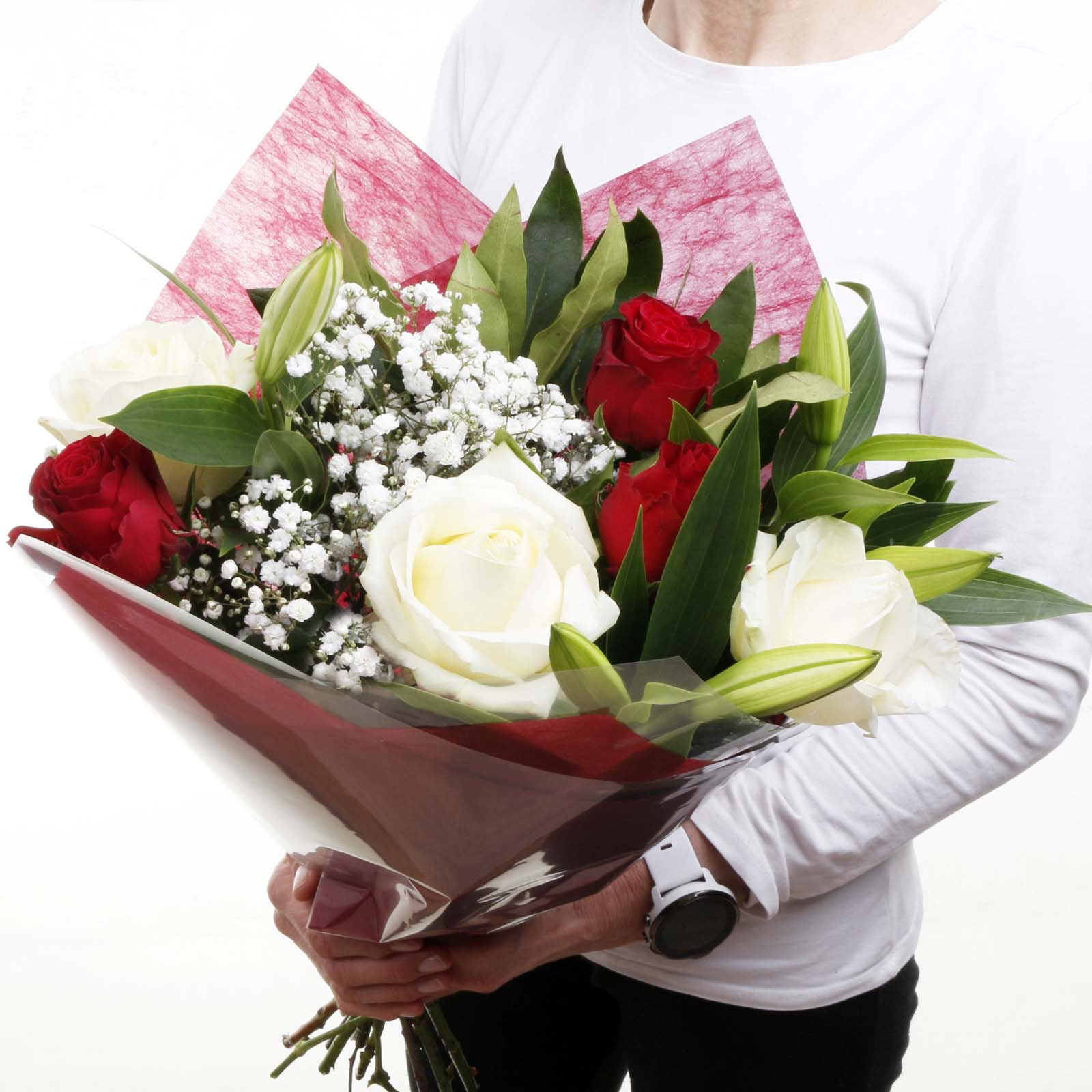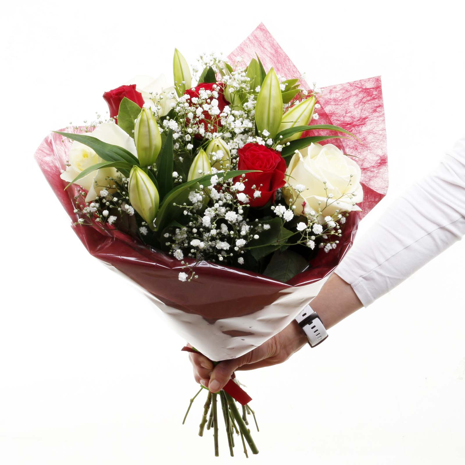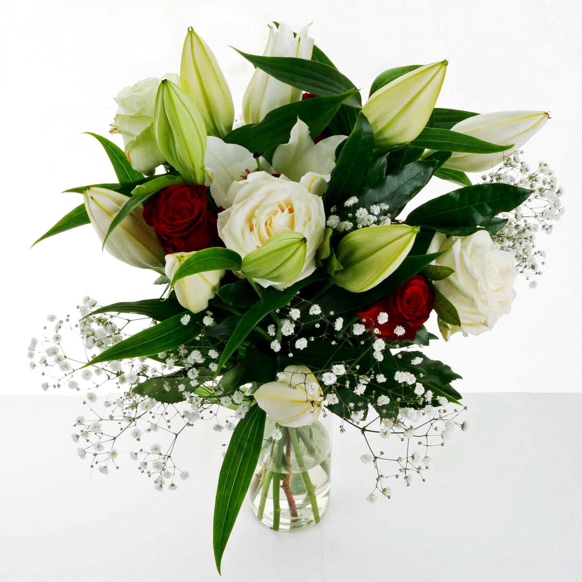 An alluring arrangement of White Lillies, and Red and White Roses that can convey love and affection for someone special.