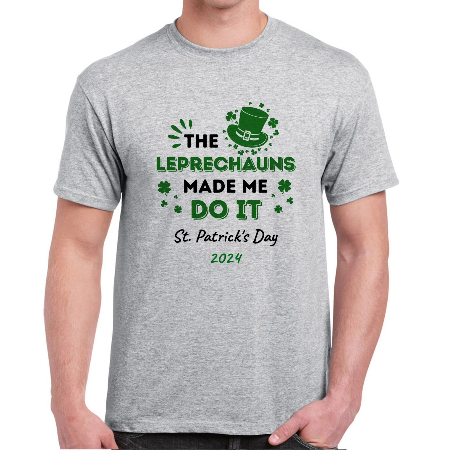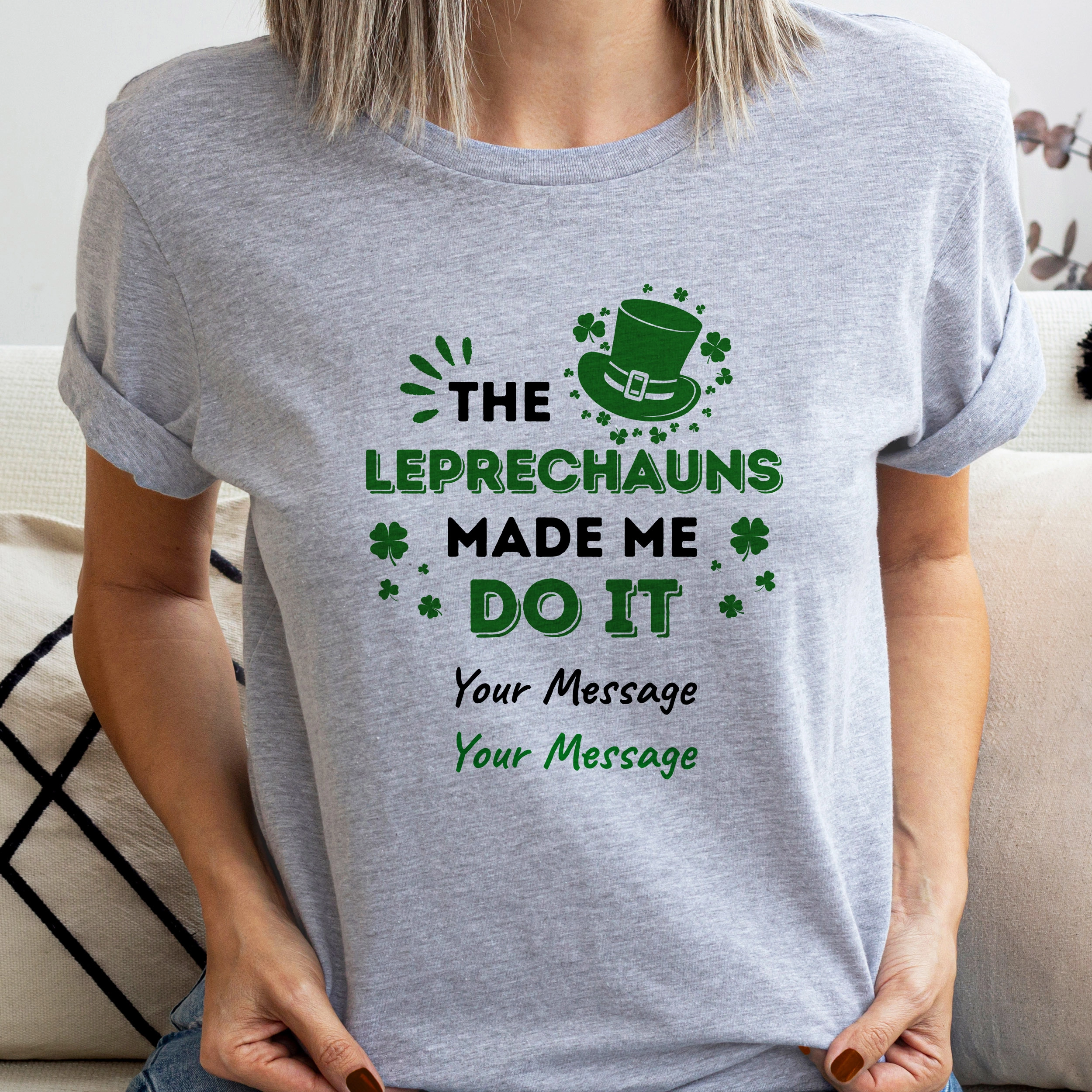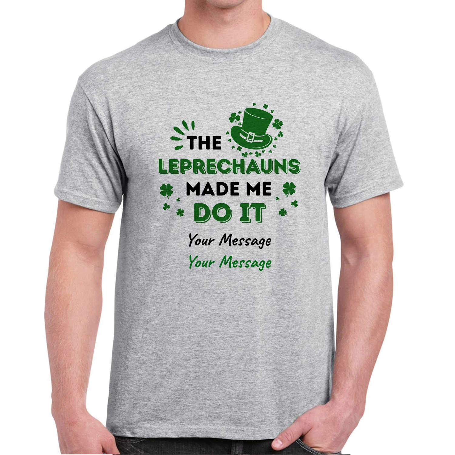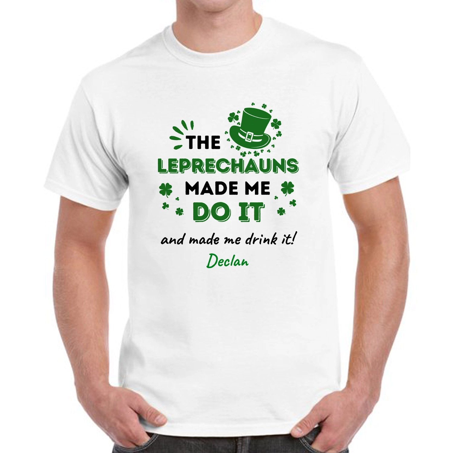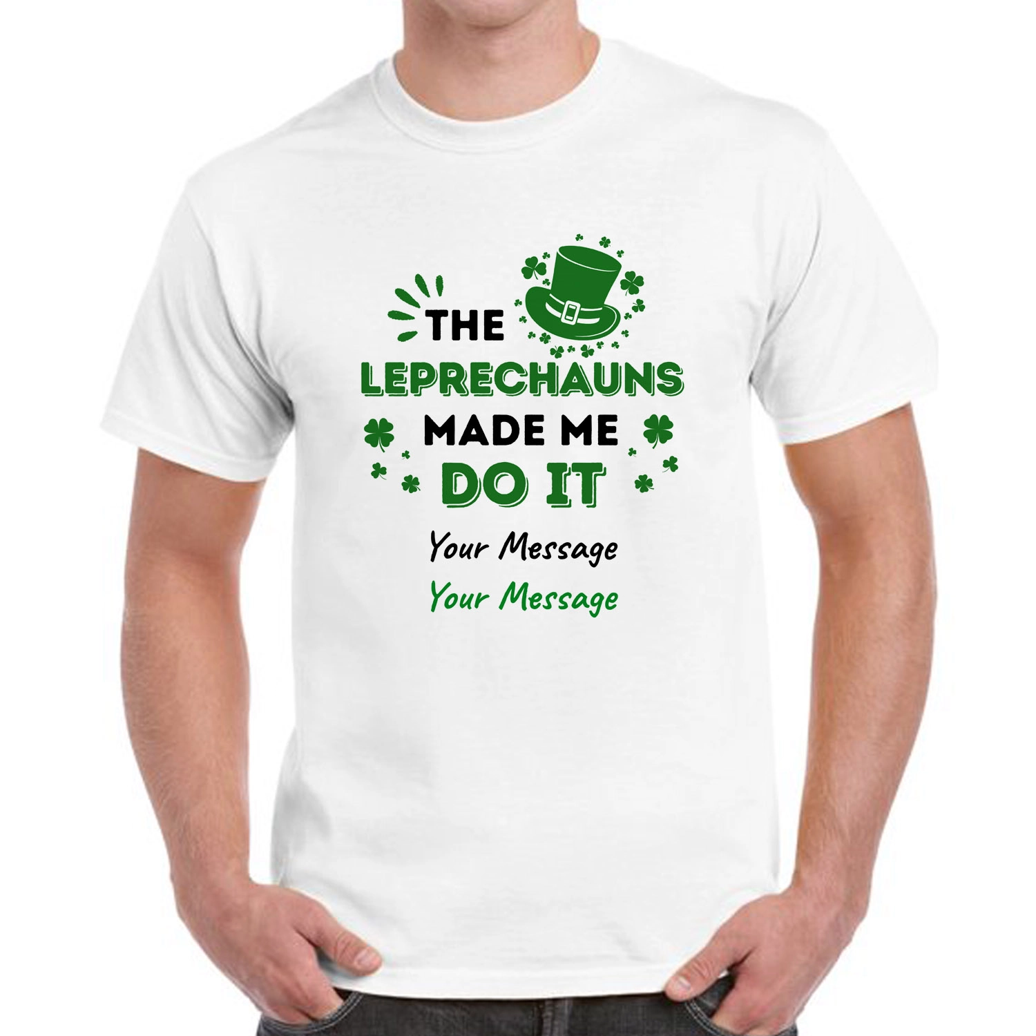 The fun tee says The Leprechauns Made Me Do It. You can put your name and message on it.