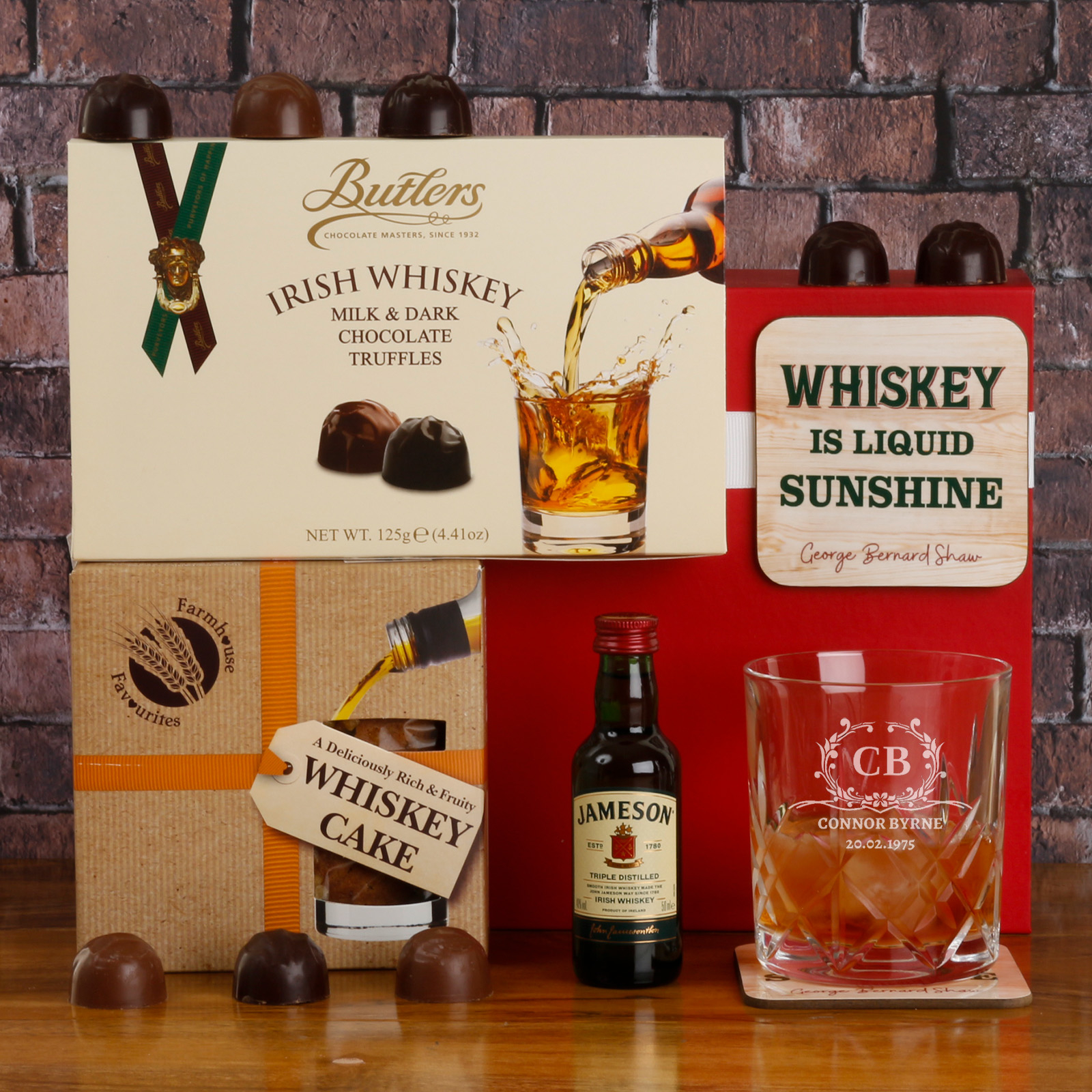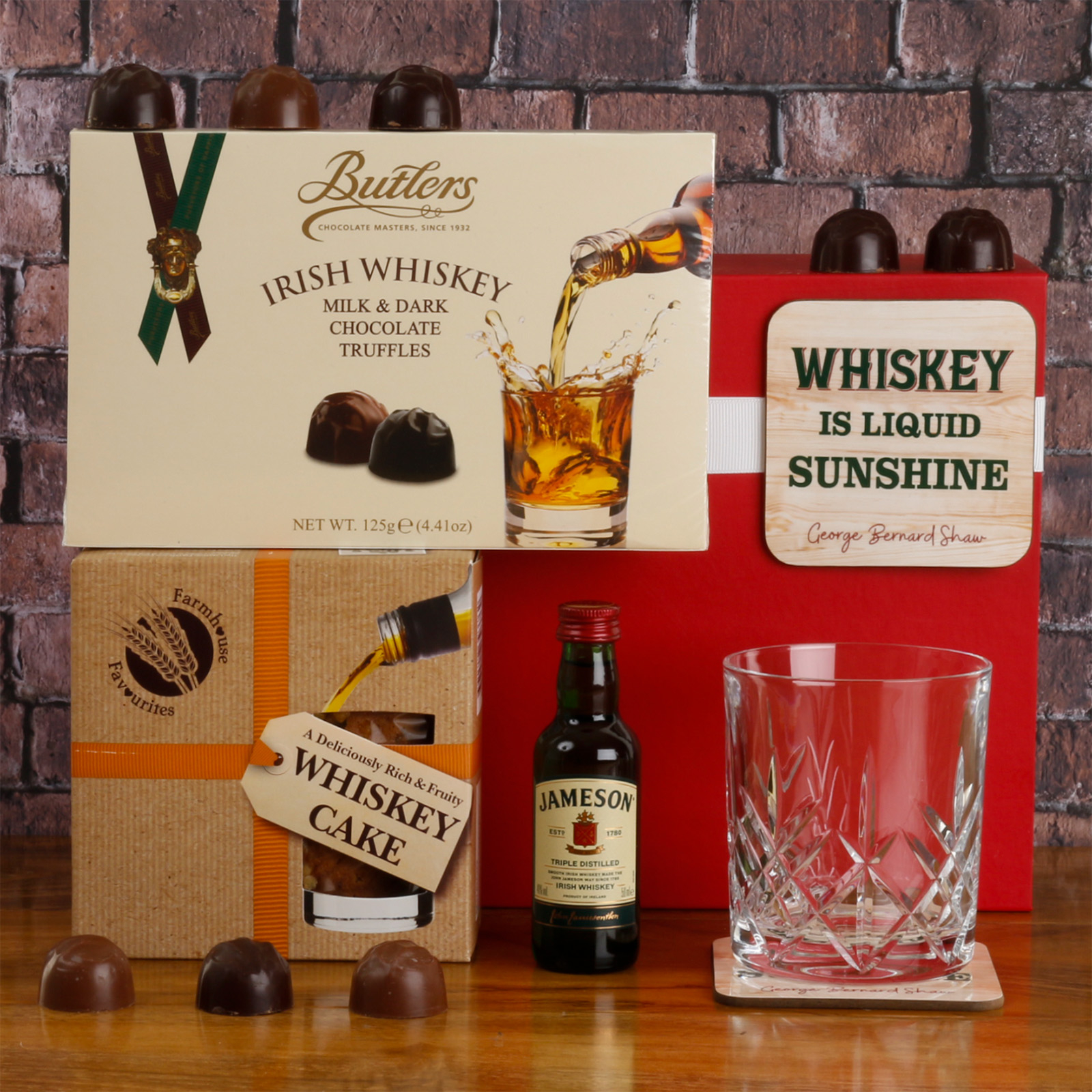 To complete the package, the hamper also includes a deliciously rich and fruity whiskey cake from Foods of Athenry in Galway, and a 'Whiskey is Liquid Sunshine' coaster.
