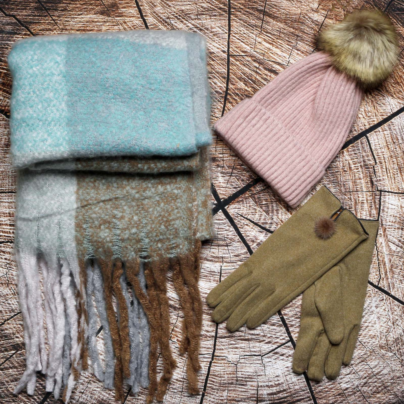 Scarf, Hat & Gloves in Green, Cream & Camel.