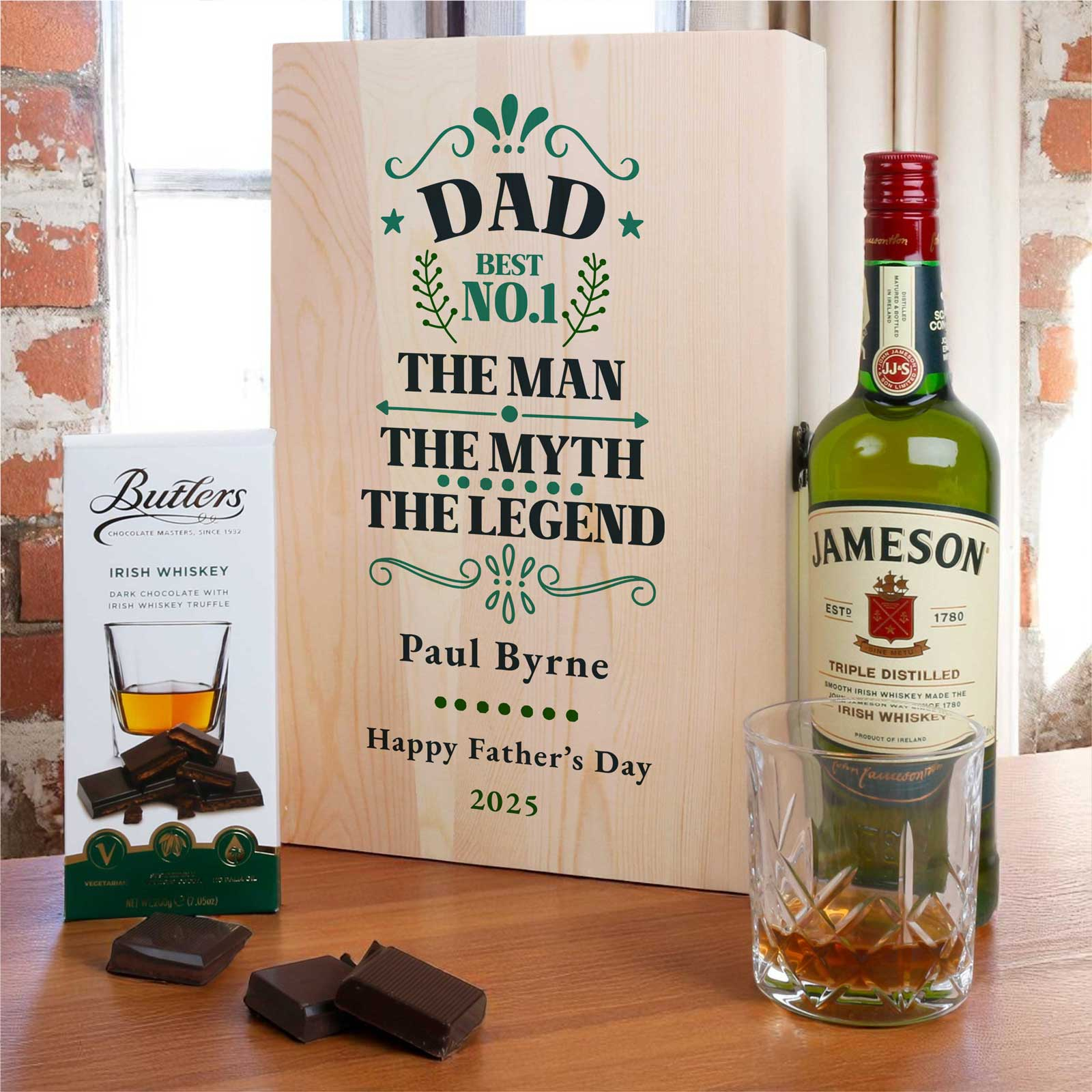 Our Personalised Wooden Box Whiskey Gift Set is the perfect present for the whiskey lover in your life. Featuring a bold “DAD – The Man, The Myth, The Legend” design, this keepsake box is fully customisable with your dad’s name, a short message, and a date – all printed in high-resolution directly onto the wooden lid.