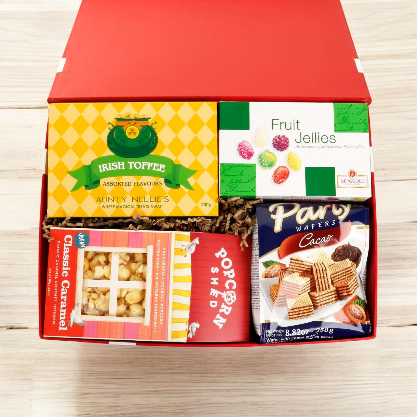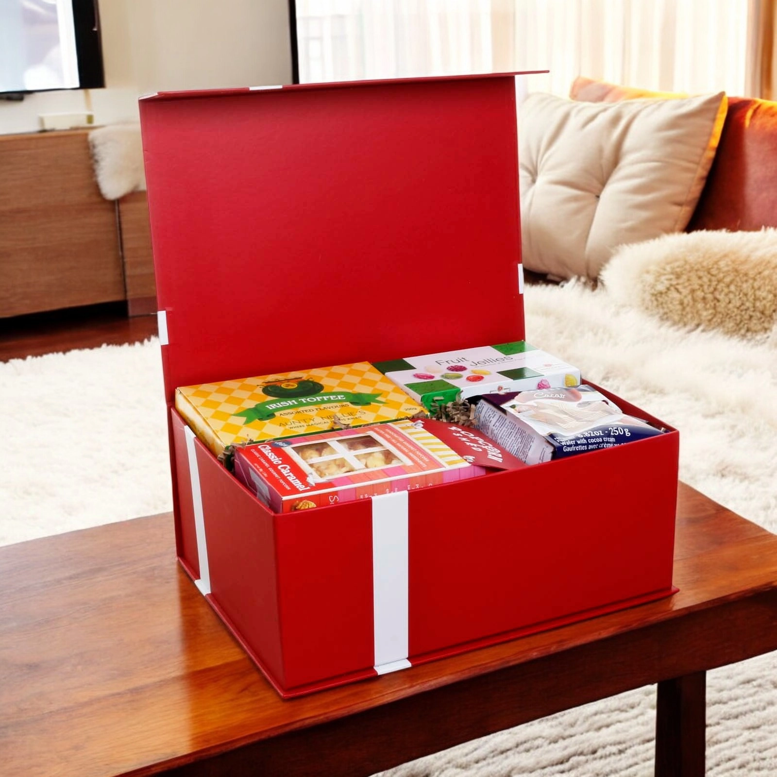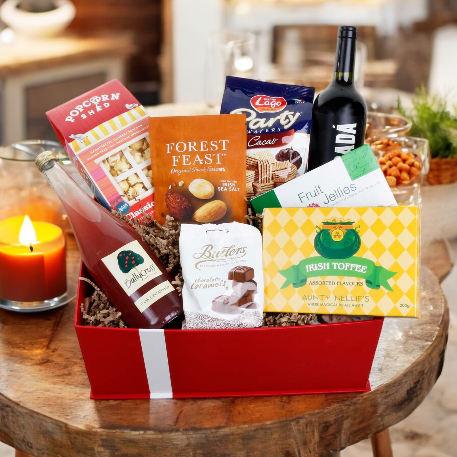 The hamper is presented in our new luxury red gift box with satin bow. Stylish and reusable, the gift box is packed inside a separate shipping box for secure transport.