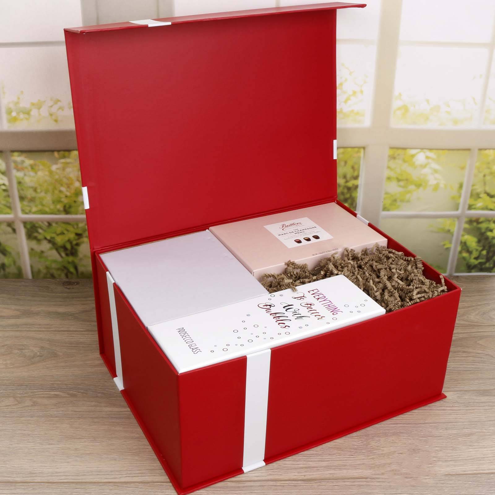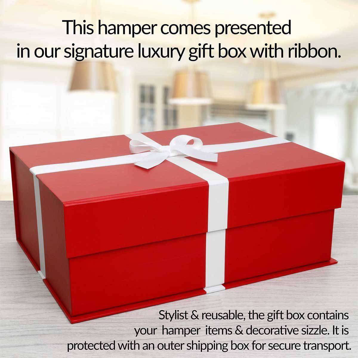 The hamper is presented in our chic red gift box. Stylish and reusable, the gift box is packed inside a separate shipping box for secure transport.