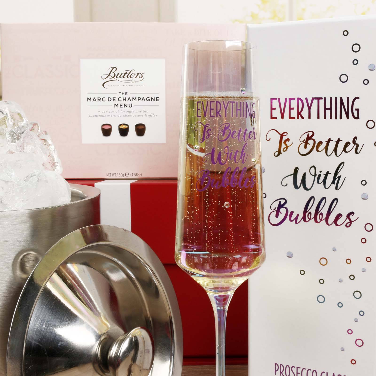 This exquisite hamper includes a full sized bottle of fine prosecco, a sleek stainless steel double wall ice bucket, a champagne flute and some tasty Butler's champagne chocolates that make up this gorgeous gift box - perfect for wishing someone a Happy Birthday, Congratulations, New Baby or Just Because! Perfect for toasting any special occasion.