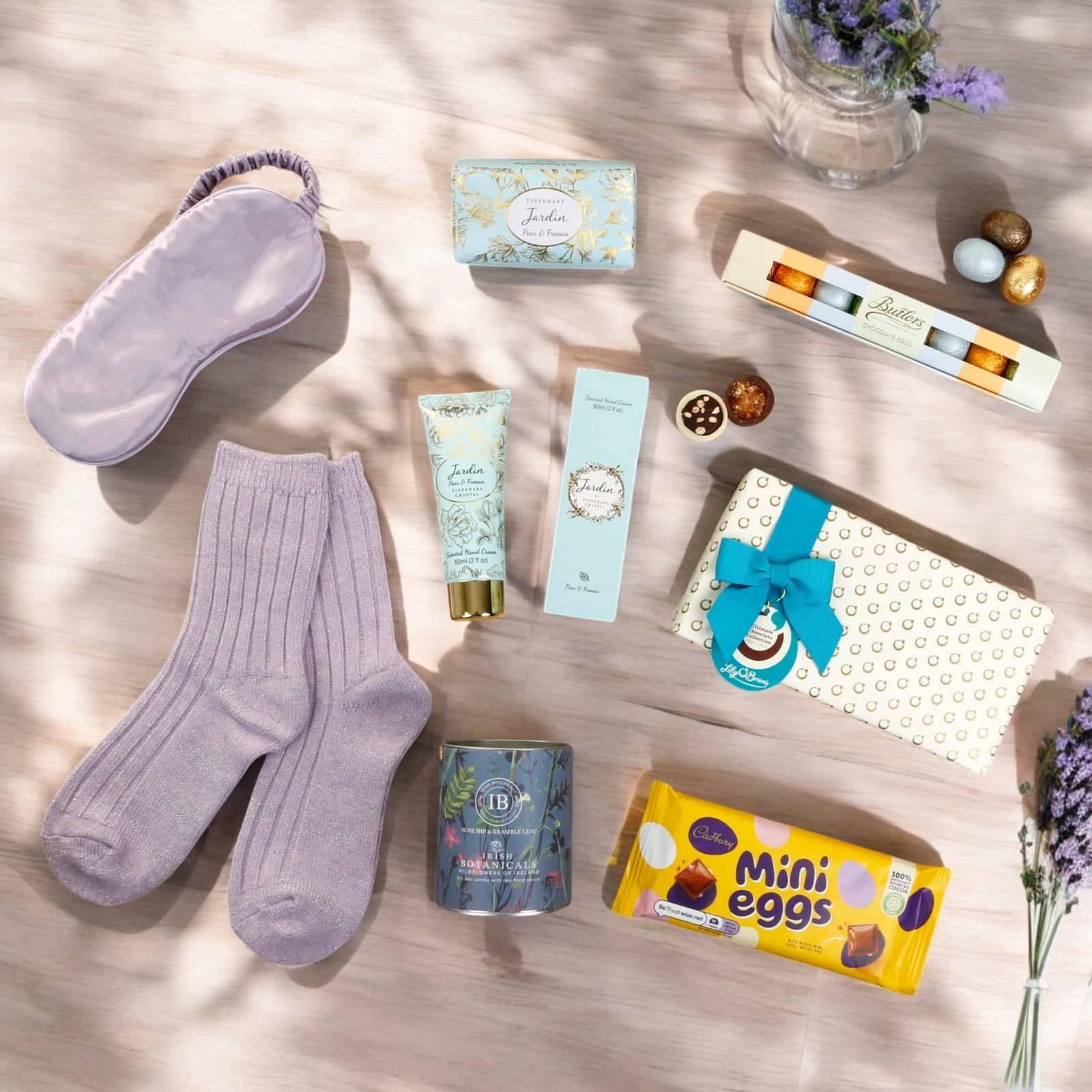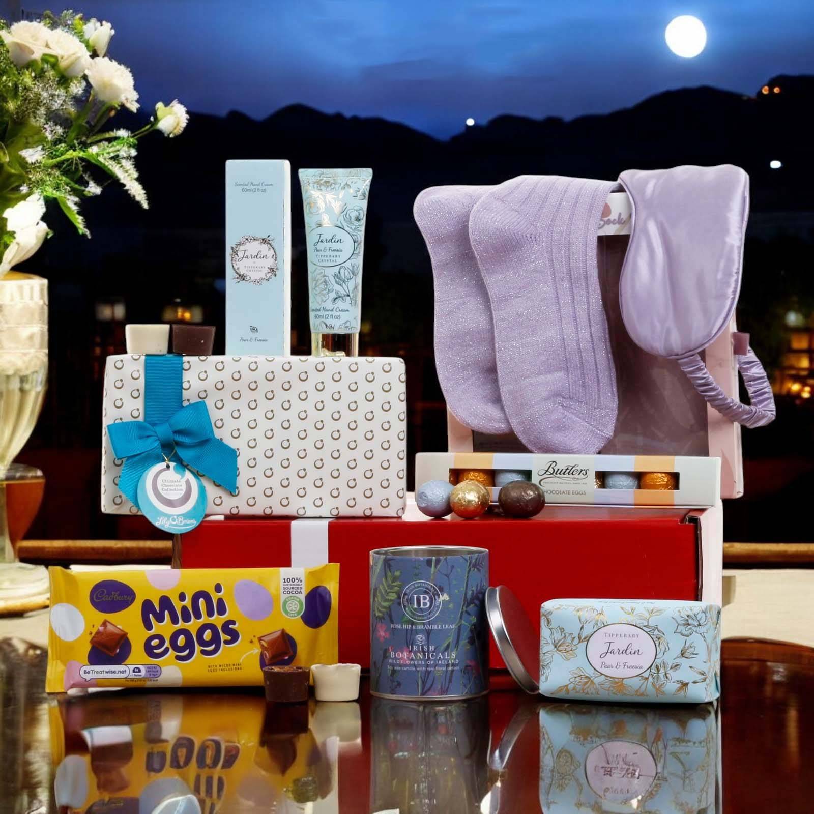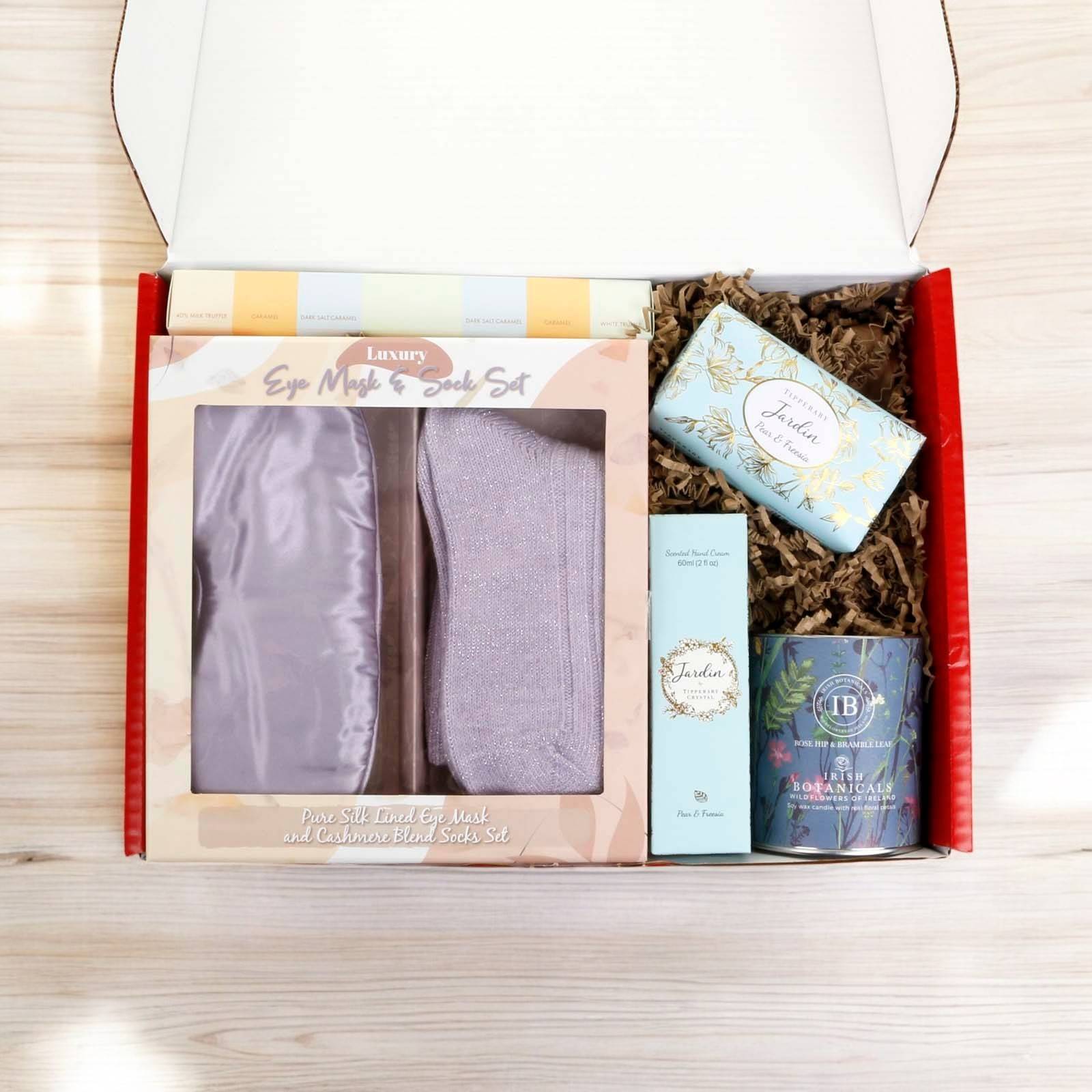 De-stress with our gorgeous pampering and delicious treats gift box  for her. A gift for pampering and self care; designed to promote relaxation and wellness.