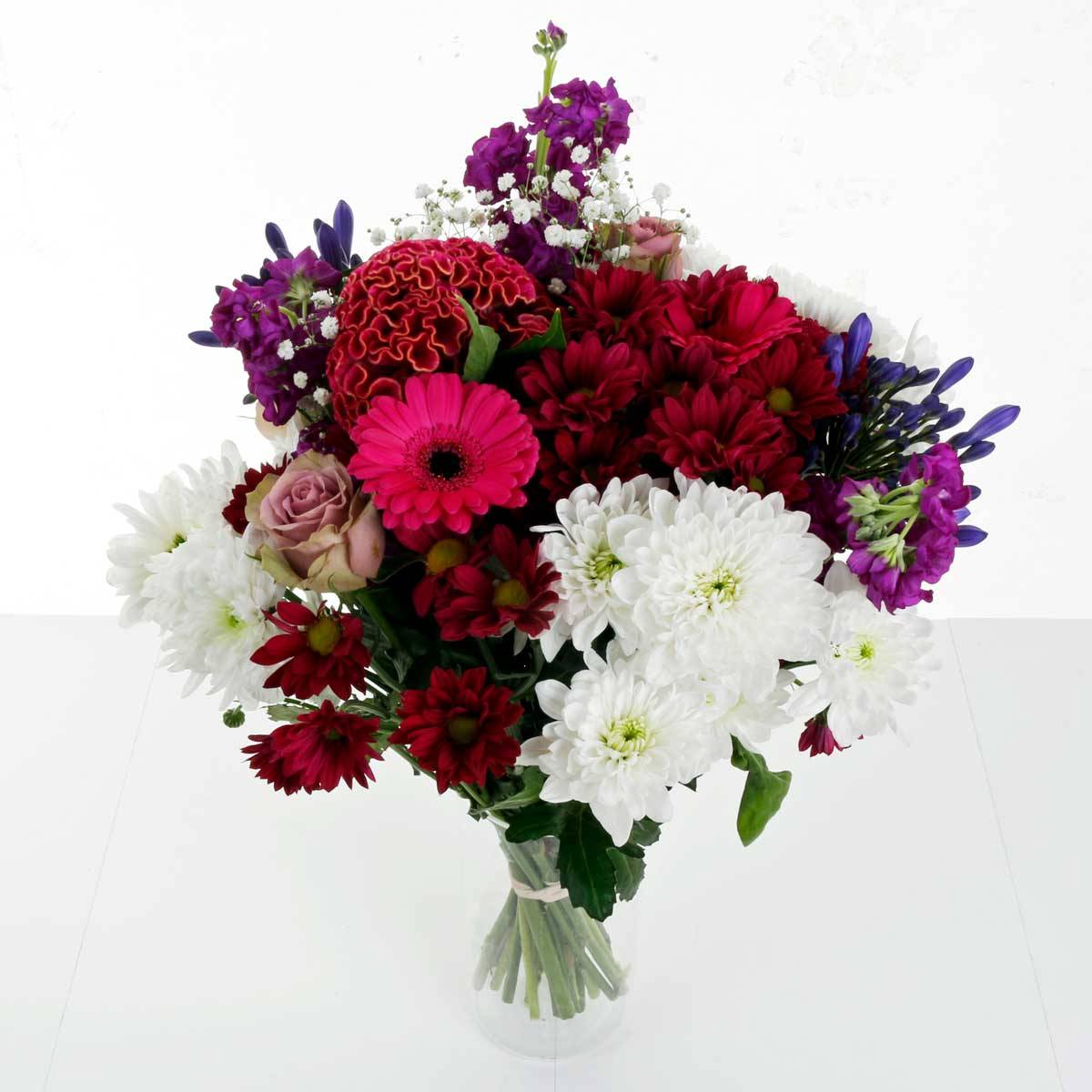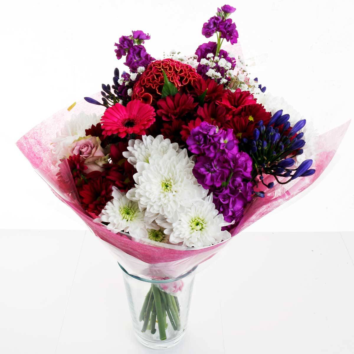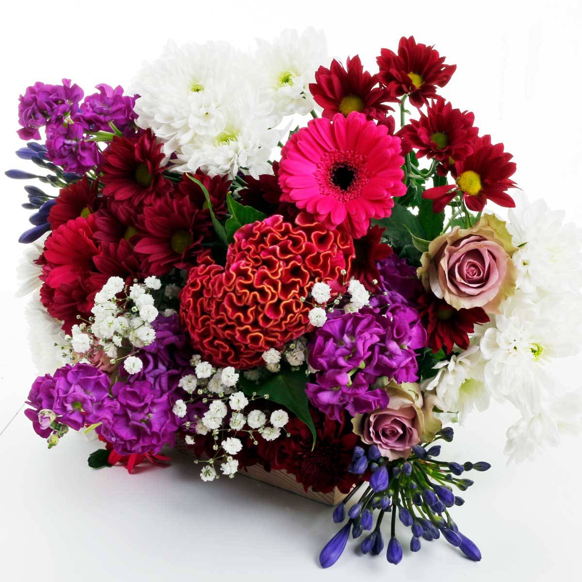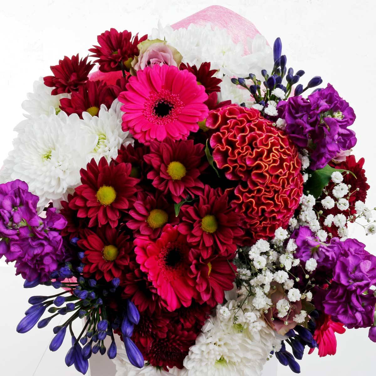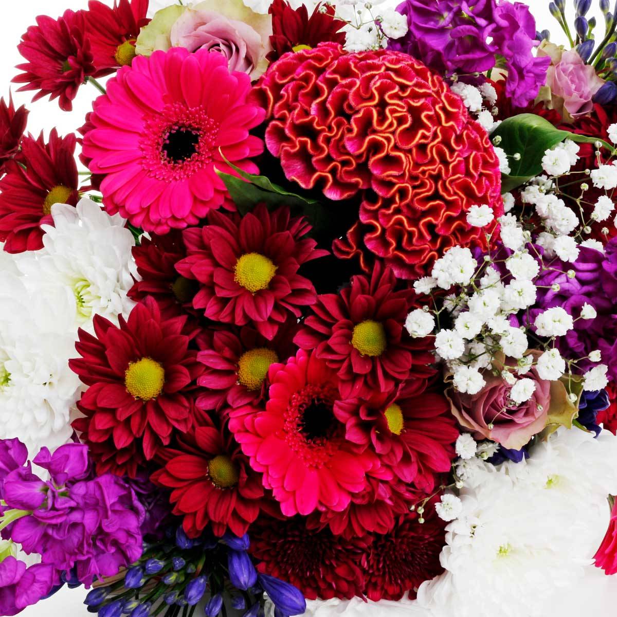 Regally and wonderfully purple, this flower arrangement is packed with Chrysanthemums and Celosias and radiates sophistication and elegance.