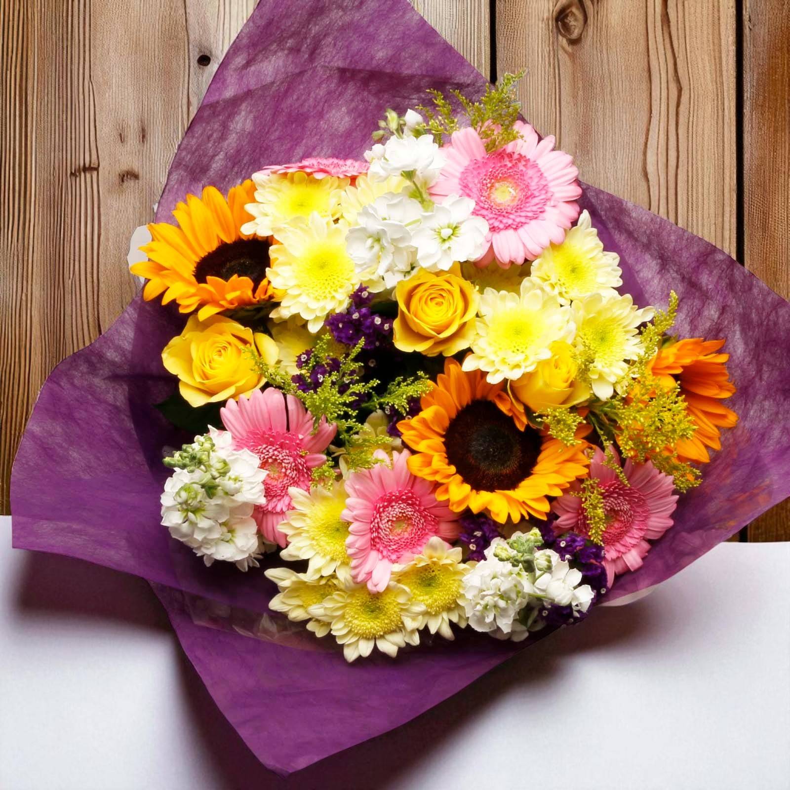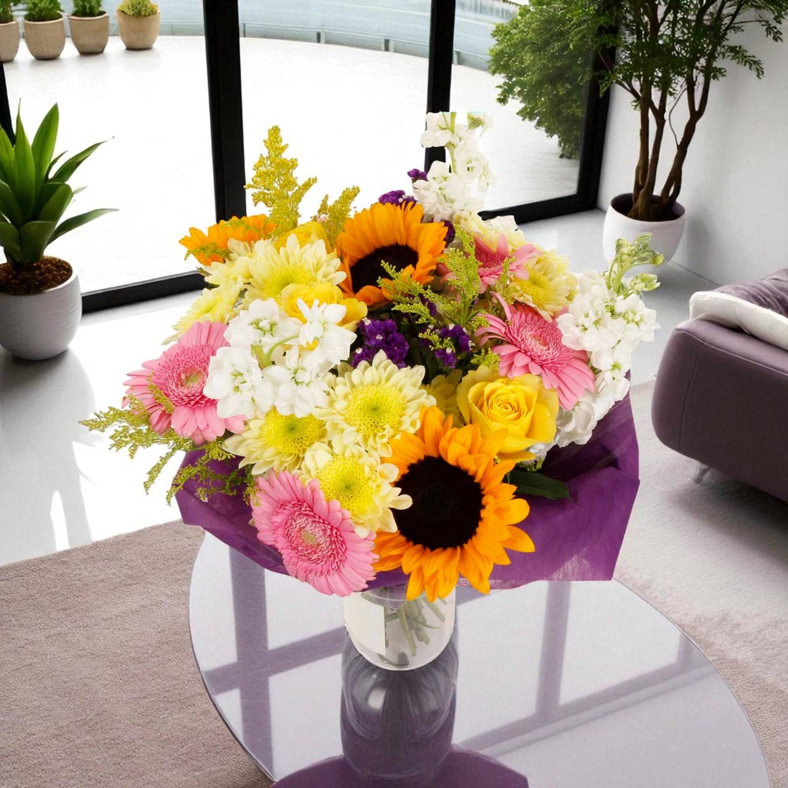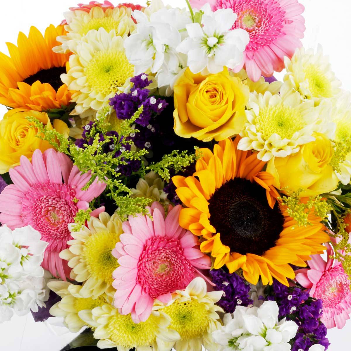 Beautifully arranged Sunflowers, yellow Roses and cream Chrysanthemums to help lift someone’s spirits.