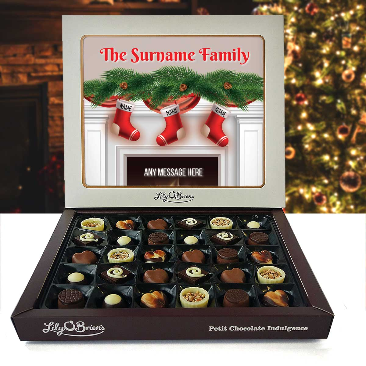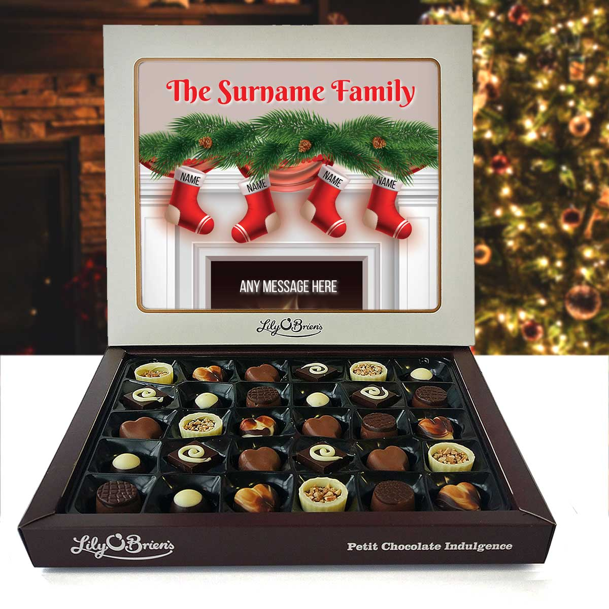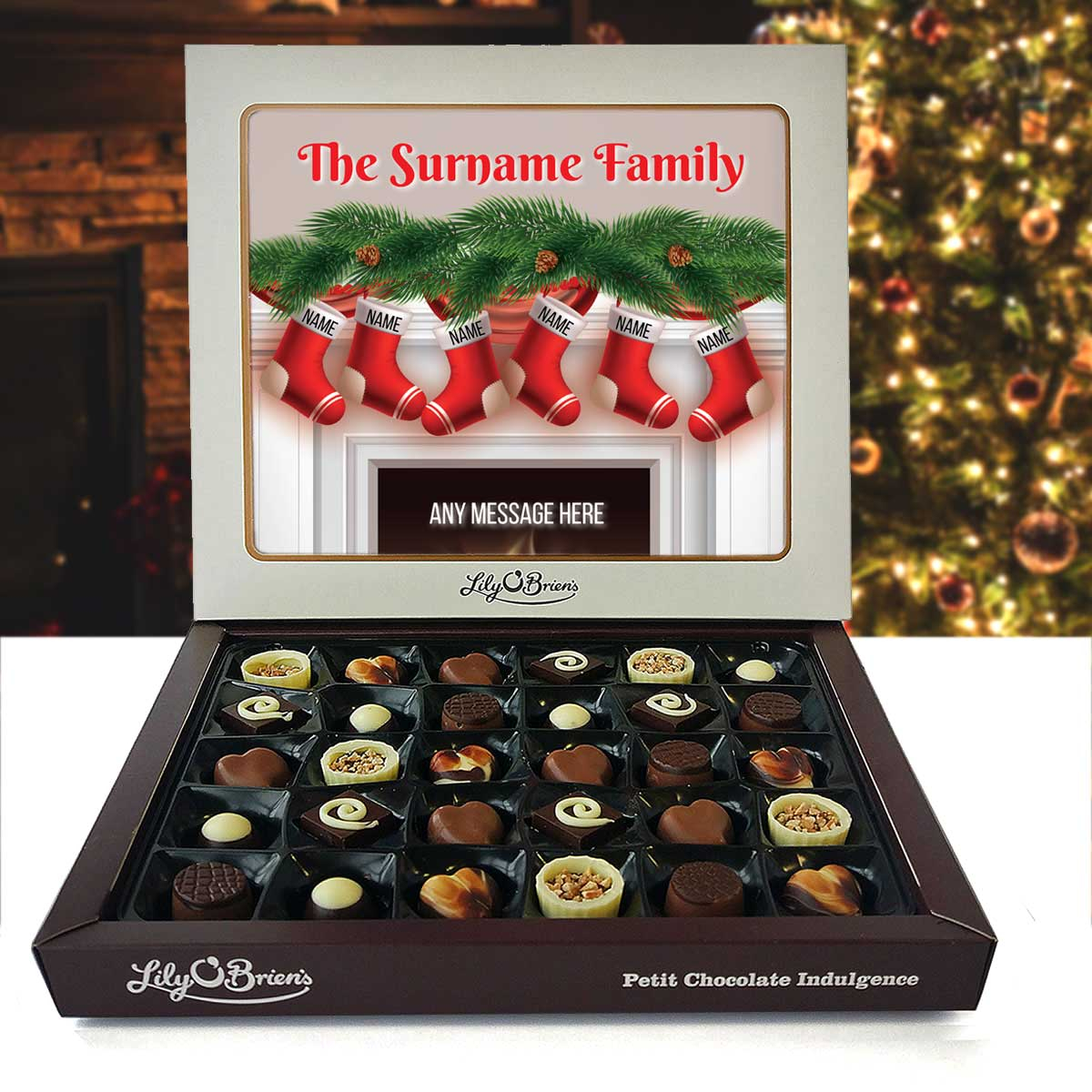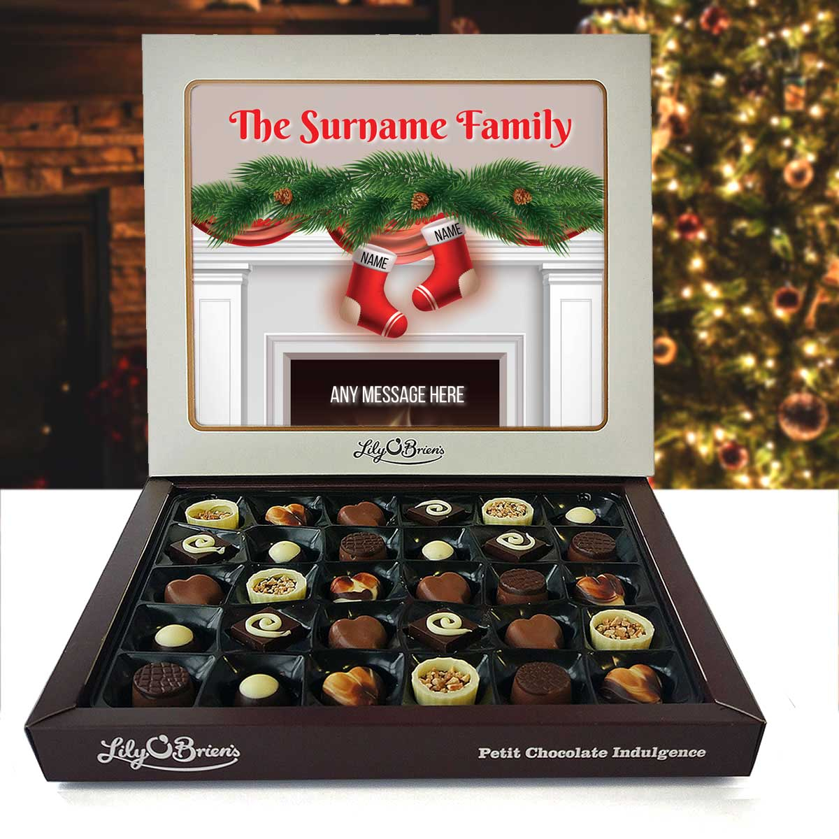 This Personalised Chocolate Box is filled with the Lily O'Brien's Luxury Chocolate collection. Approximate box dimensions: 290mm x 240mm x 40mm.