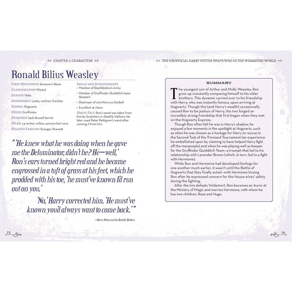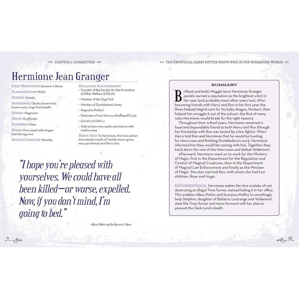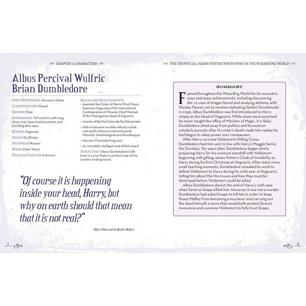 Readers will find details of when the character was first mentioned, appearance, wizard school, house, patronus, wand, related family members, skills and achievements, personal history and more! With more than 700 characters included, this book is packed from cover to cover.