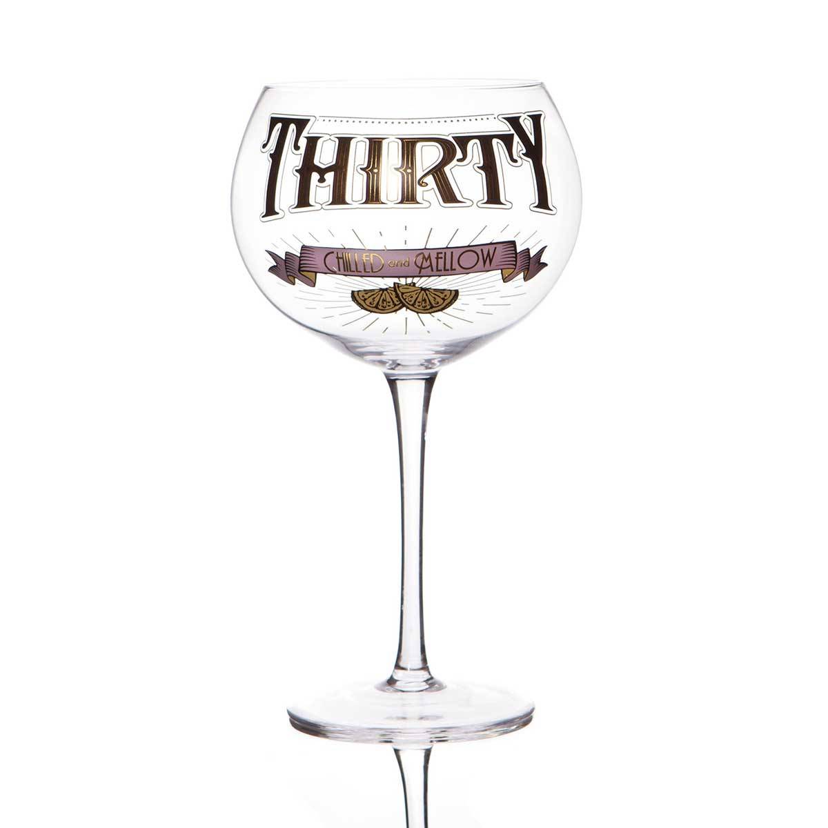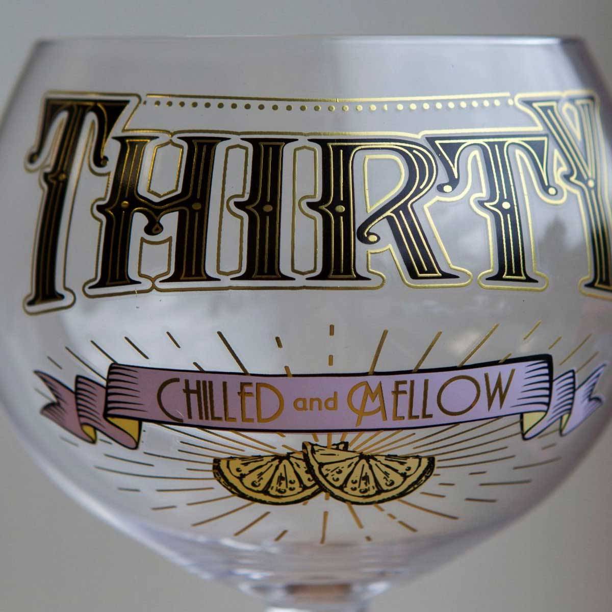 Celebrate a special 30th birthday in style with this gorgeous decorative gin glass. This glitzy glass is decorated with beautiful text that reads "Thirty – Chilled and Mellow" and glamorous print detail in black, gold, purple and ivory. Packaged in a stylish gift box, this prohibition style glass makes the perfect gift for a chilled out gin fanatic on their thirtieth birthday.