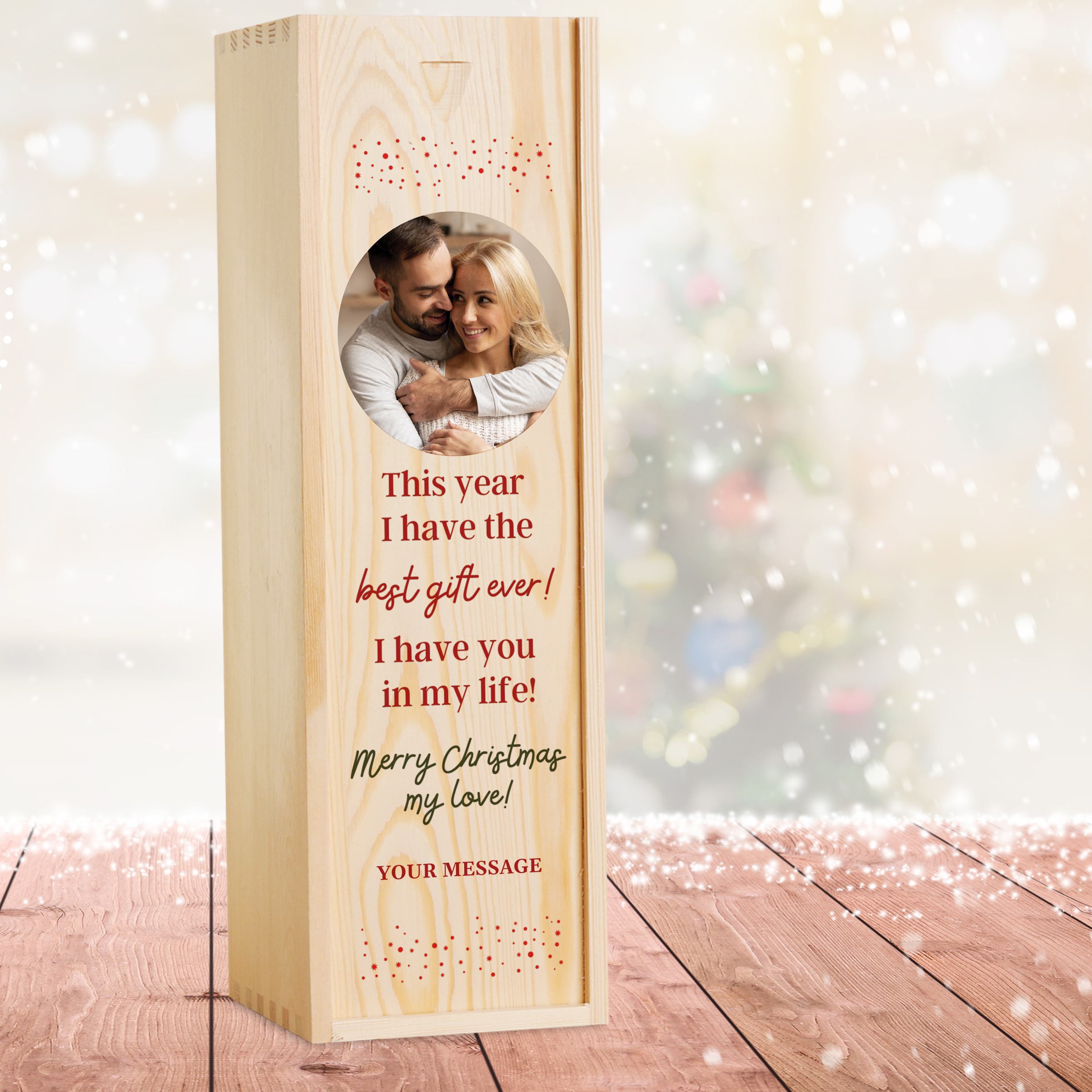 This personalised wine box with a bottle of wine makes the perfect Christmas gift.
