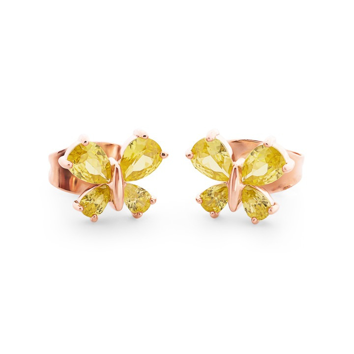 These Stud earrings are crafted from Rose Gold and feature a Butterfly with the wings inset with Yellow crystals. Closure is with a post and butterfly clasp..