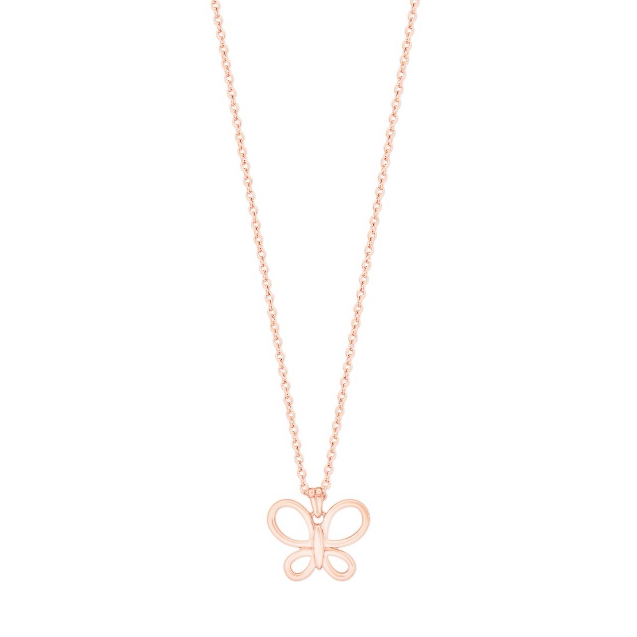 This stylish pendant is crafted from Rose Gold and features a butterfly fly shapped icon hanging from a polished bale. This piece closes with a lobster clip and finished with a TC Fob.