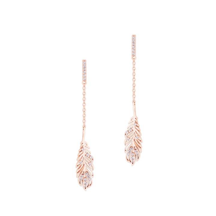 These fashionable Rose gold earrings feature a delicate feather at the end of an elegant chain, topped off with a crystal inset feature. These stylish earrings are embelleshed with Crystals and secure comfortably with push backs.