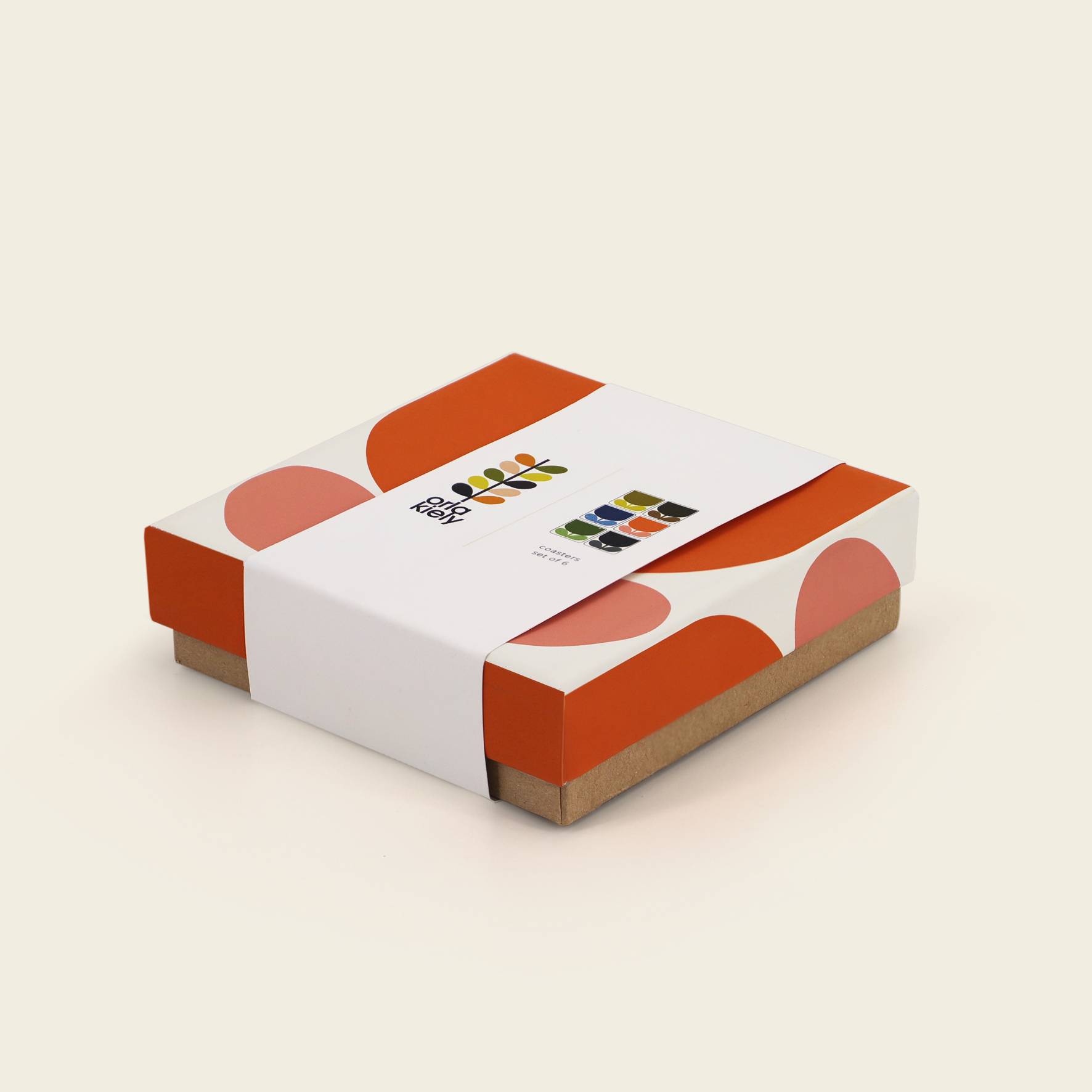 Six differently coloured coasters from the Orla Kiely homewares collection. The design is known as the Block Flower and has the distinctive signature look of an Orla Kiely design.