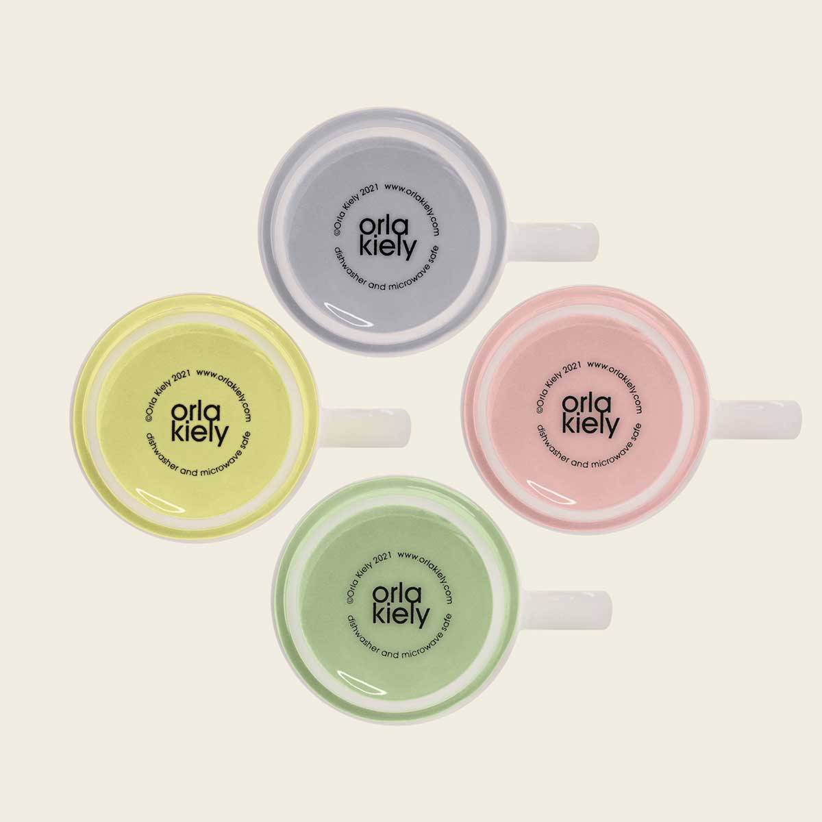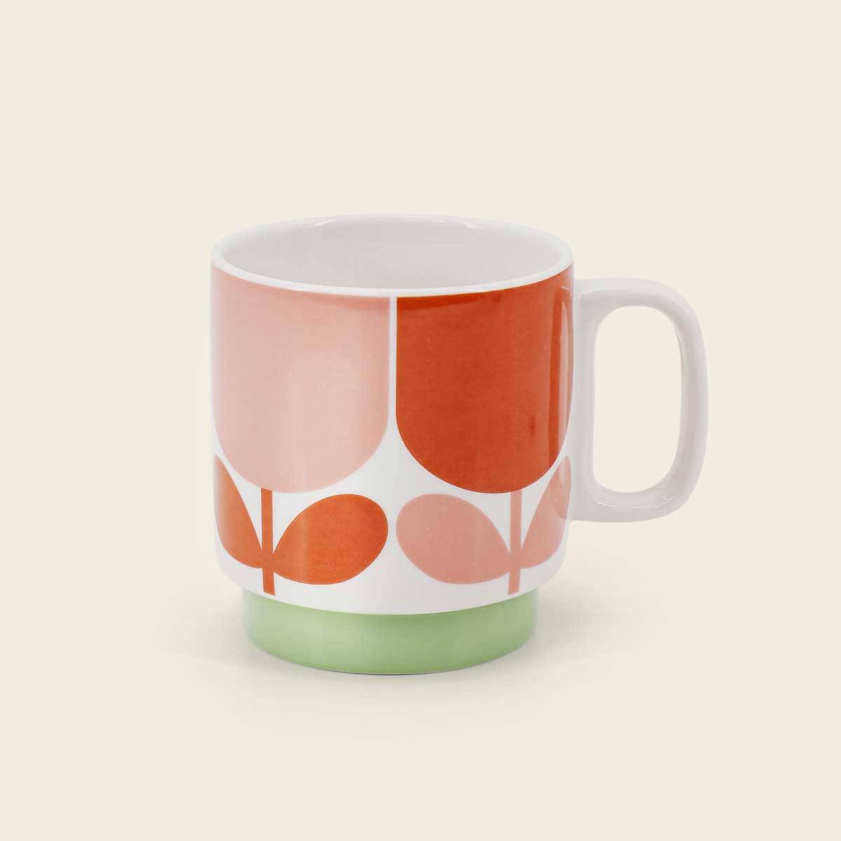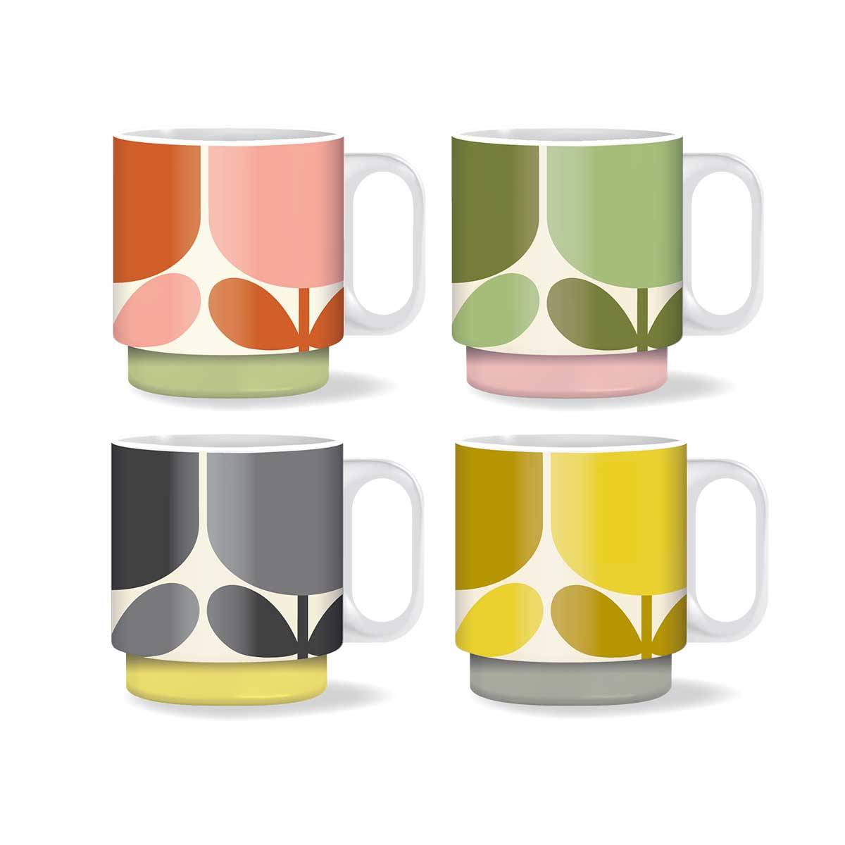 This set of four mugs has a unique 'Block Flower' print and is designed to be stacked. Each mug is stamped with an authentic Orla Kiely logo.