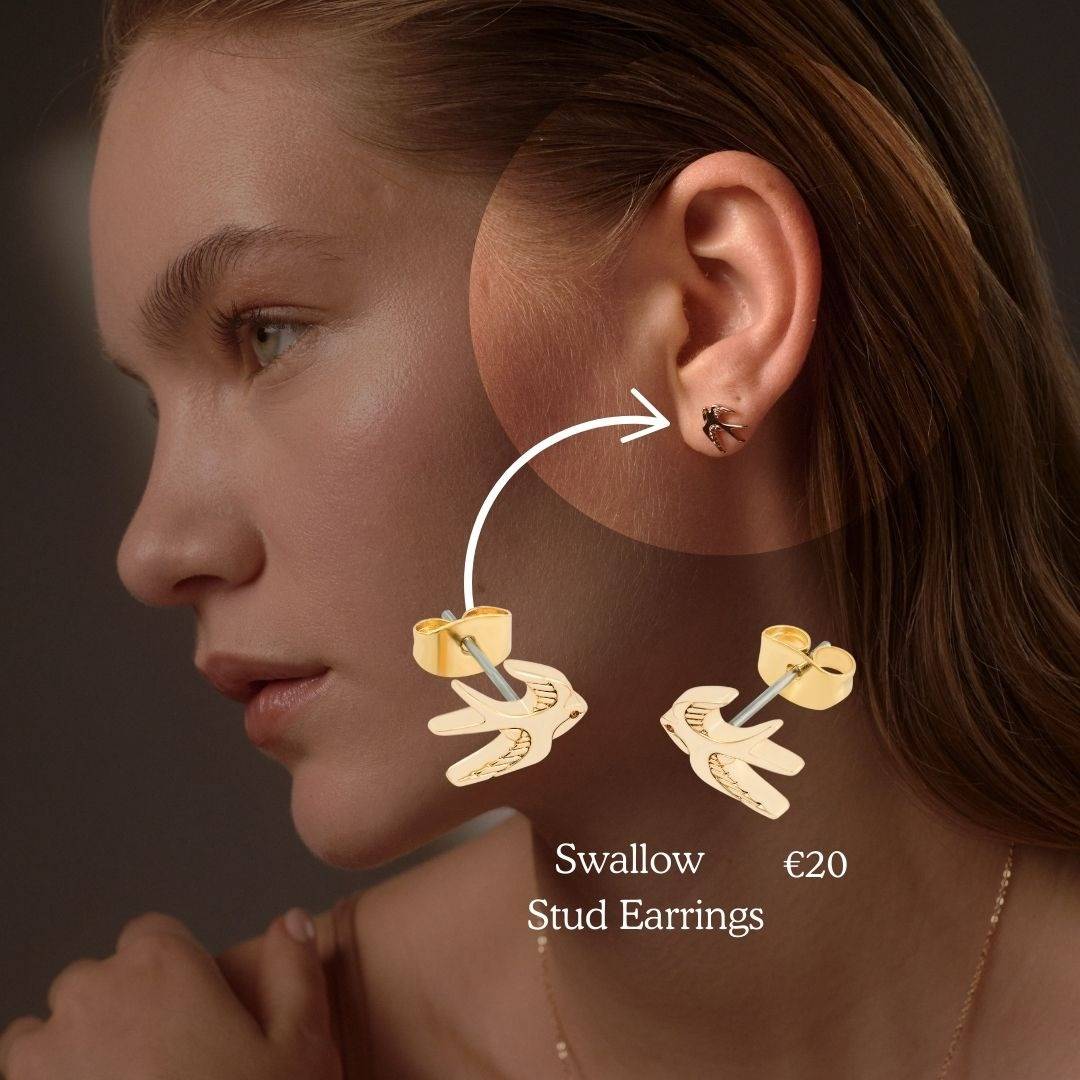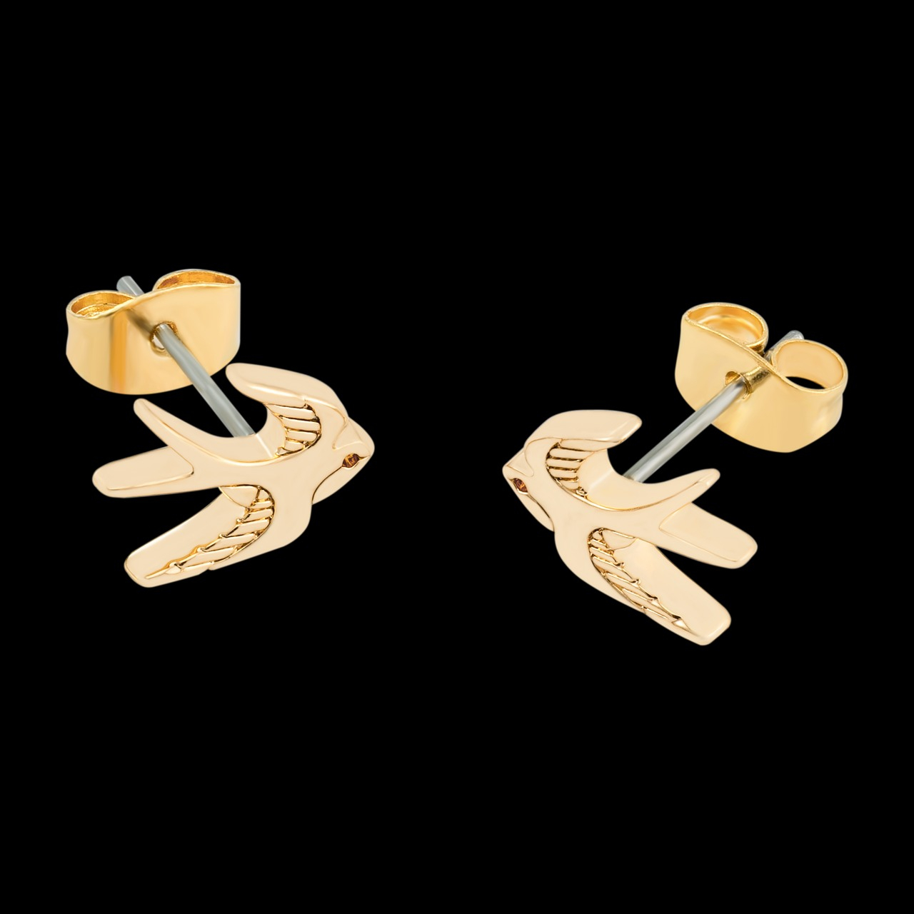 The Swallow Stud Earrings - Gold feature a delicate design of a swallow in mid-flight, symbolizing freedom and grace. These earrings add a subtle touch of elegance to any look.