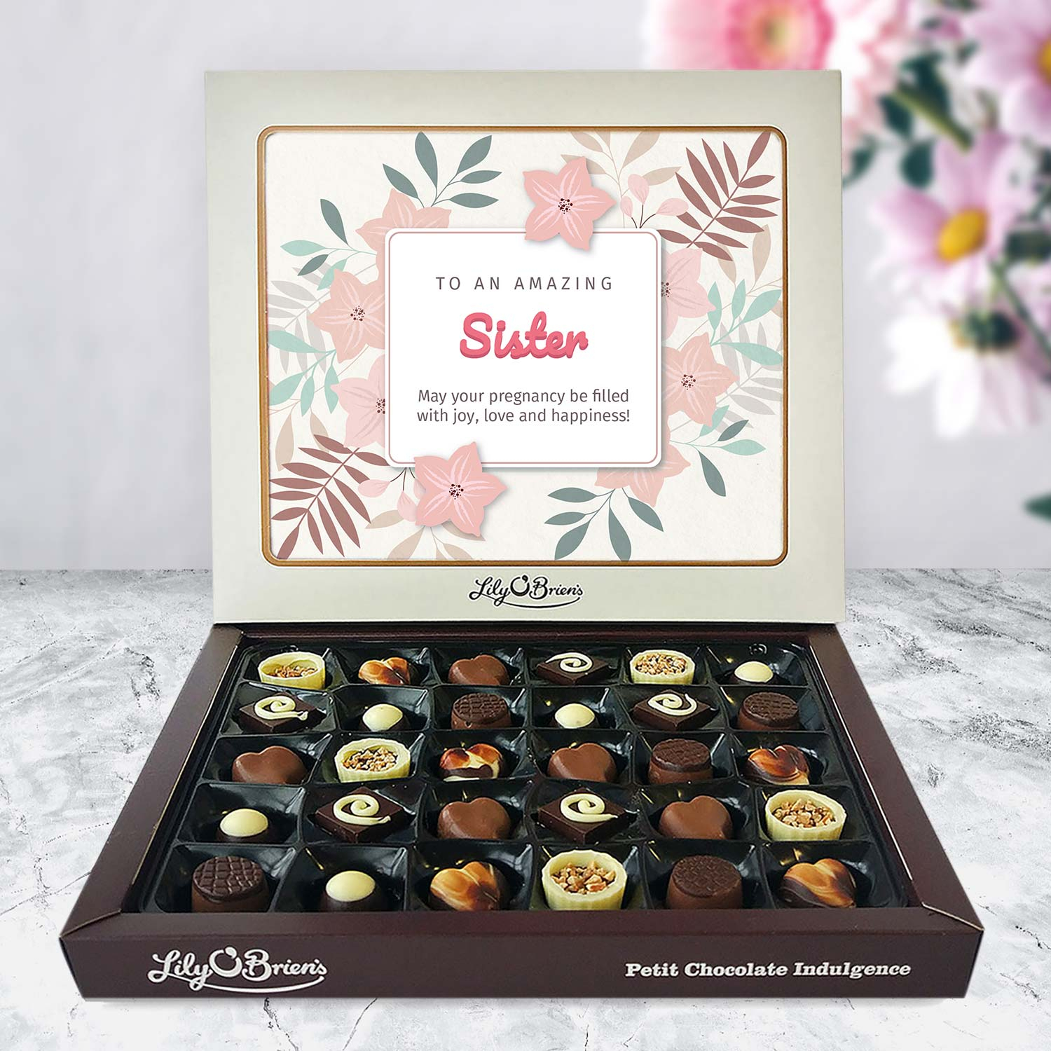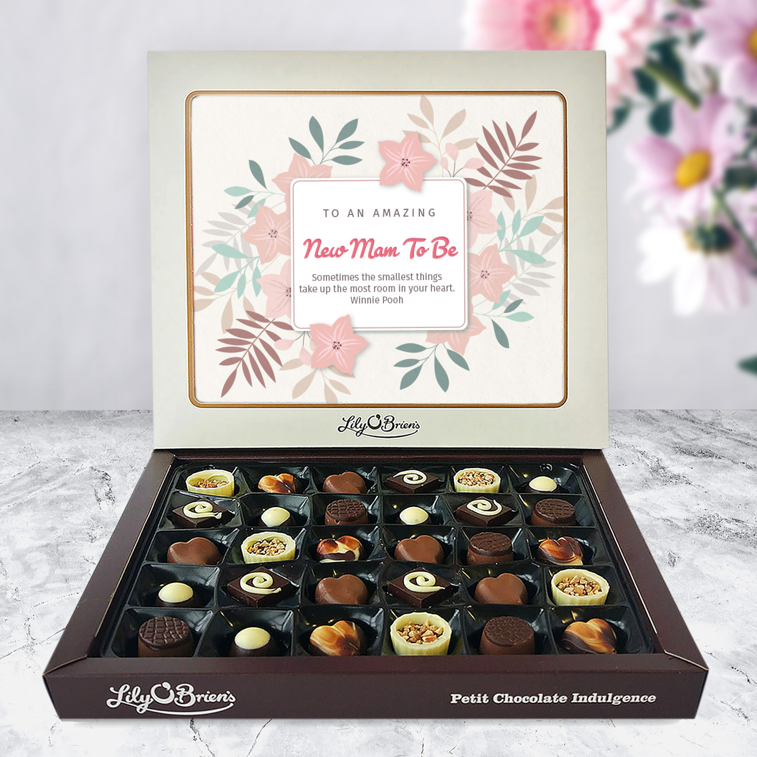 This Personalised Chocolate Box is filled with the Lily O'Brien's Luxury Chocolate collection. Approximate box dimensions: 290mm x 240mm x 40mm.