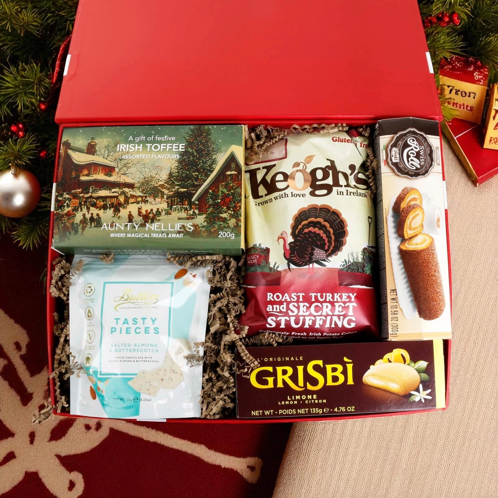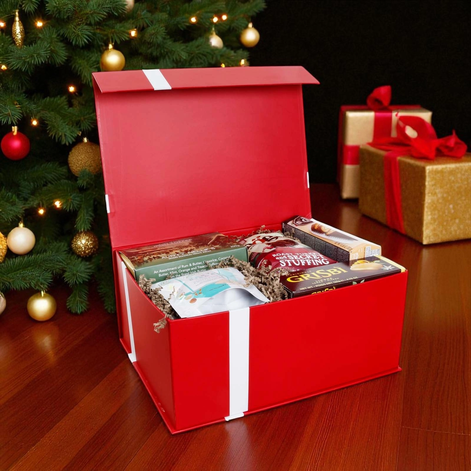 The hamper is presented in our new luxury red gift box with satin bow. Stylish and reusable, the gift box is packed inside a separate shipping box for secure transport.