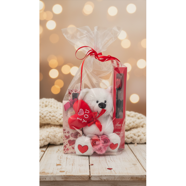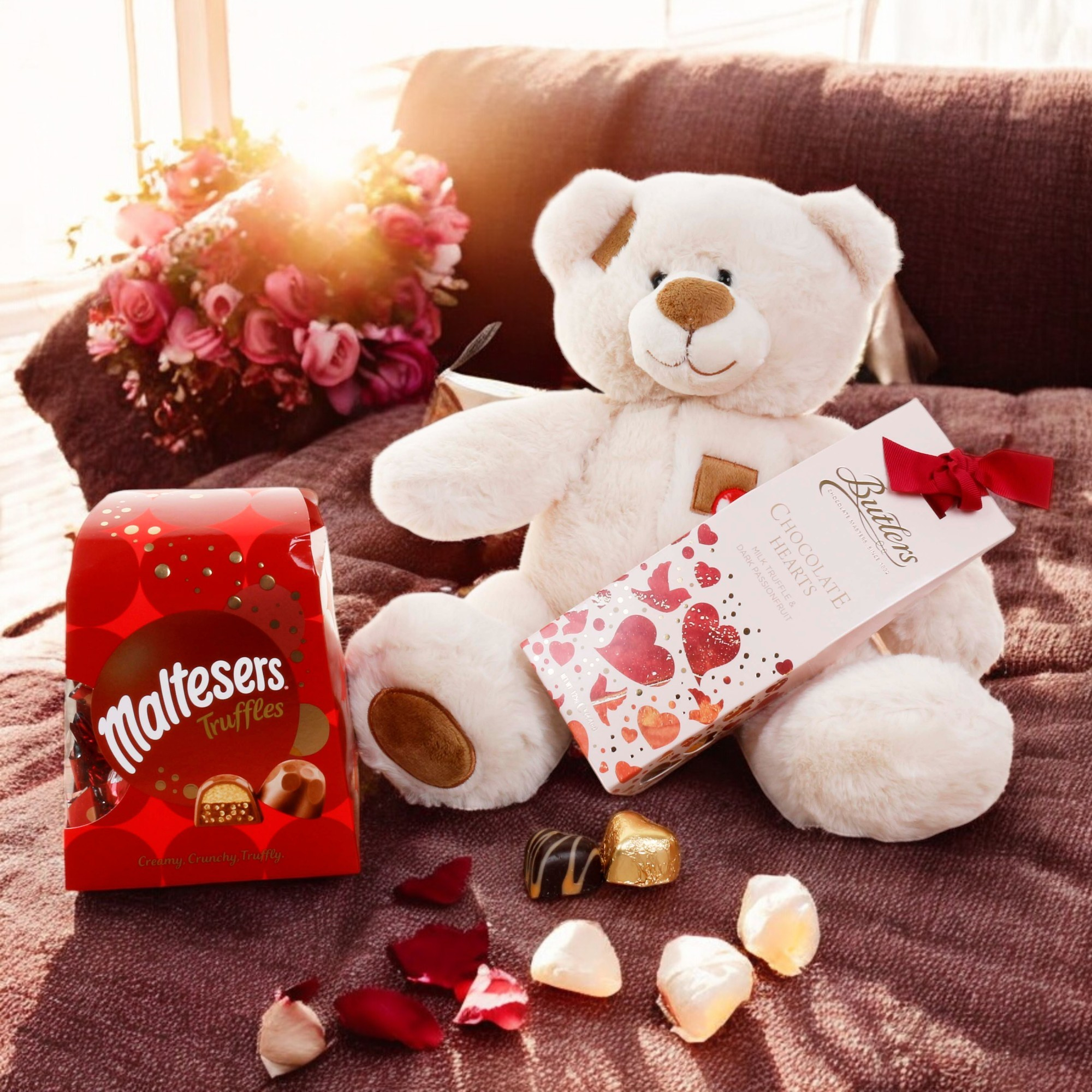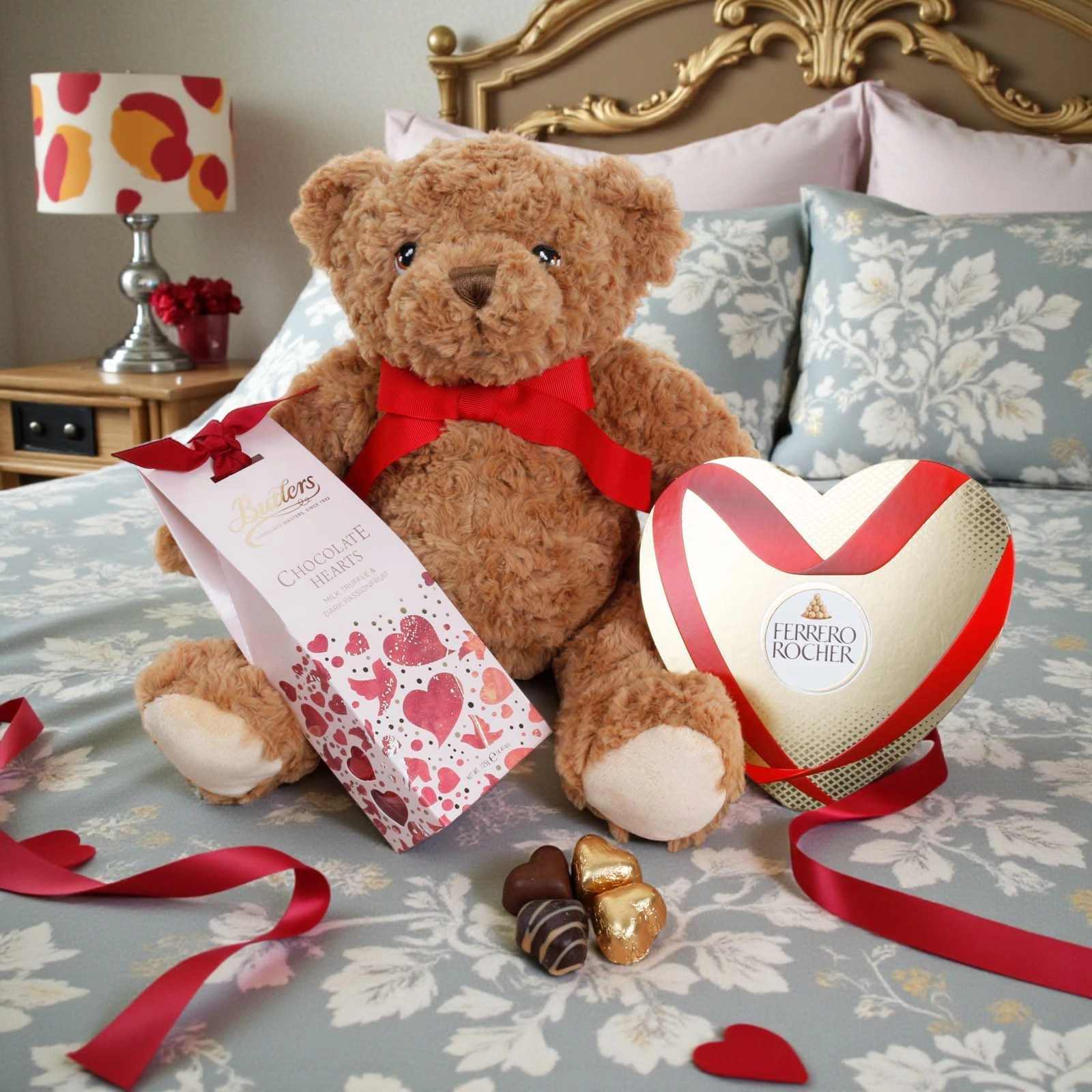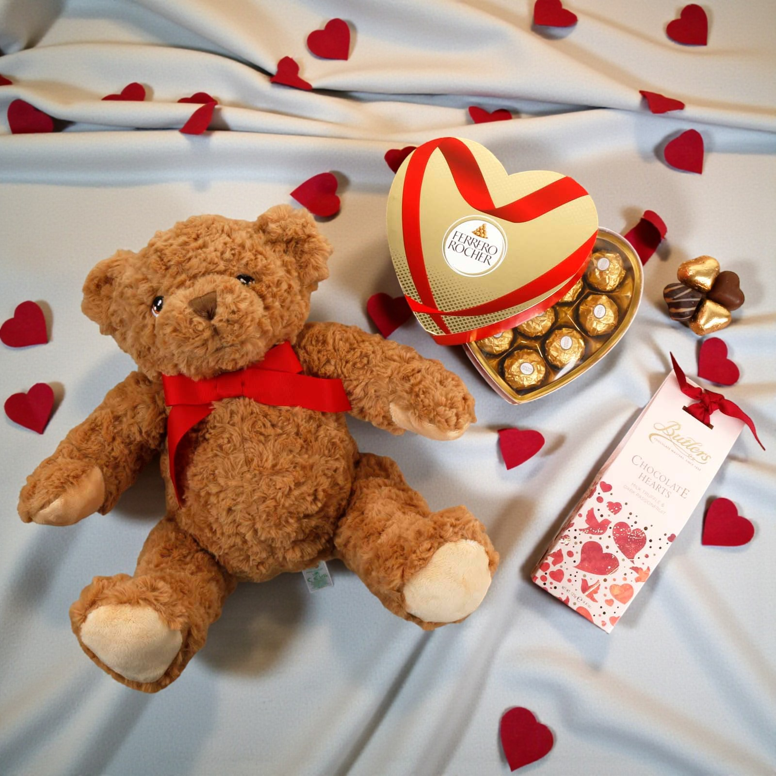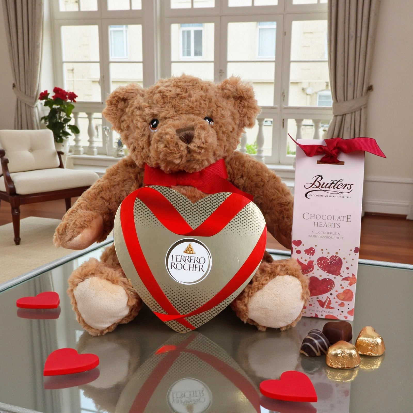 A heartwarming Valentine's surprise featuring an I Love You Teddy Bear, a luxurious box of Heart Shaped Butlers chocolate truffles, a delightful box of Butler's chocolate hearts, a chocolate rose and a heart shaped rose soaps.