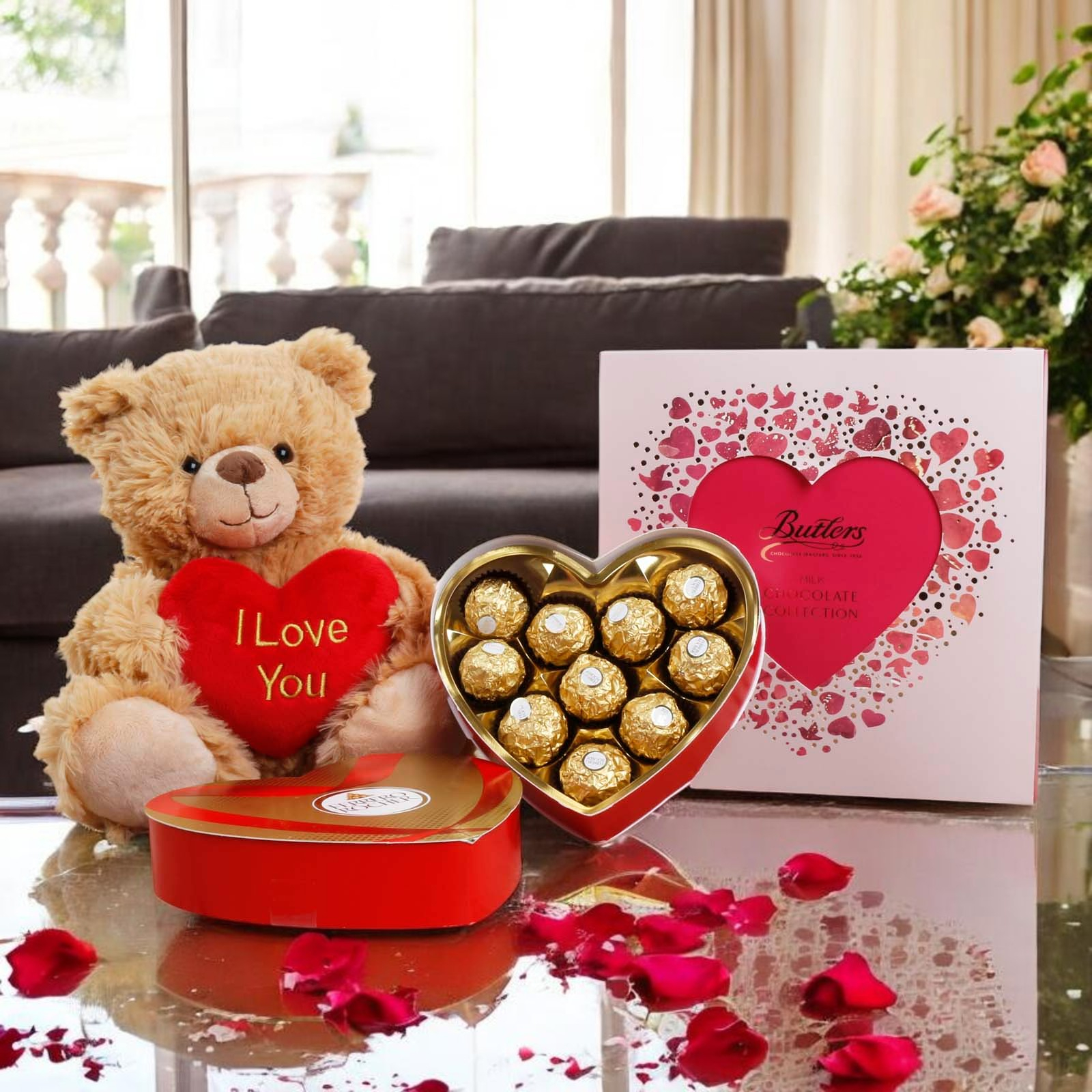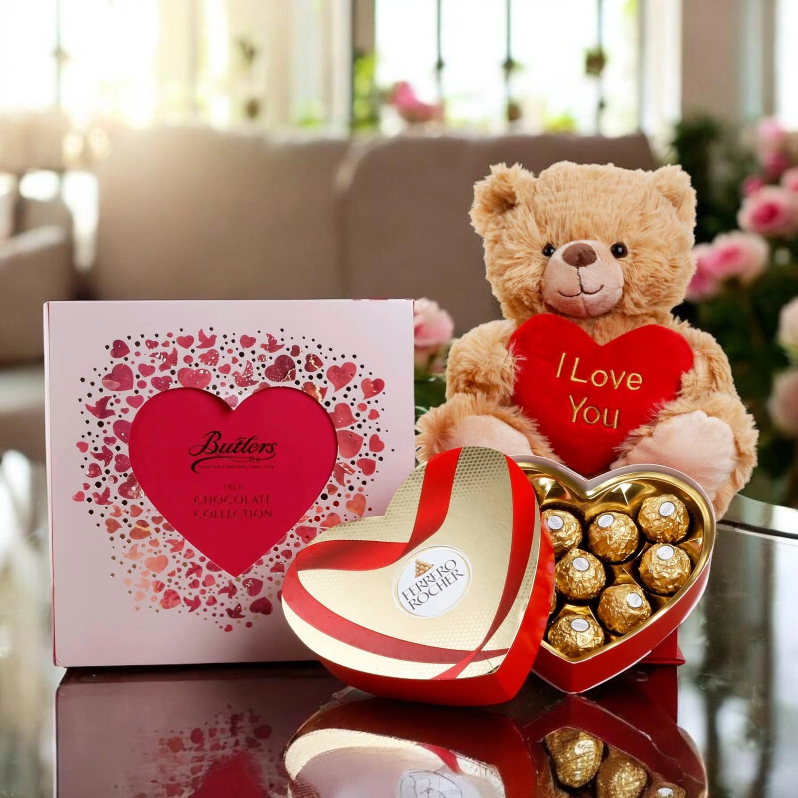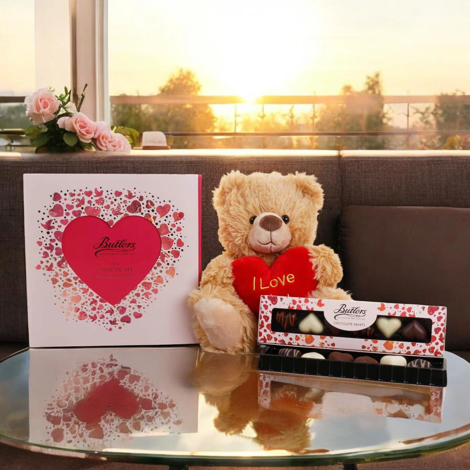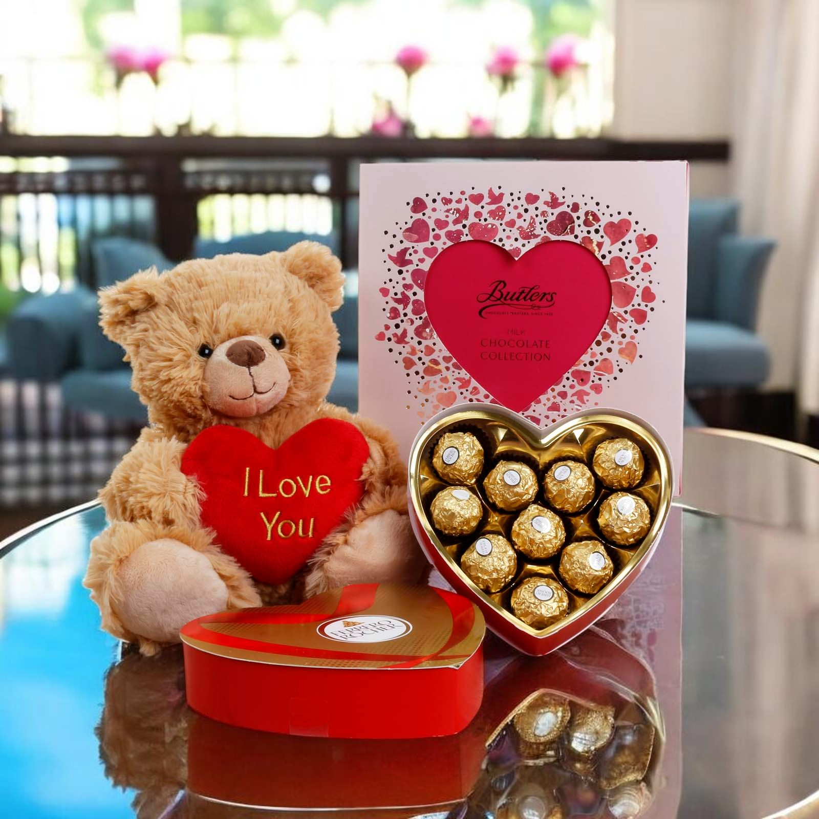 A heartwarming Valentine's surprise featuring an I Love You Teddy Bear, a luxurious box of Heart Shaped Butlers chocolate truffles, a delightful box of Butler's chocolate hearts, a chocolate rose and a heart shaped rose soaps.