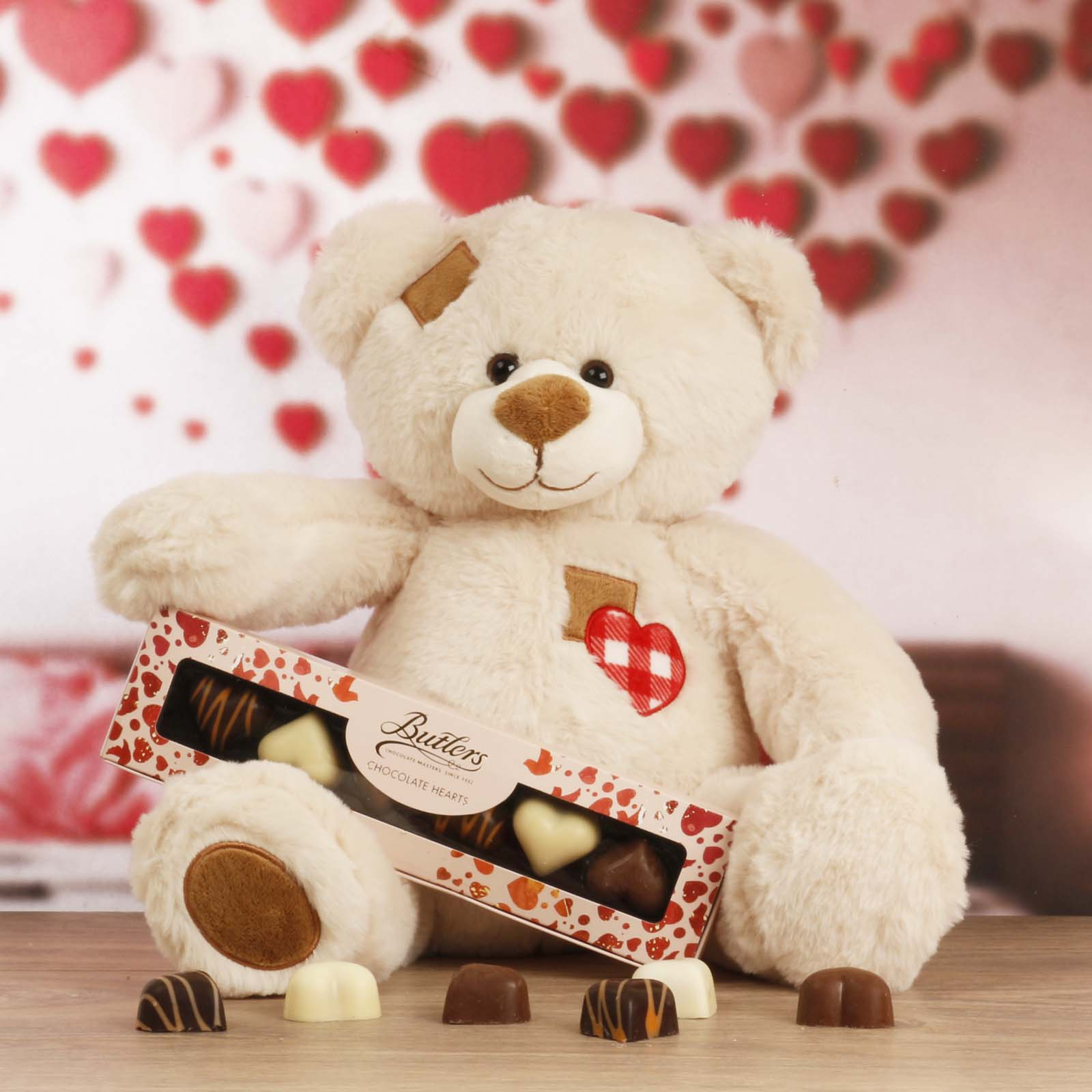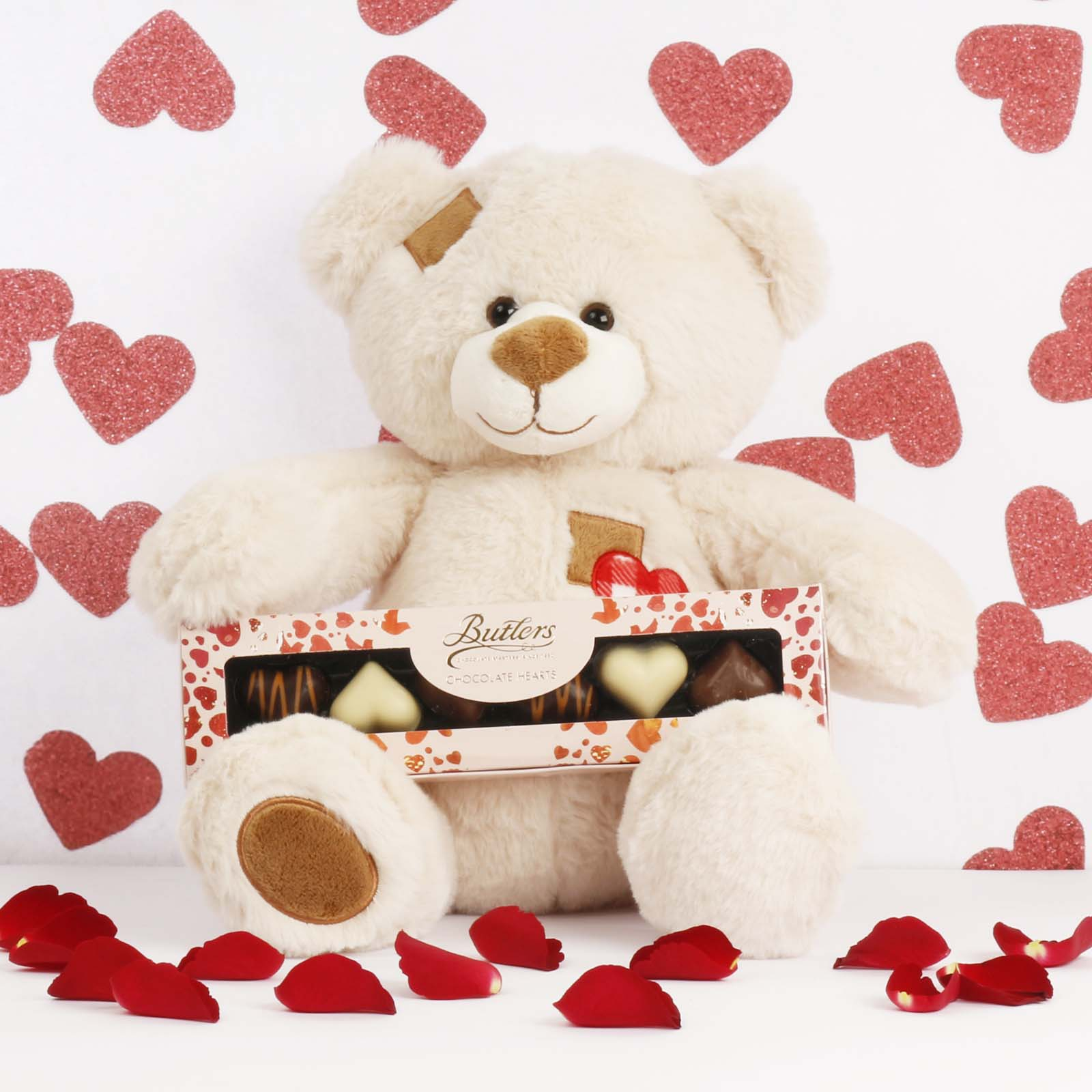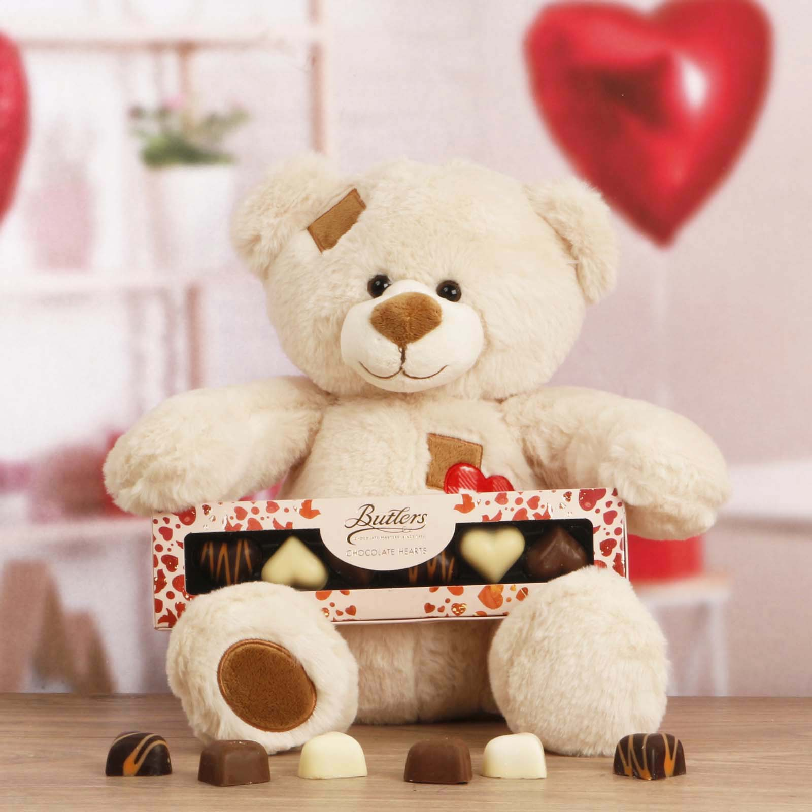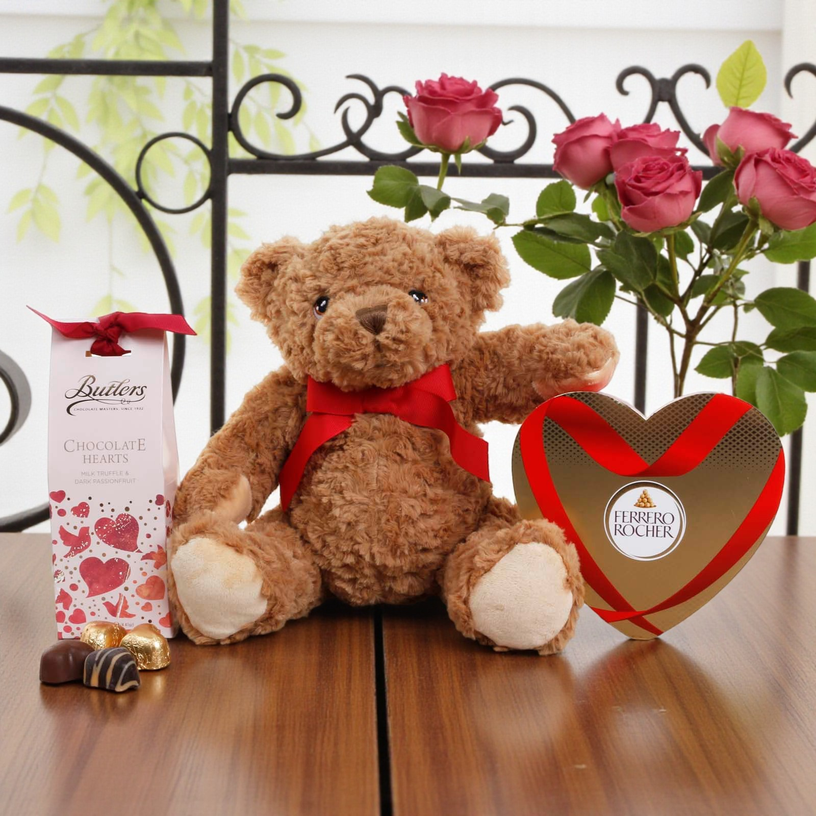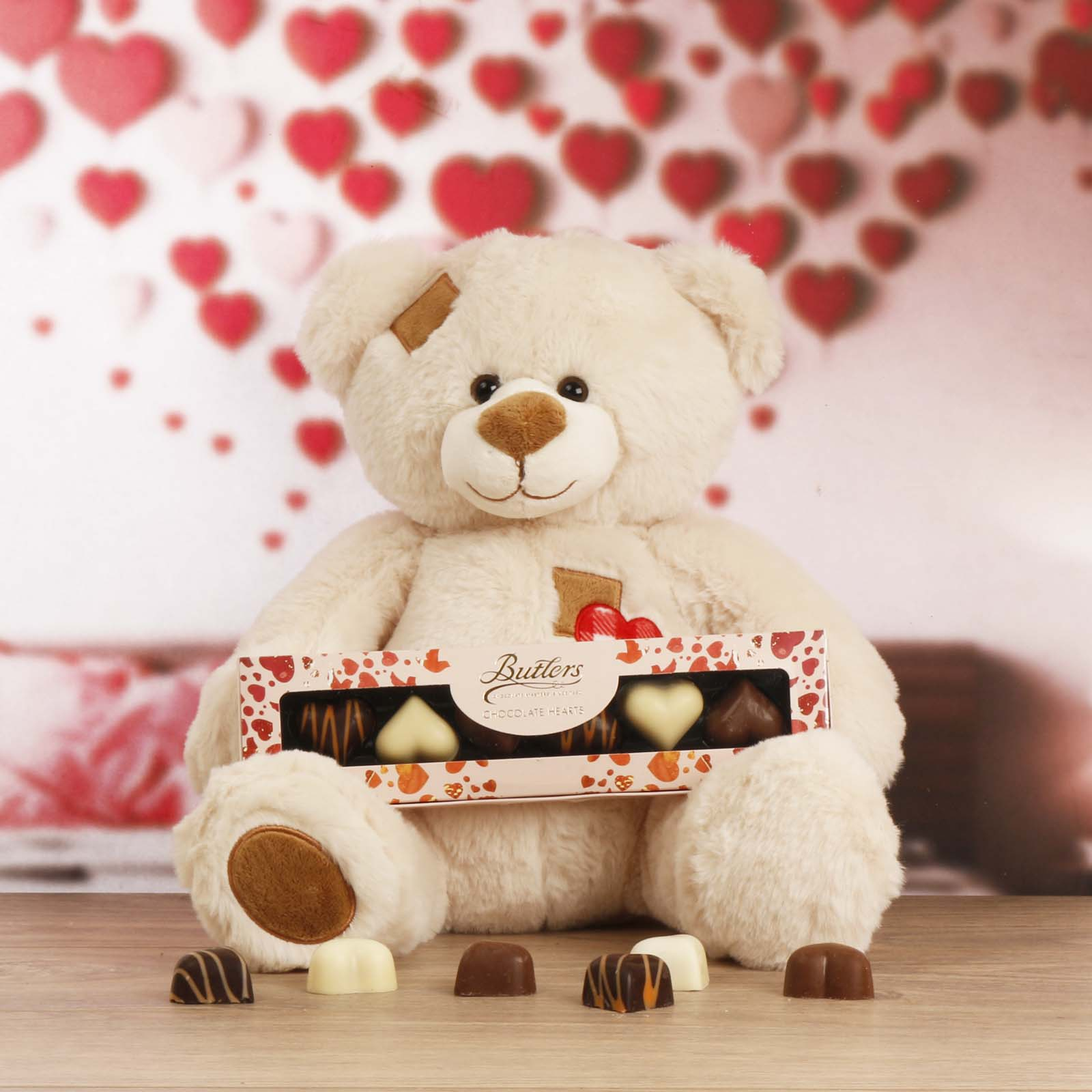 A heartwarming Valentine's surprise featuring an I Love You Teddy Bear, a luxurious box of Heart Shaped Butlers chocolate truffles, a delightful box of Butler's chocolate hearts, a chocolate rose and a heart shaped rose soaps.