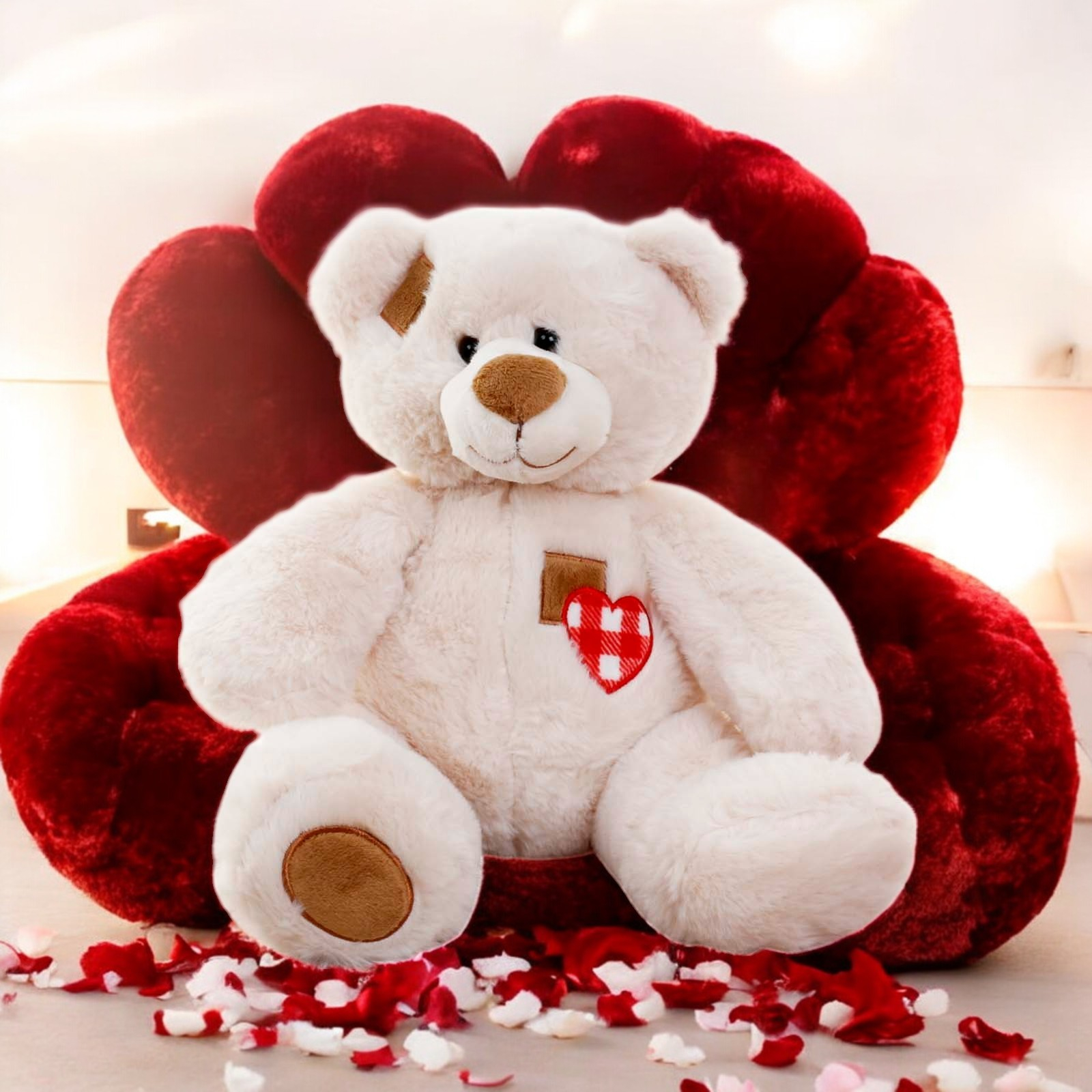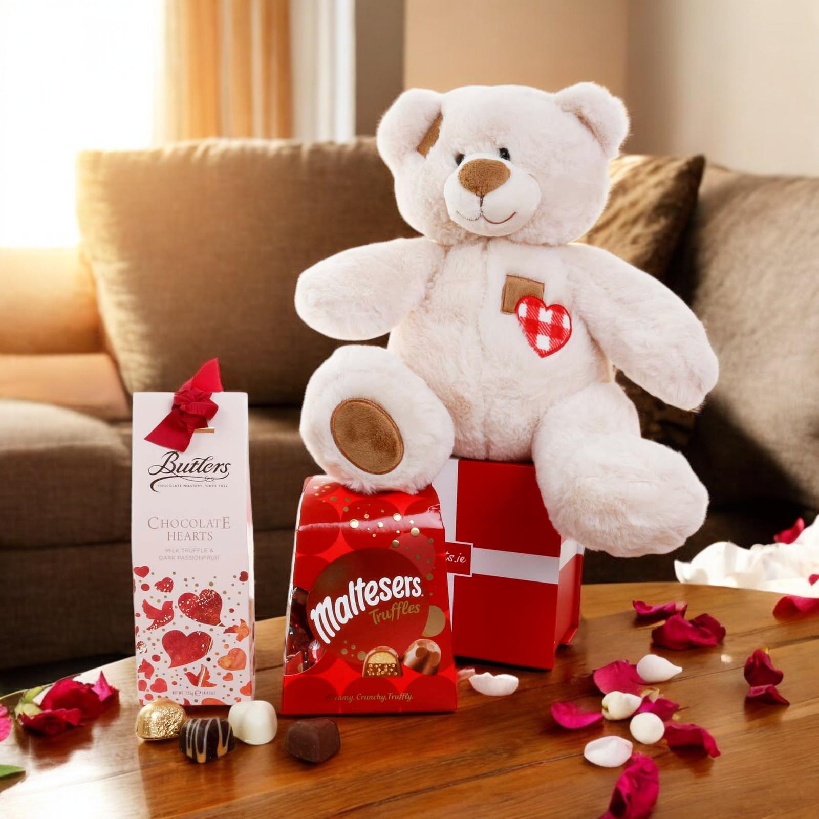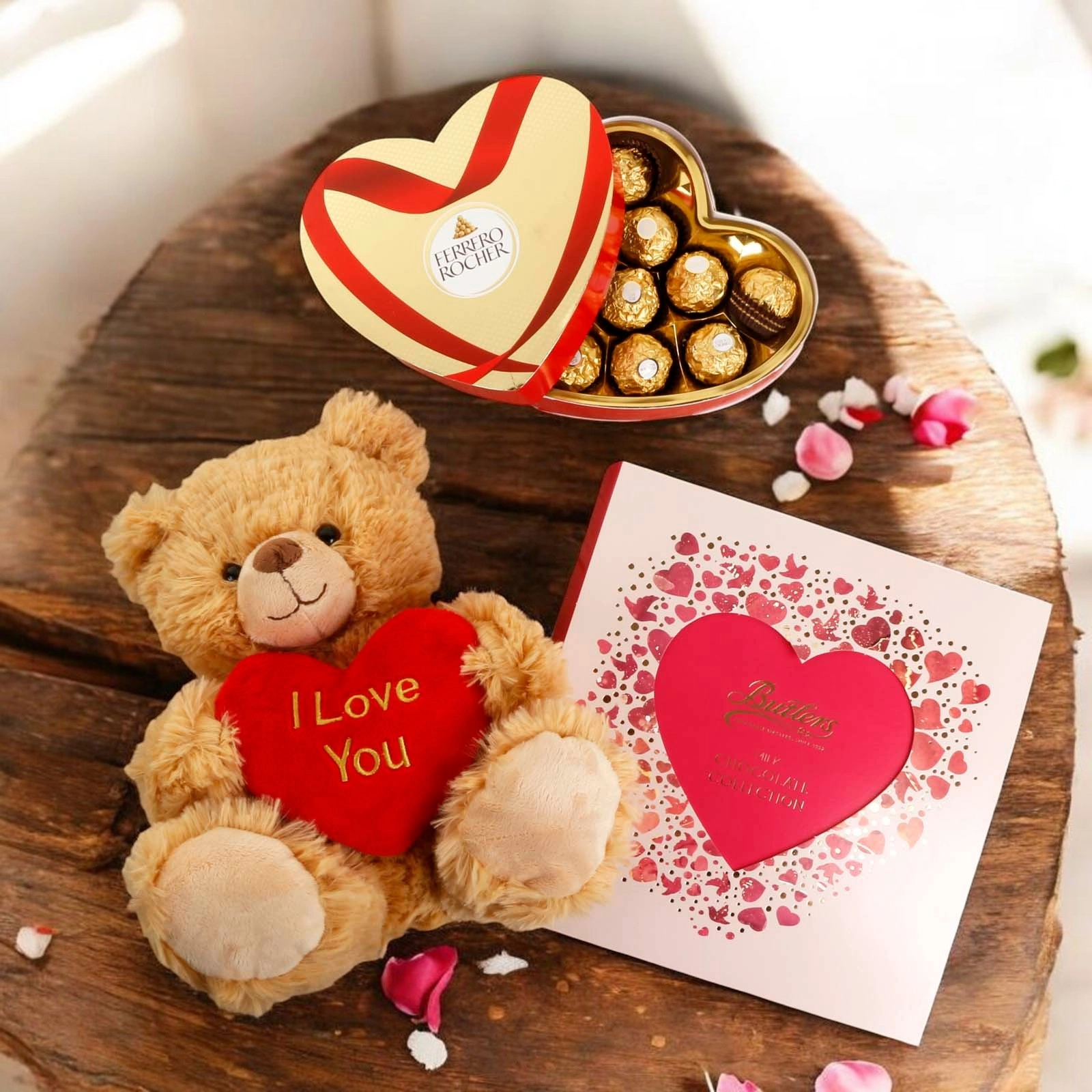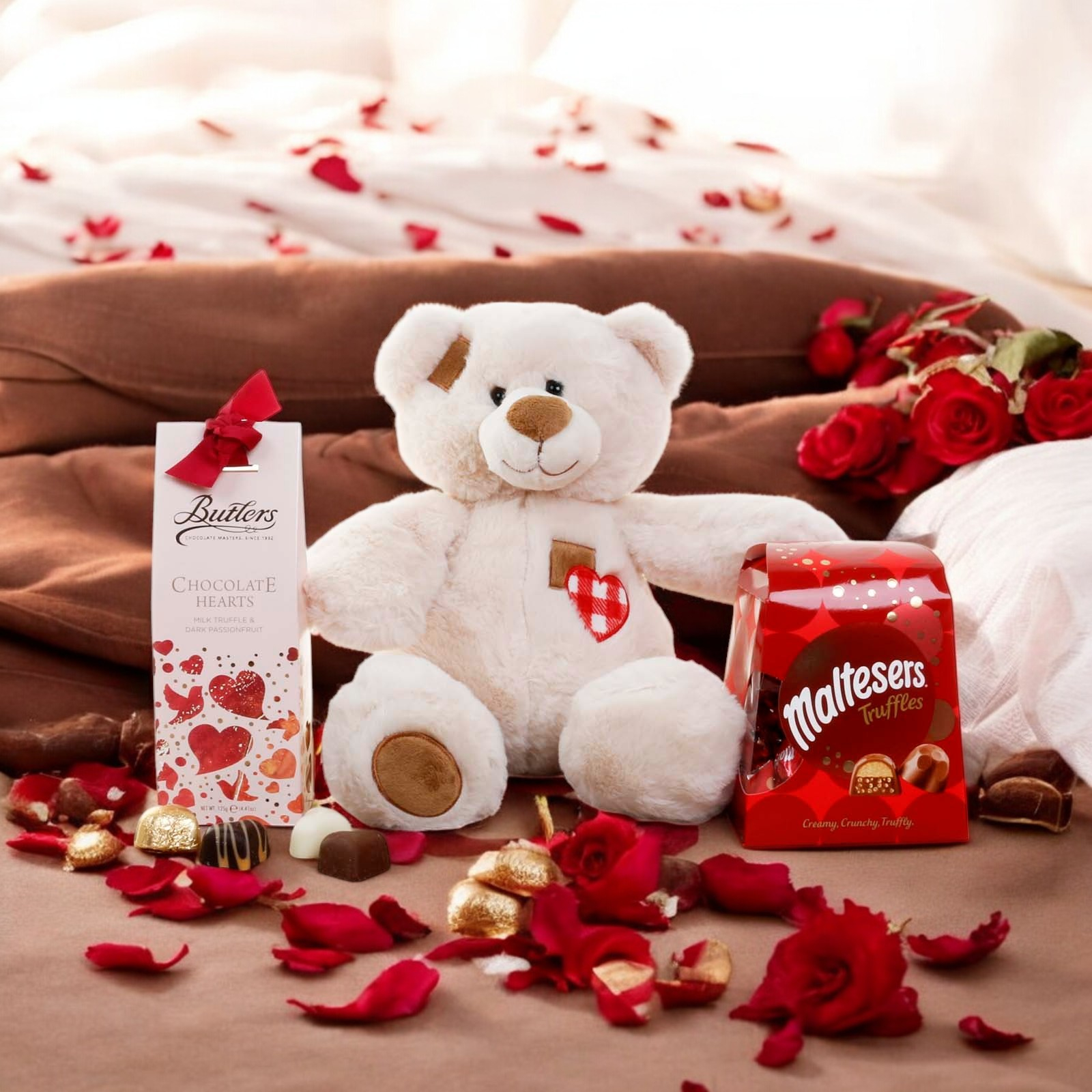 A heartwarming Valentine's surprise featuring an I Love You Teddy Bear, a luxurious box of Heart Shaped Butlers chocolate truffles, a delightful box of Butler's chocolate hearts, a chocolate rose and a heart shaped rose soaps.