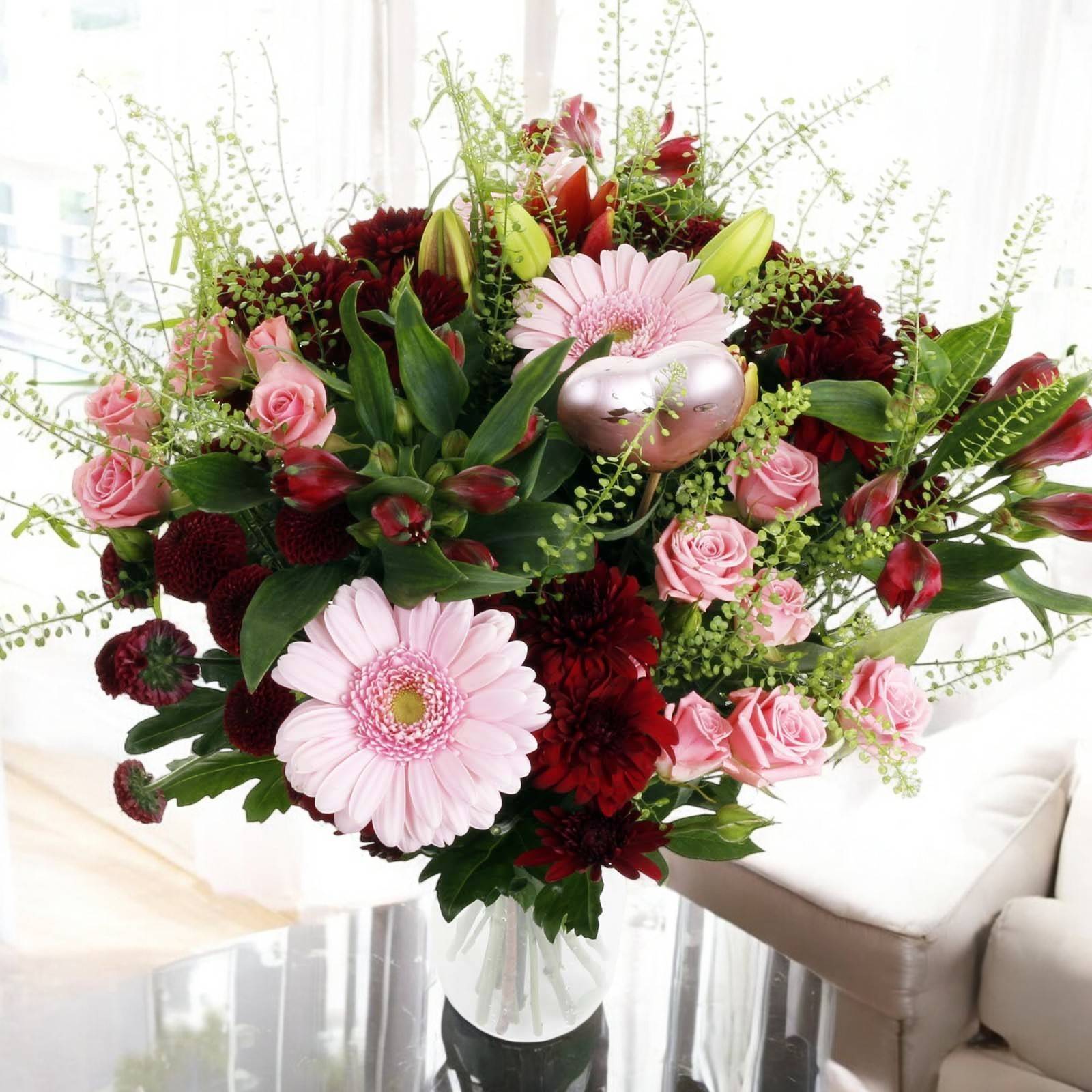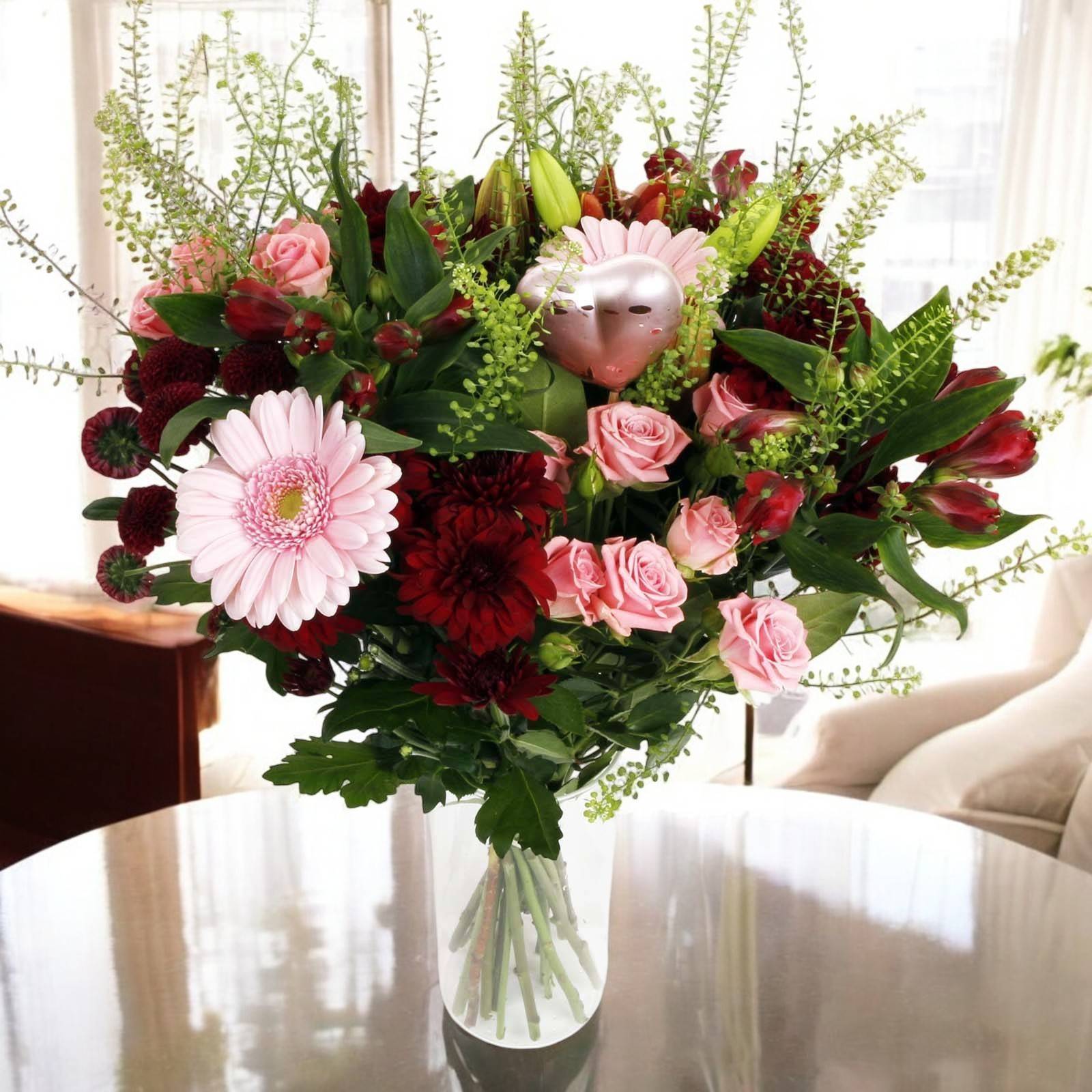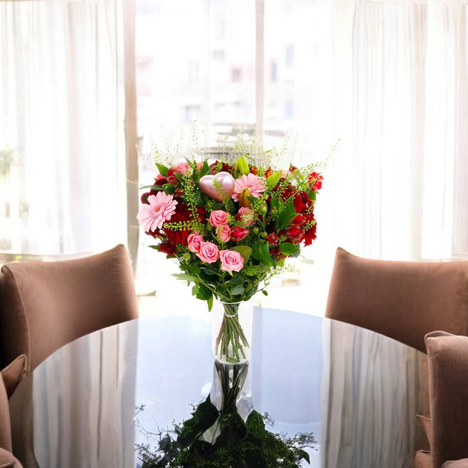 This exquisite bouquet of pink roses, red chrysanthemums, pink Germinis and more will be truly appreciated and adored by anyone this Valentine's Day.